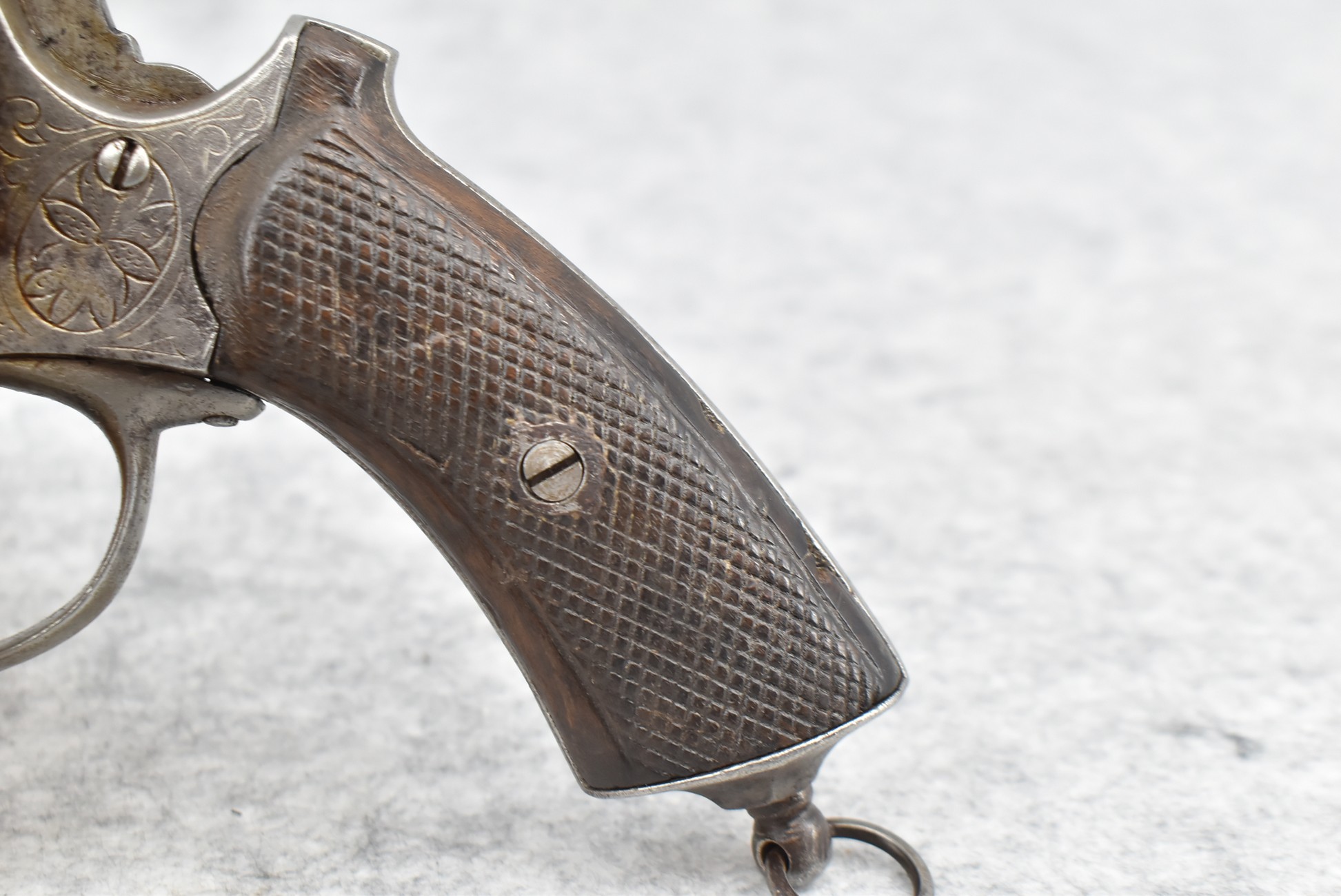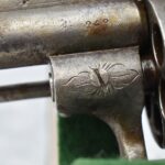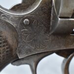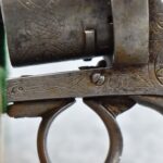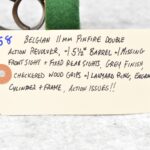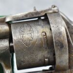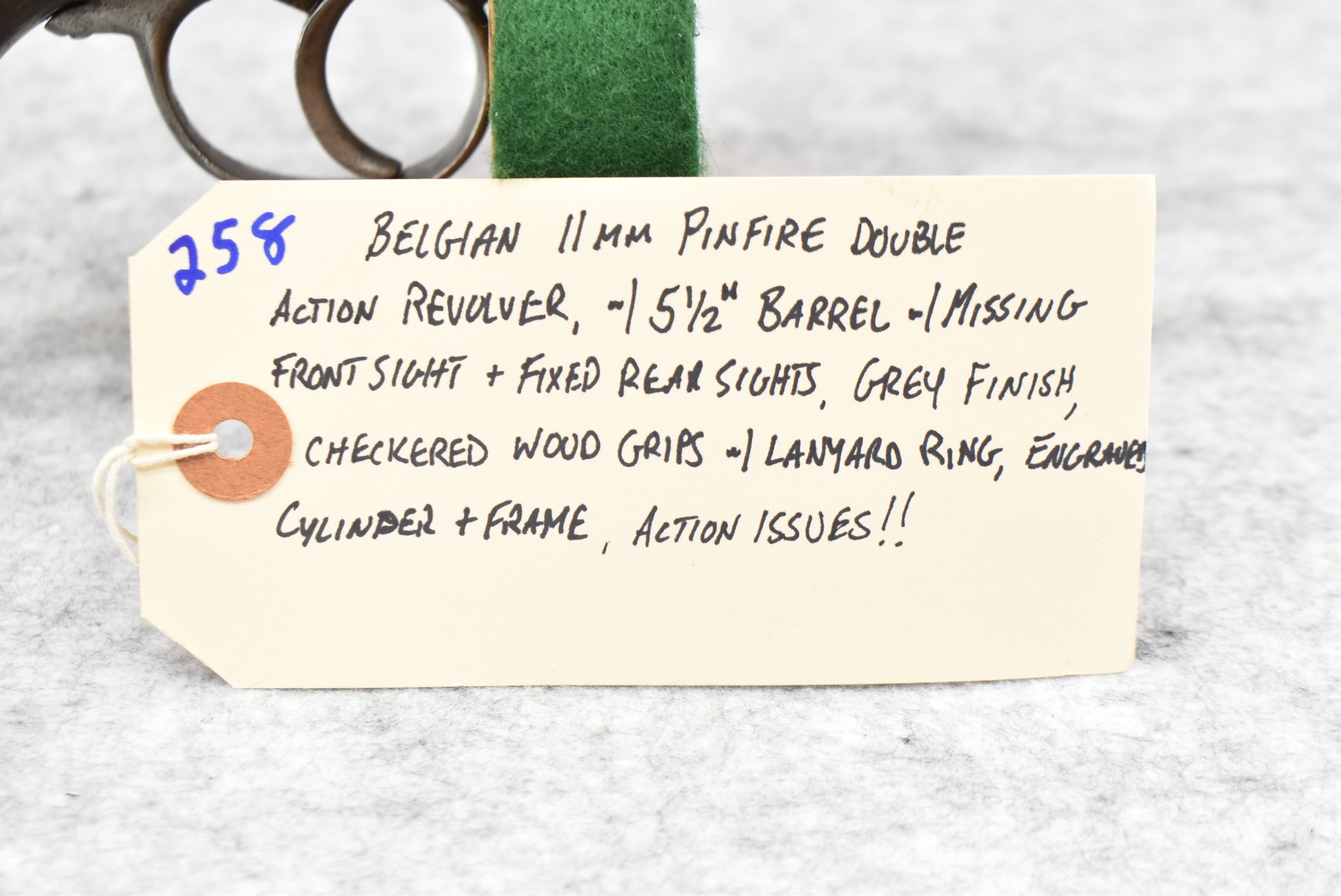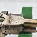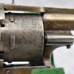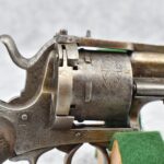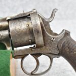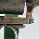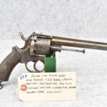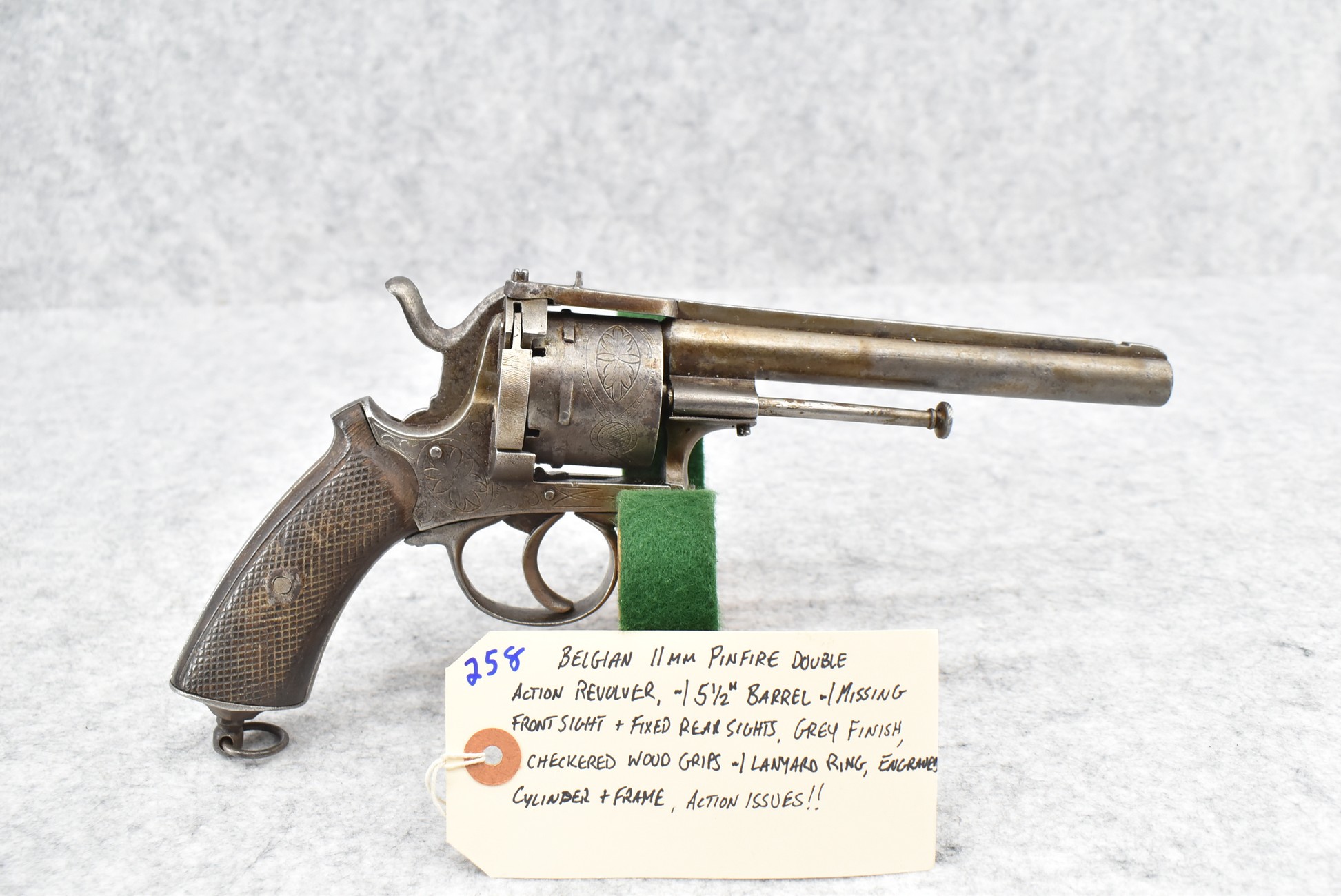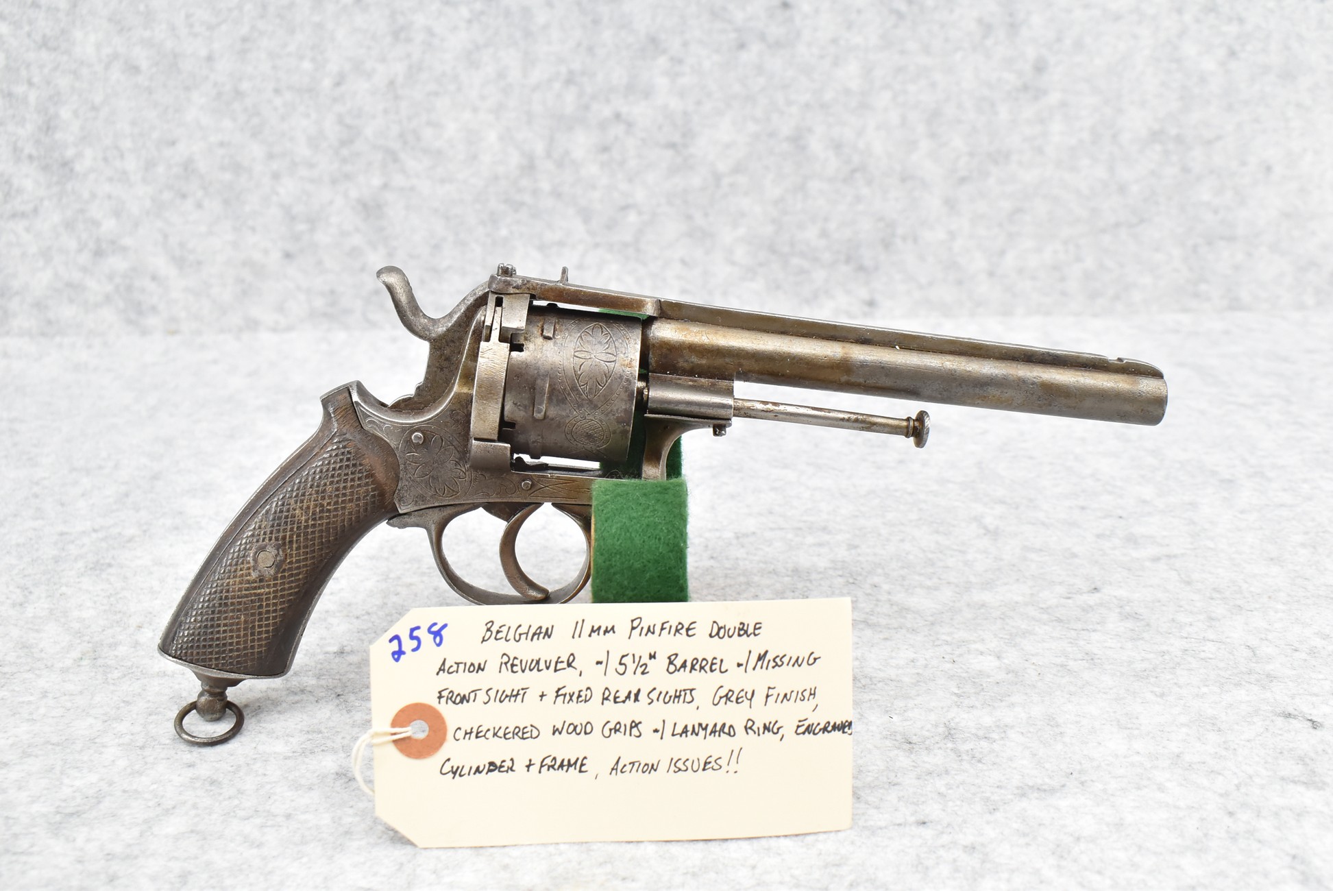 258. Belgian – 11mm Pinfire Cal. Double Action Revolver – w/5 ½” Barrel (Missing Front Sight) w/Fixed Rear Sights – Gray Finish – w/Engraved Cylinder & Frame – w/Checkered Wood Grips w/Lanyard Ring – Note: Action Issues!!