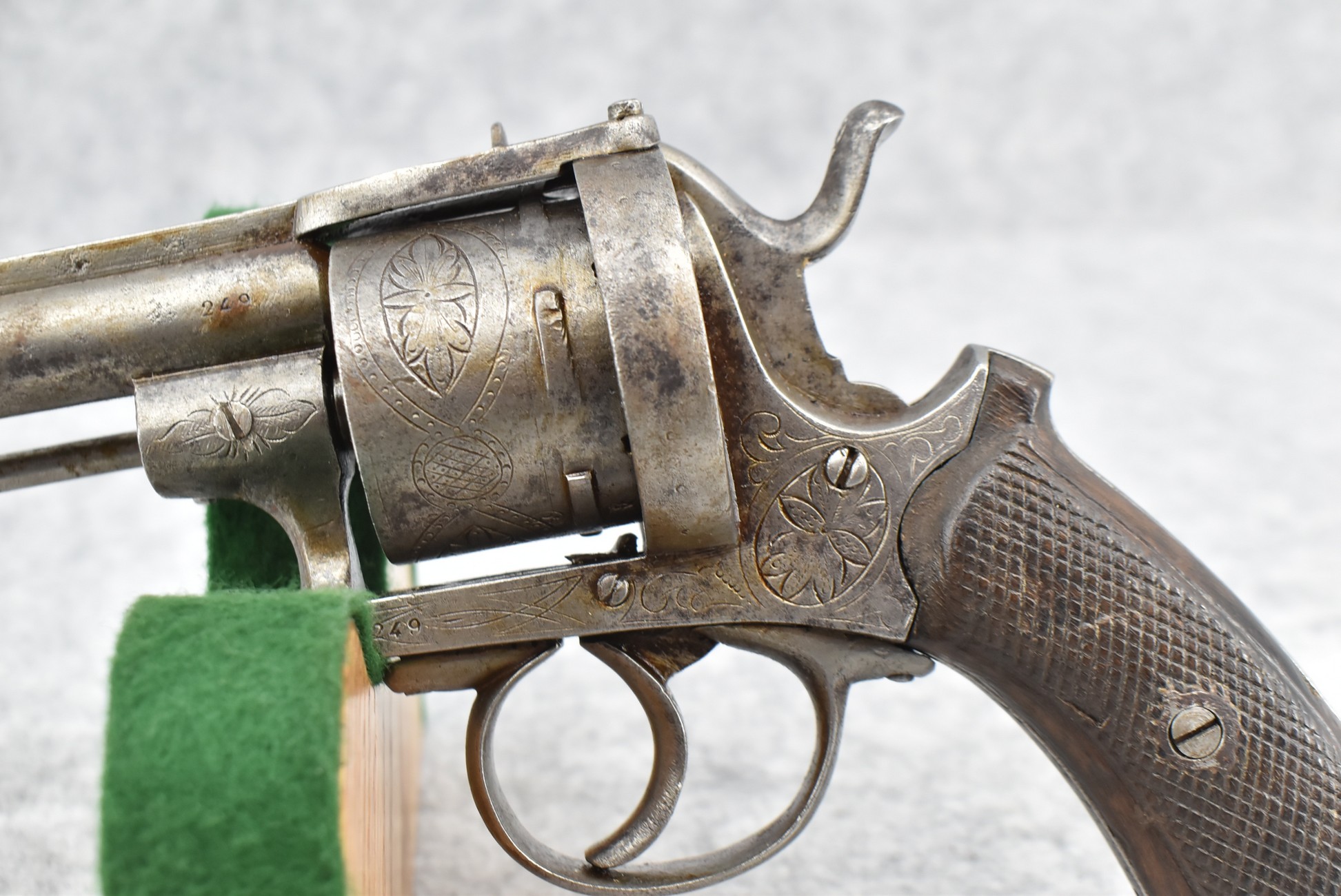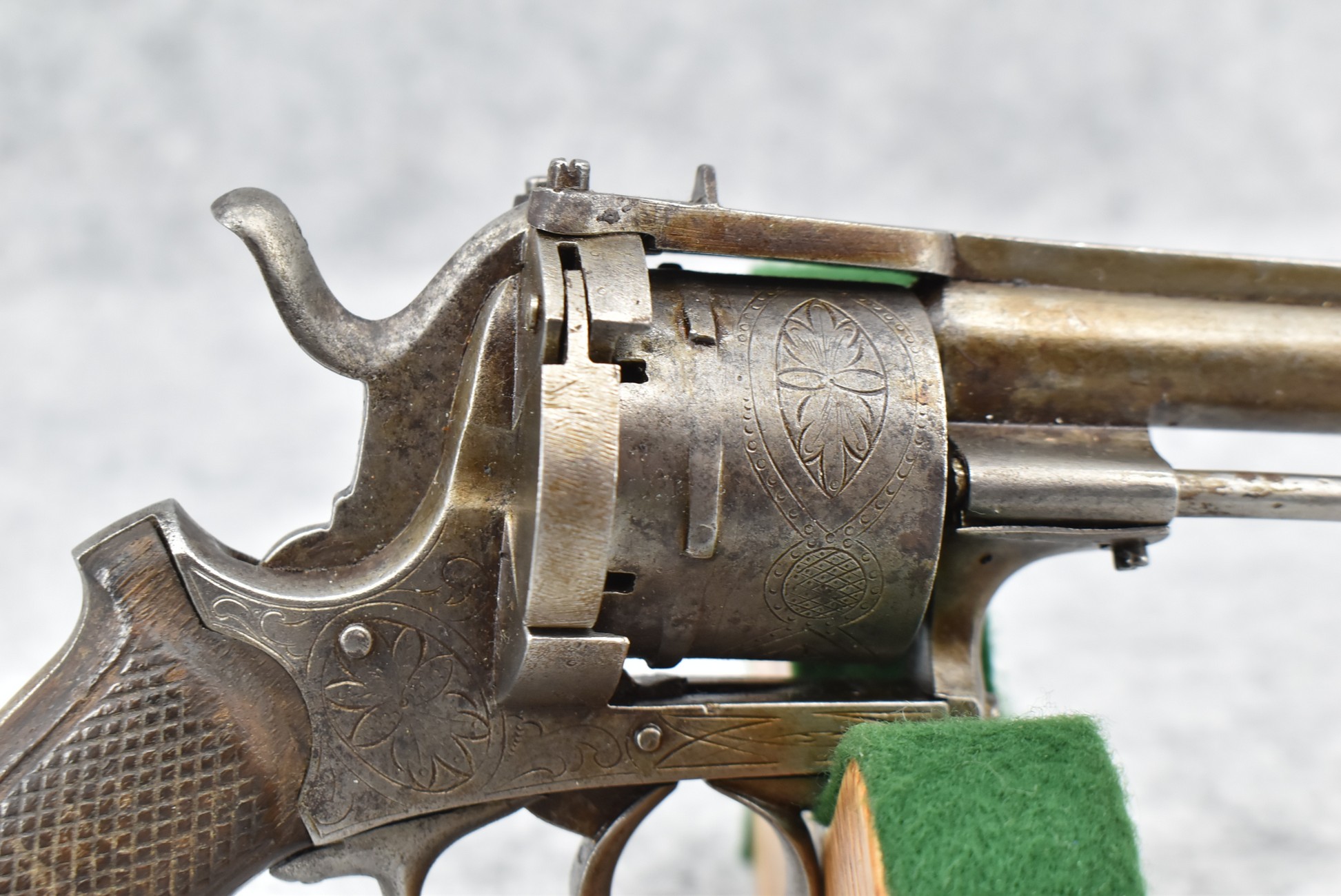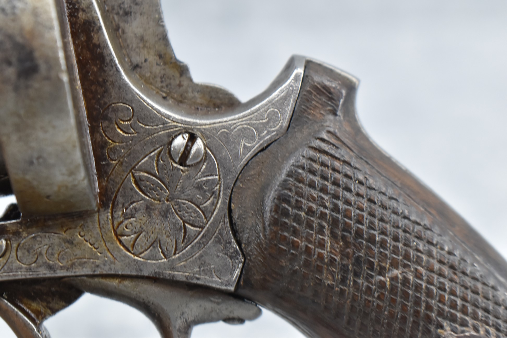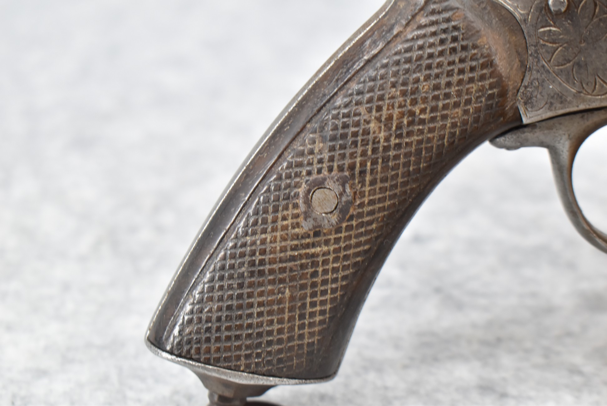 258. Belgian – 11mm Pinfire Cal. Double Action Revolver – w/5 ½” Barrel (Missing Front Sight) w/Fixed Rear Sights – Gray Finish – w/Engraved Cylinder & Frame – w/Checkered Wood Grips w/Lanyard Ring – Note: Action Issues!!