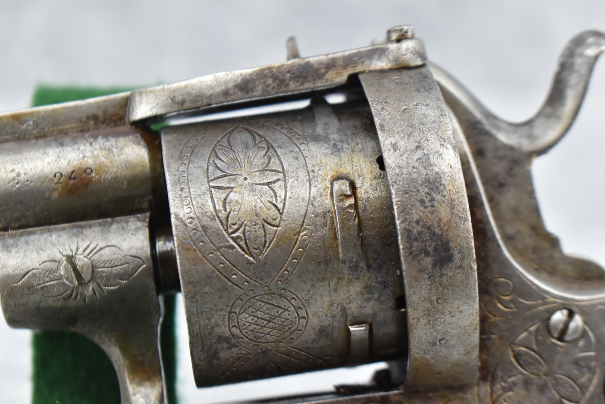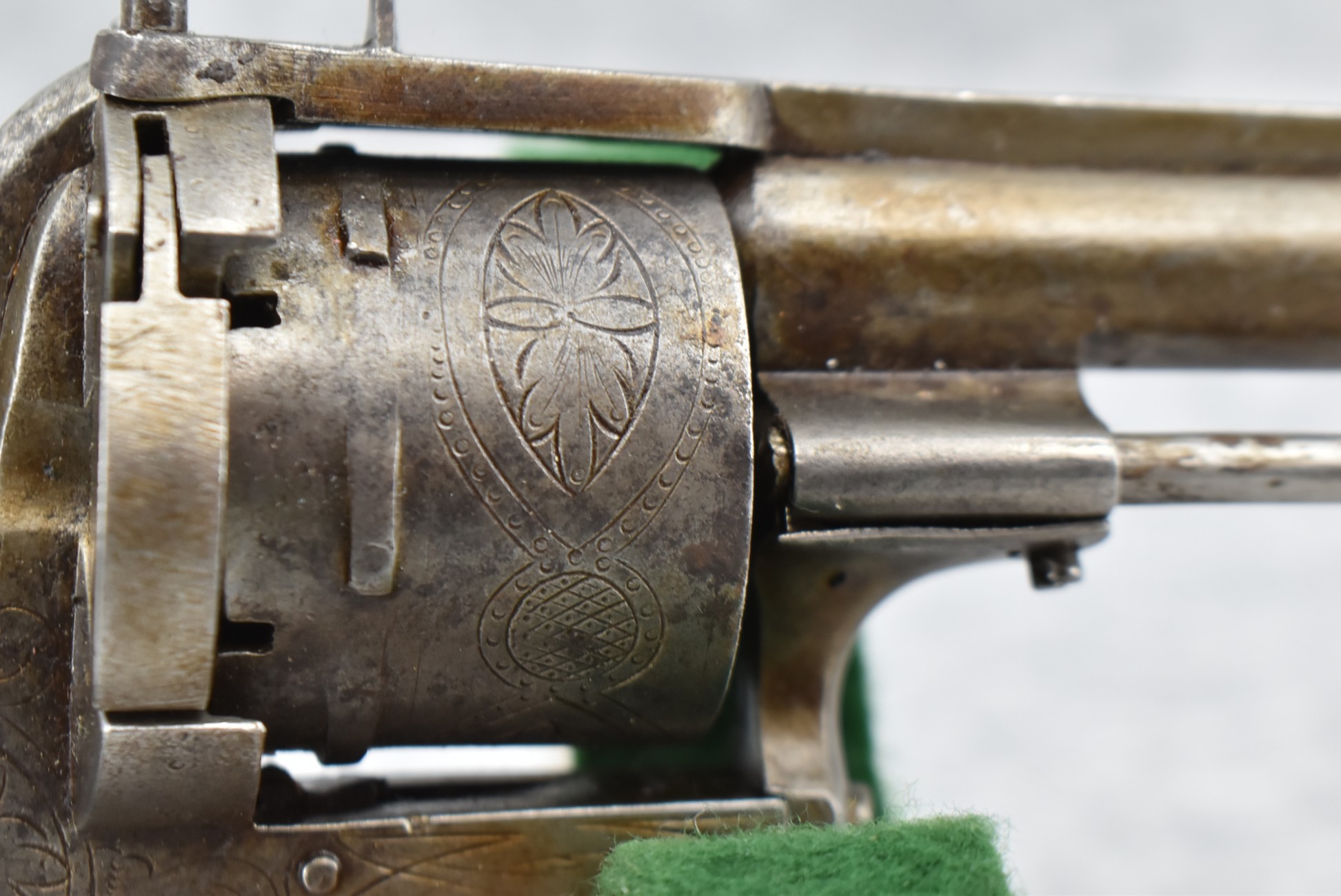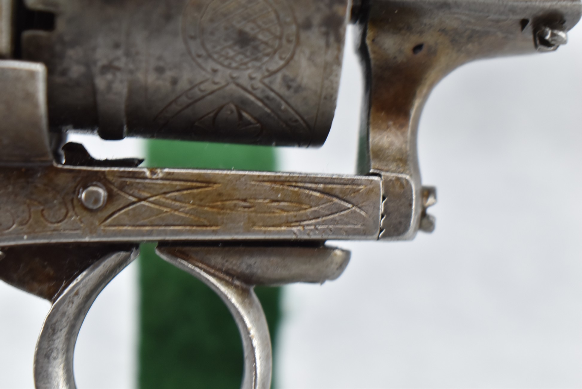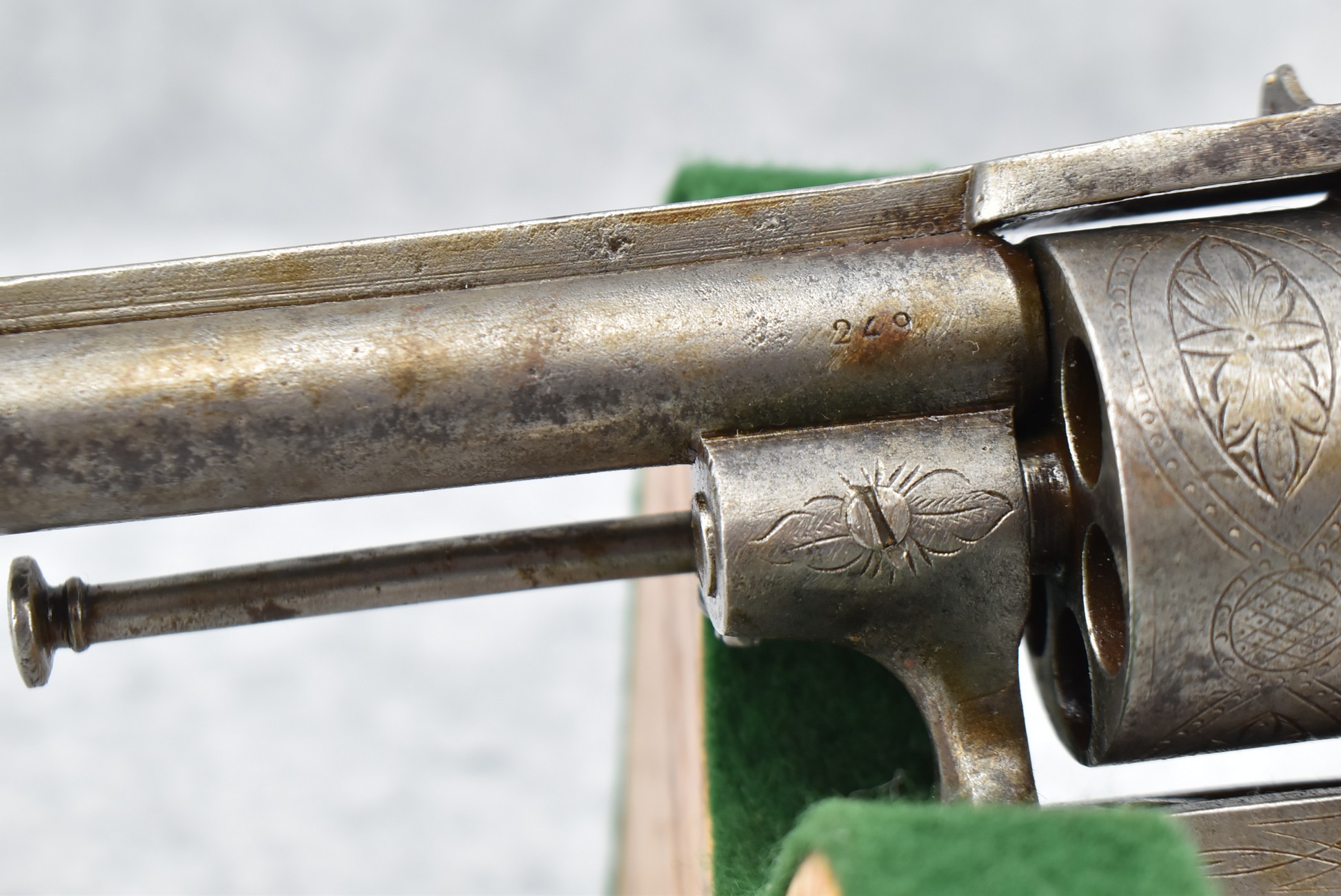 258. Belgian – 11mm Pinfire Cal. Double Action Revolver – w/5 ½” Barrel (Missing Front Sight) w/Fixed Rear Sights – Gray Finish – w/Engraved Cylinder & Frame – w/Checkered Wood Grips w/Lanyard Ring – Note: Action Issues!!
