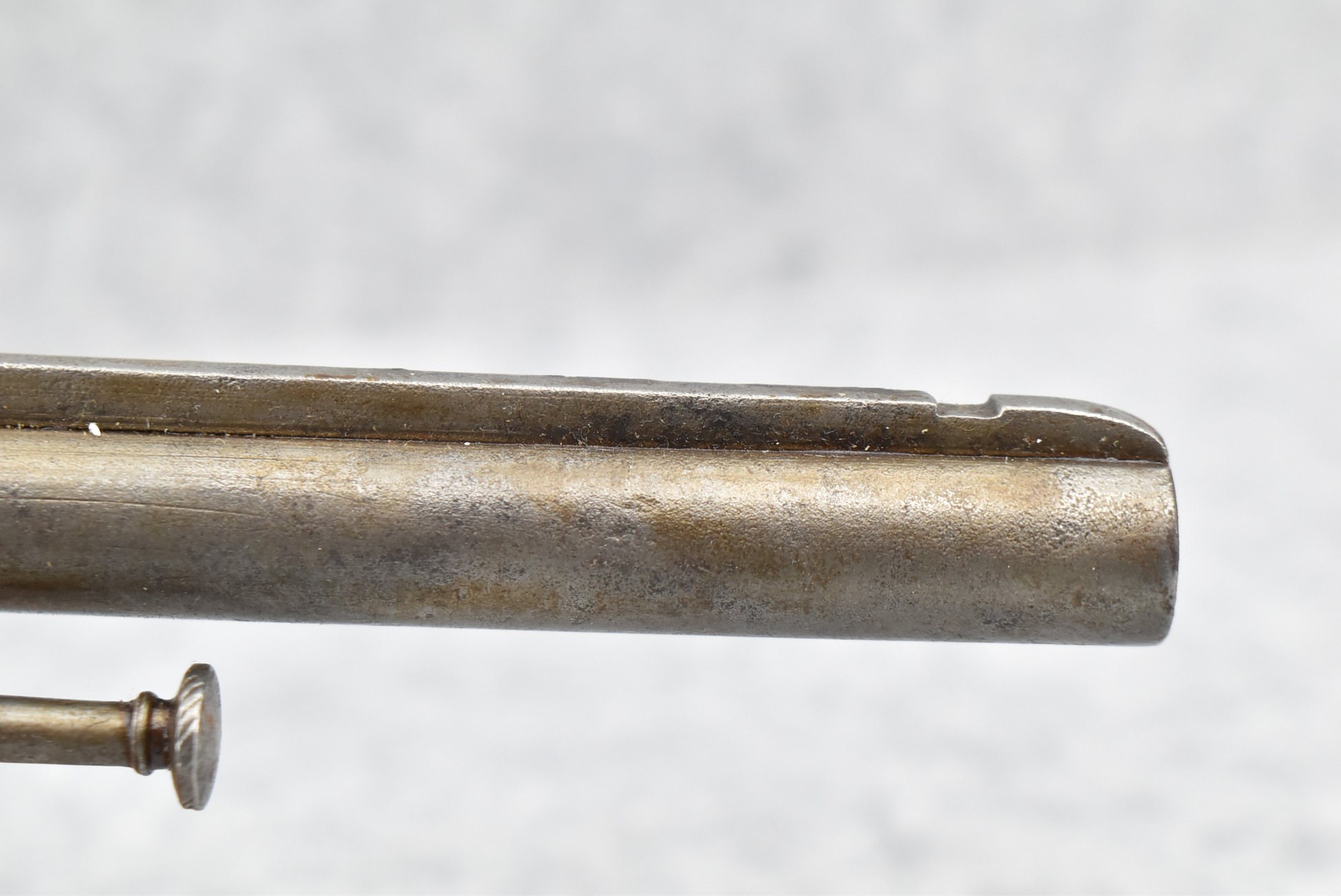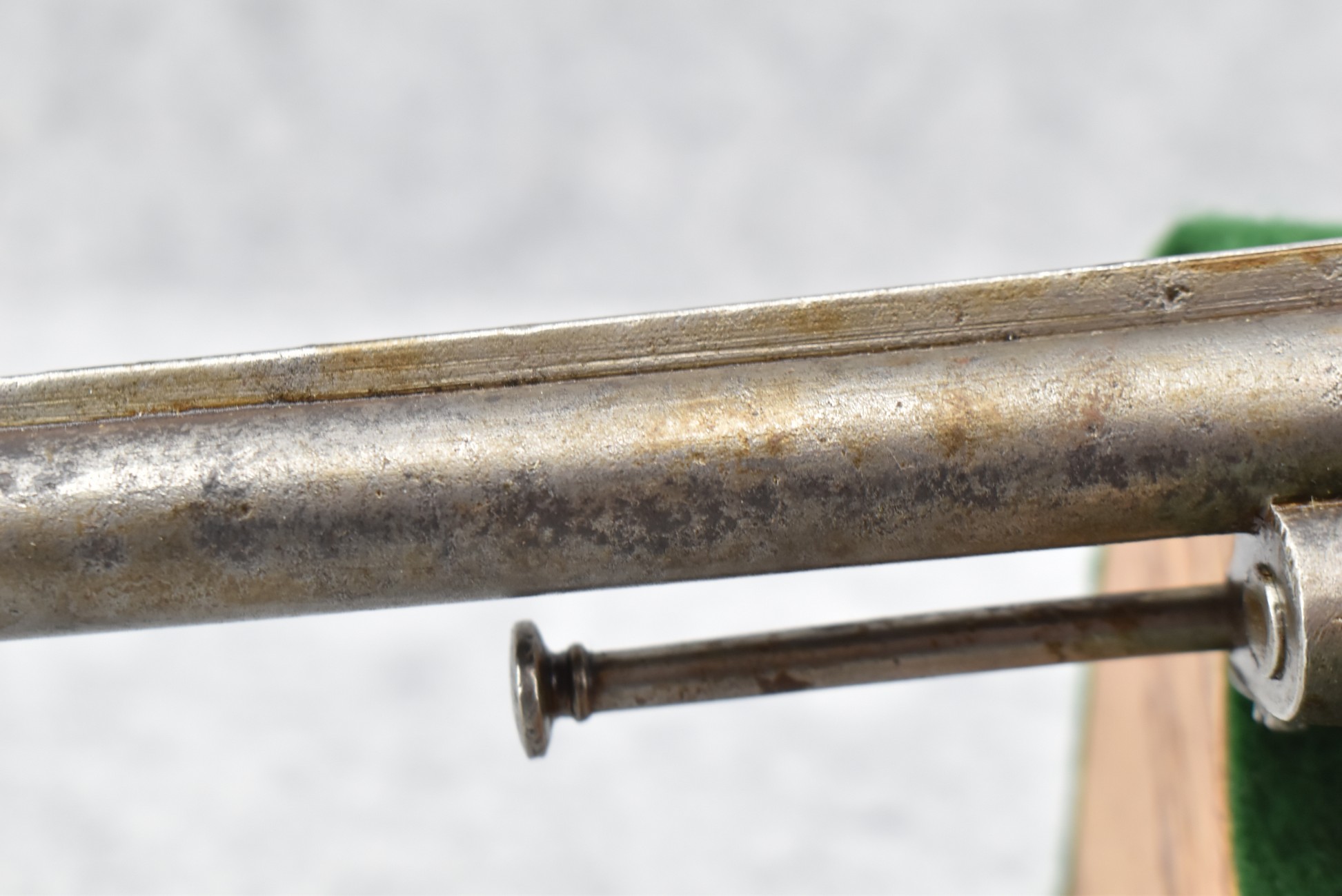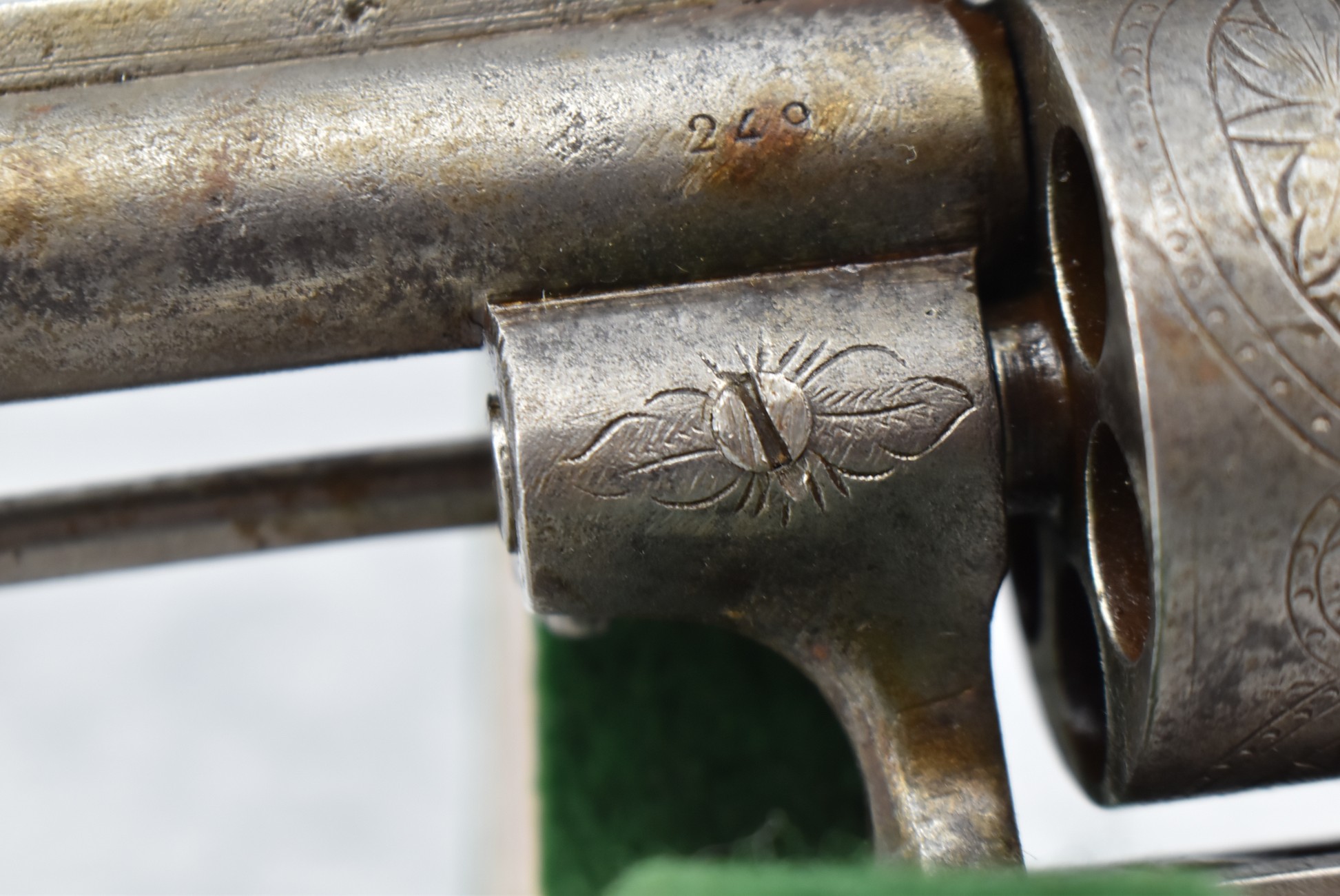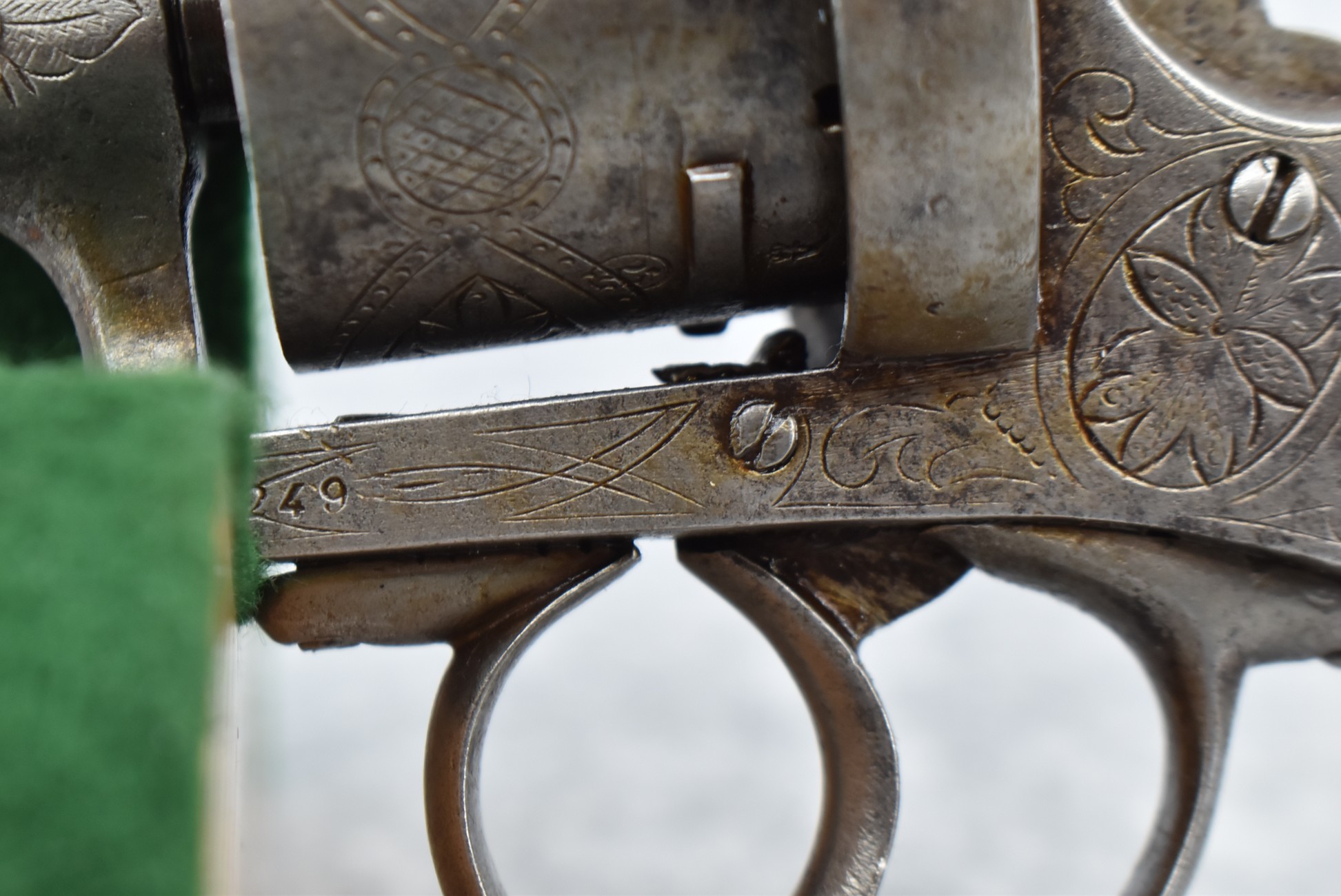258. Belgian – 11mm Pinfire Cal. Double Action Revolver – w/5 ½” Barrel (Missing Front Sight) w/Fixed Rear Sights – Gray Finish – w/Engraved Cylinder & Frame – w/Checkered Wood Grips w/Lanyard Ring – Note: Action Issues!!