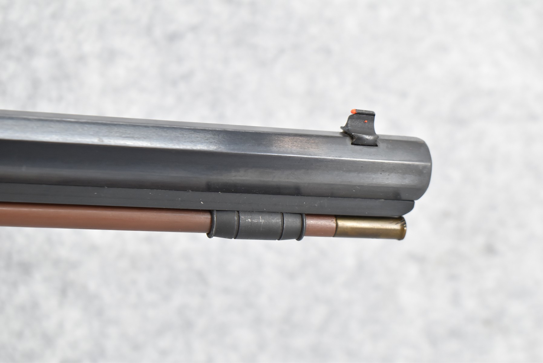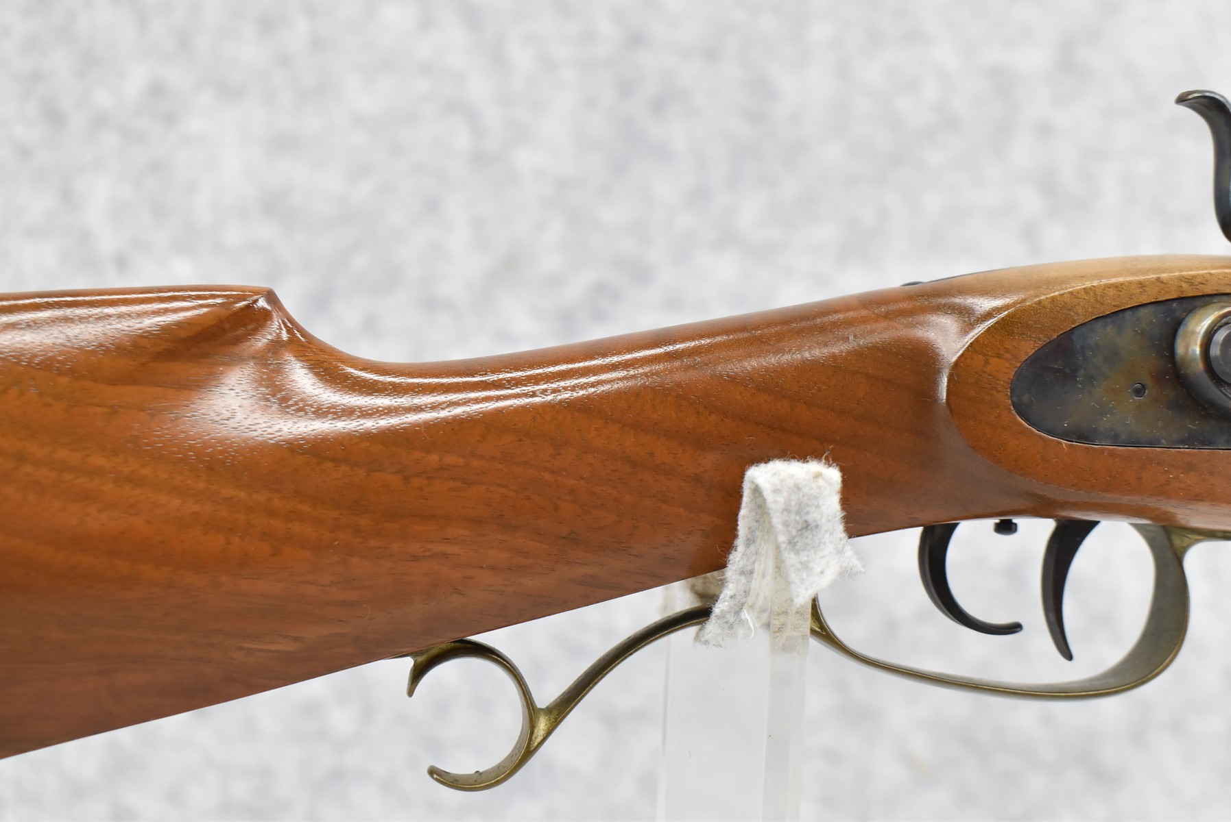 258.        Thompson Center – Mod. Seneca – 36 Cal. Percussion Black Powder Muzzleloading Rifle – w/27” Octagon Blued Barrel w/Blade Front & Rear Adj. Sights – w/Case Hardened Lock – w/Straight Grip Wood Stock w/Crescent Butt Plate & Cap Box Labeled “Jerry Rinehart” – w/Double Set Trigger