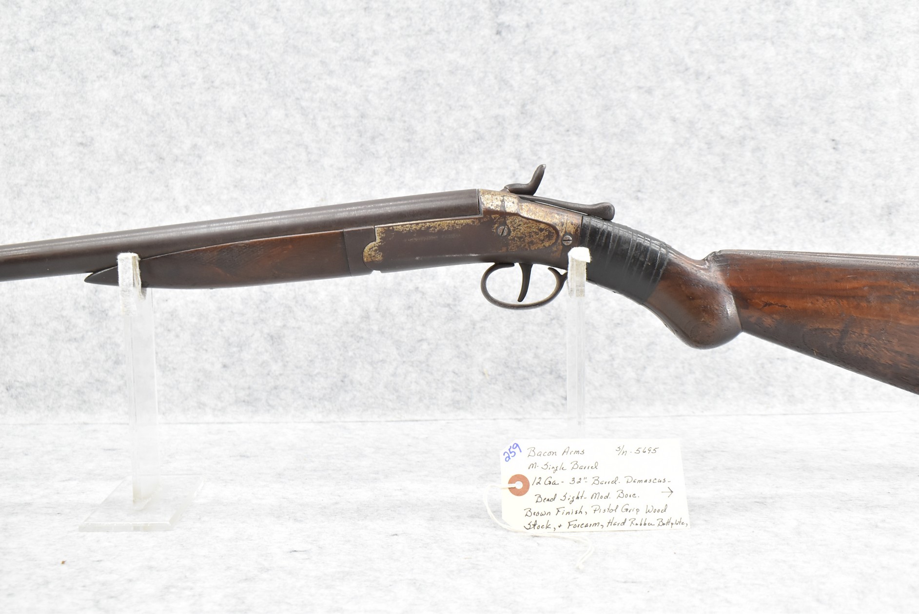 259. Bacon Arms – 12ga. Single Barrel Shotgun – w/32” Mod. Choked, Damascus Barrels w/Bead Sight – Brown Finish – w/Pistol Grip Wood Stocks w/Hard Rubber Butt Plate – Taped Pistol Grip