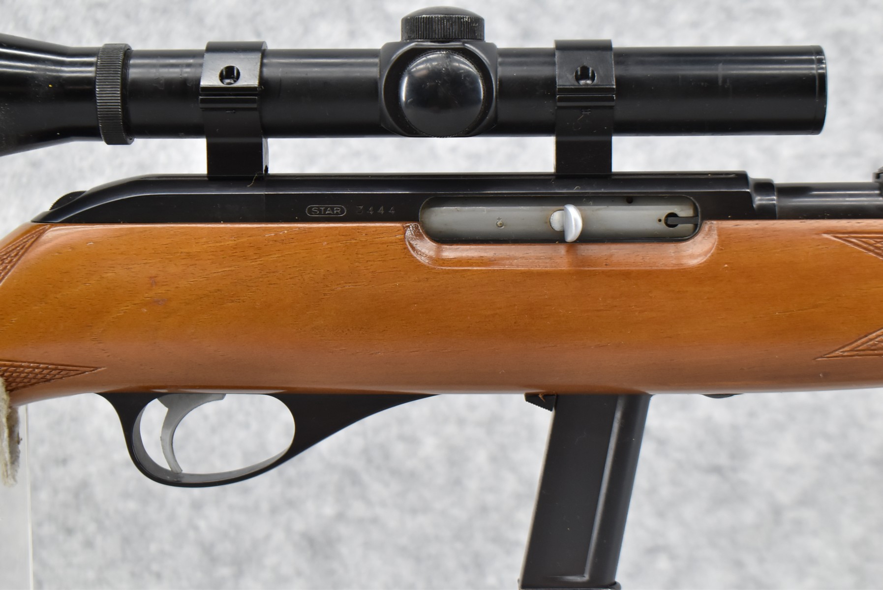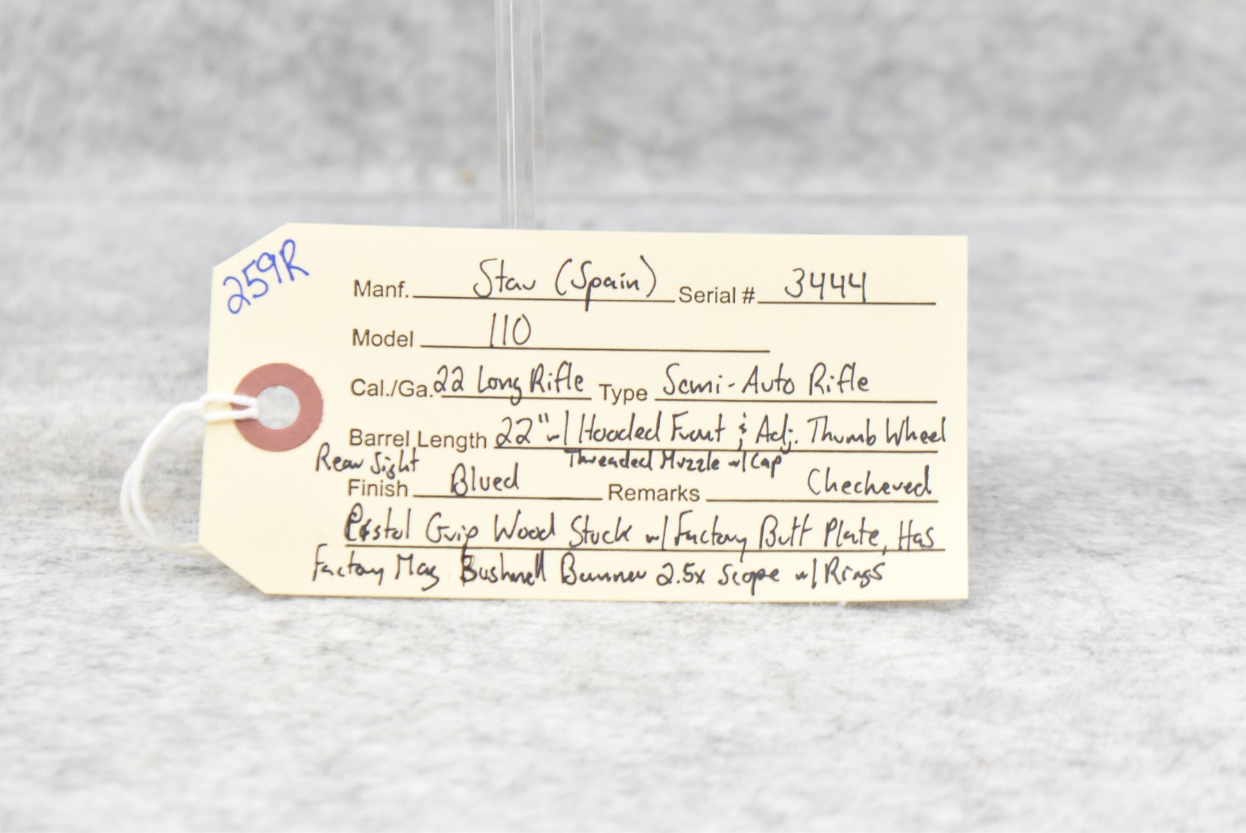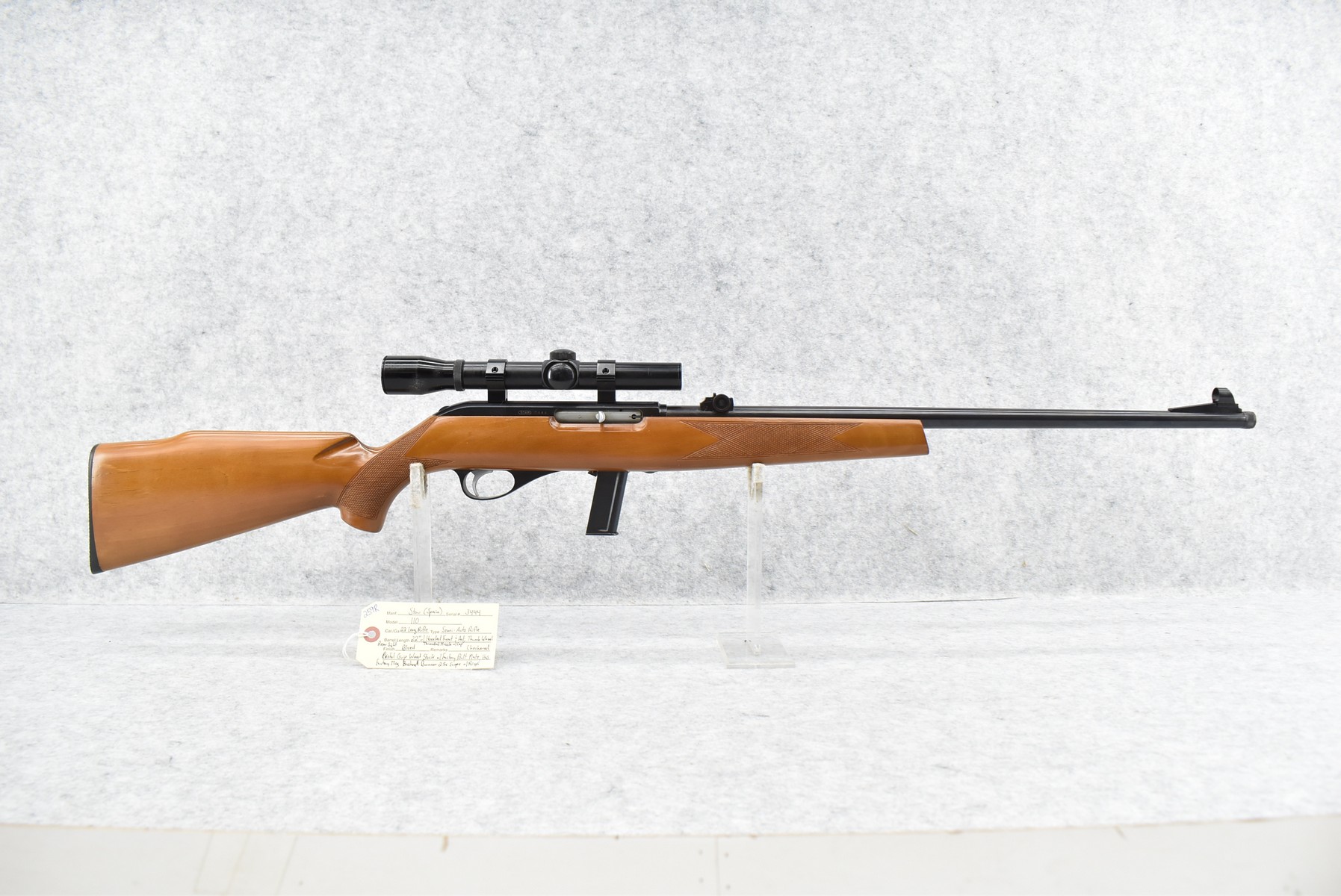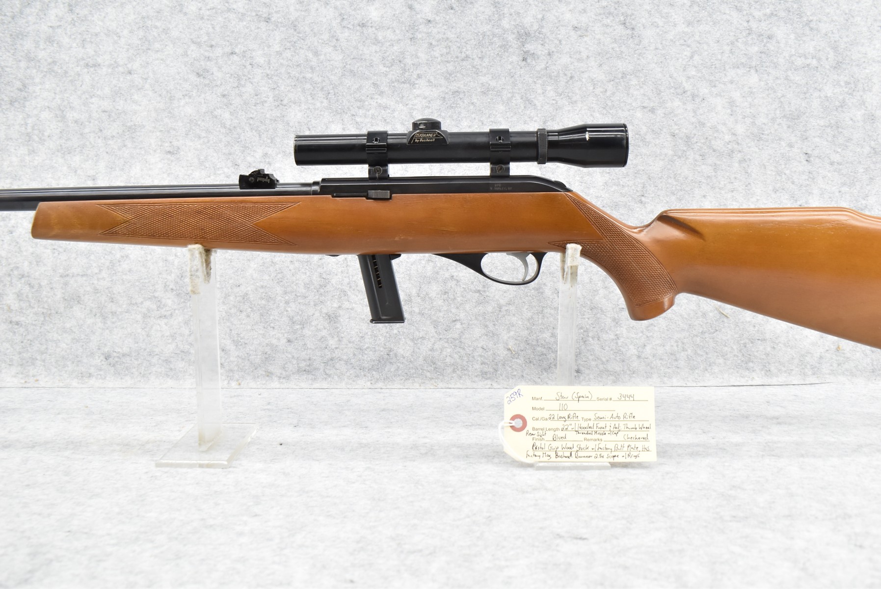 259R. Star (Spain) – Mod. 110 – 22 Long Rifle Cal. Semi-Auto Rifle – w/22” Barrel w/Threaded Muzzle & Cap w/Hooded Front & Adj. Thumb Wheel Rear Sights – Blued Finish – w/Checkered Pistol Grip Wood Stock w/Factory Butt Plate – w/Factory 10Rd Mag – w/Bushnell Banner 2.5x Scope w/Rings