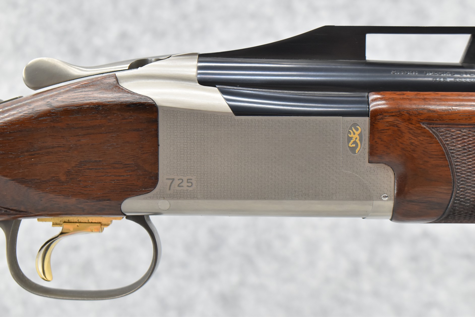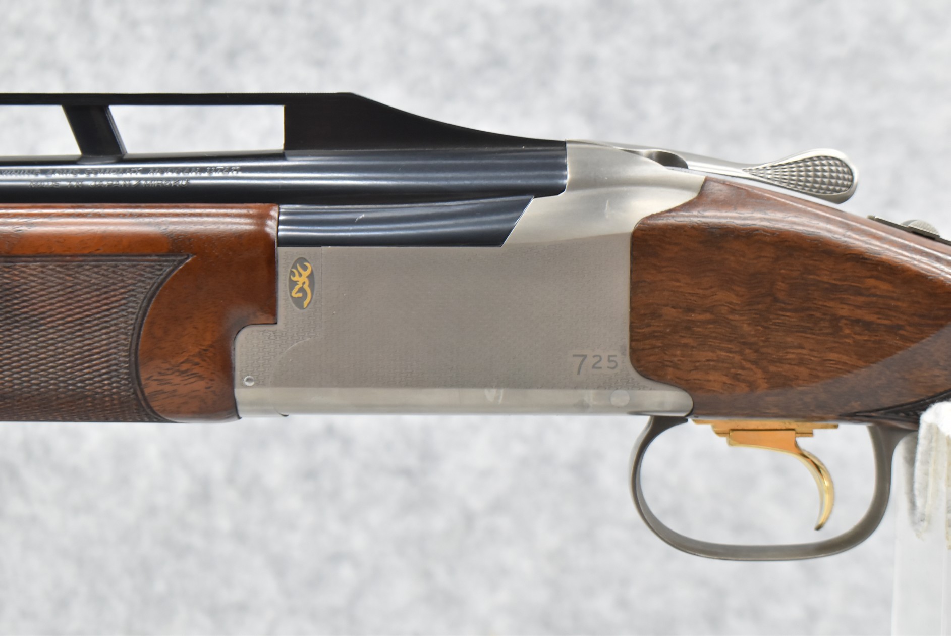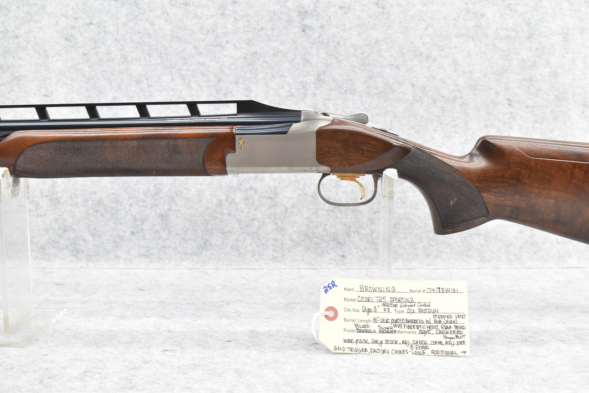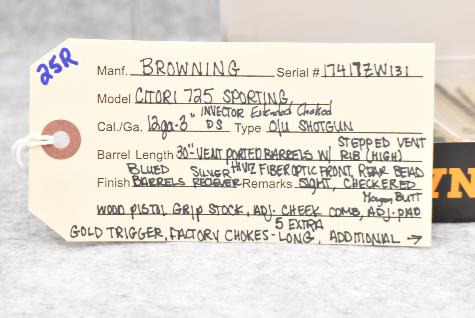 25R. Browning – Mod. Citori 725 Sporting – 12ga. 3” Over-Under Shotgun – w/30” Invector Plus Extended Choked, High Vent-Rib, Vent Ported Blued Finish Barrels w/Hi-Viz Fiber Optic Front & Rear Bead Sights – Silver Finish Receiver – w/Checkered Wood Pistol Grip Stock w/Adj. Cheek Comb & Morgan Adj. Butt Pad – w/Factory Chokes, 5 Extra Long (Chokes Include: Modified, Improved Cyl., Skeet, Full, & IM) – w/Manual, Additional Butt Pad & Browning Accessories