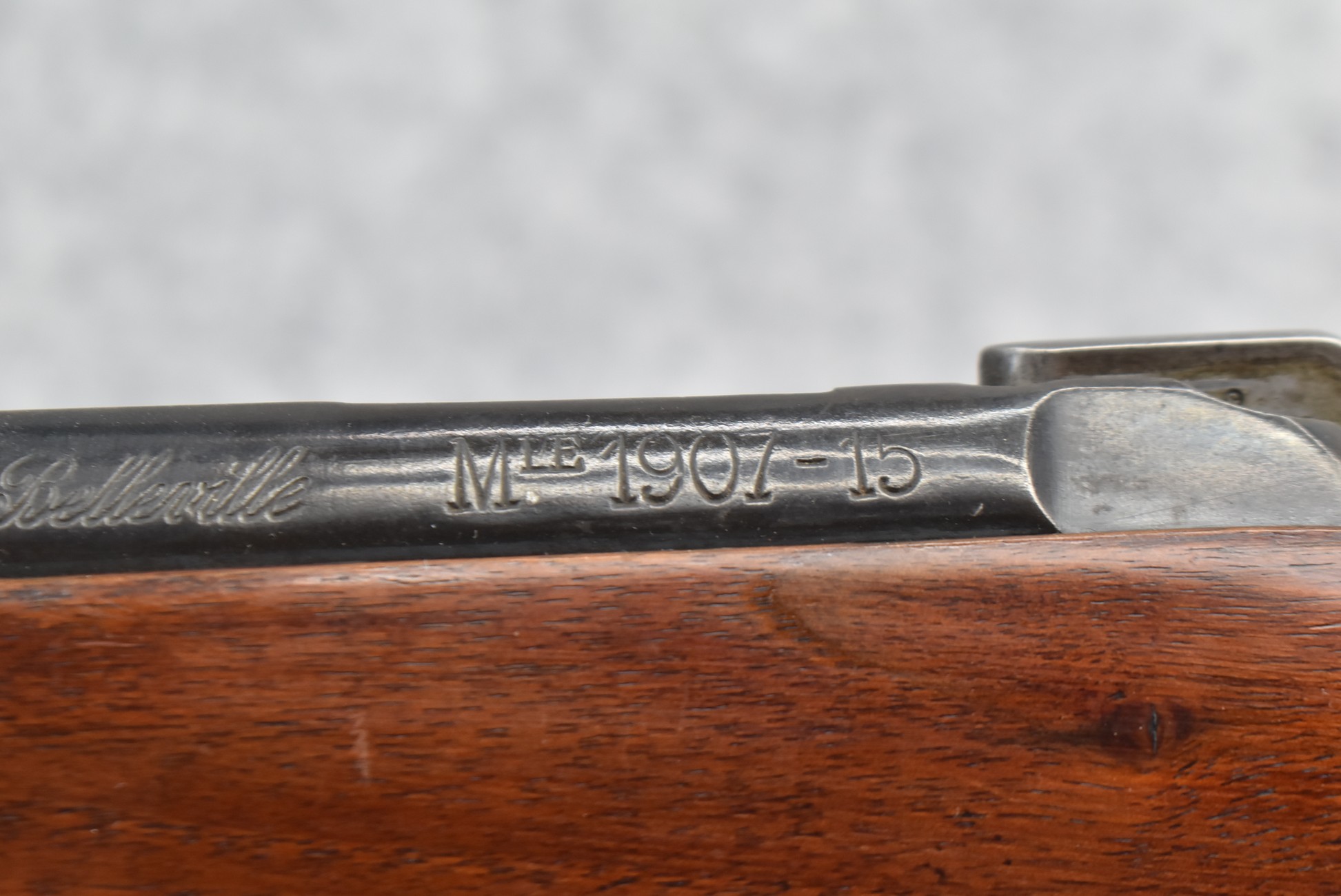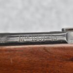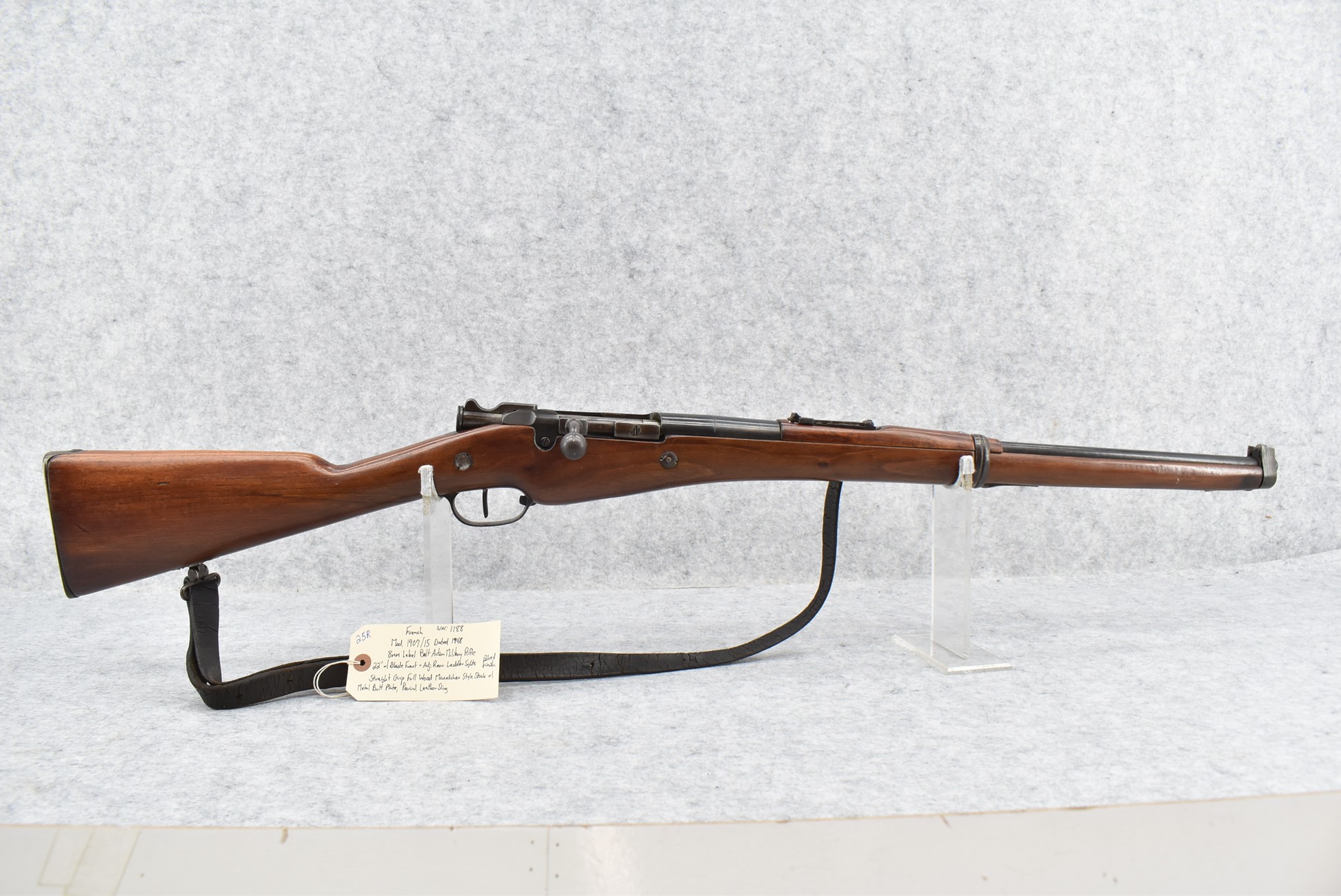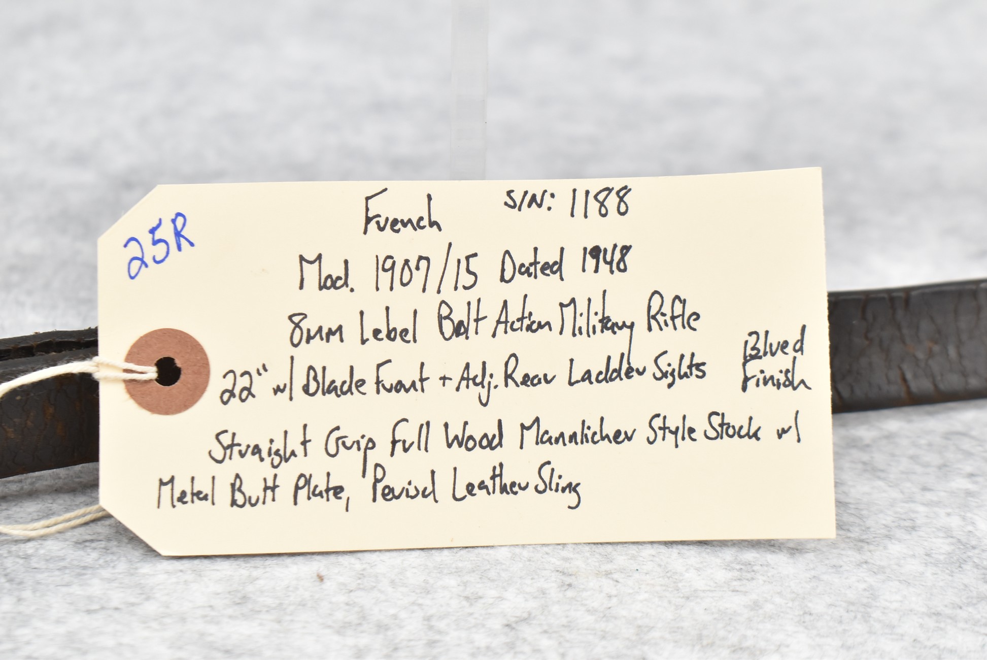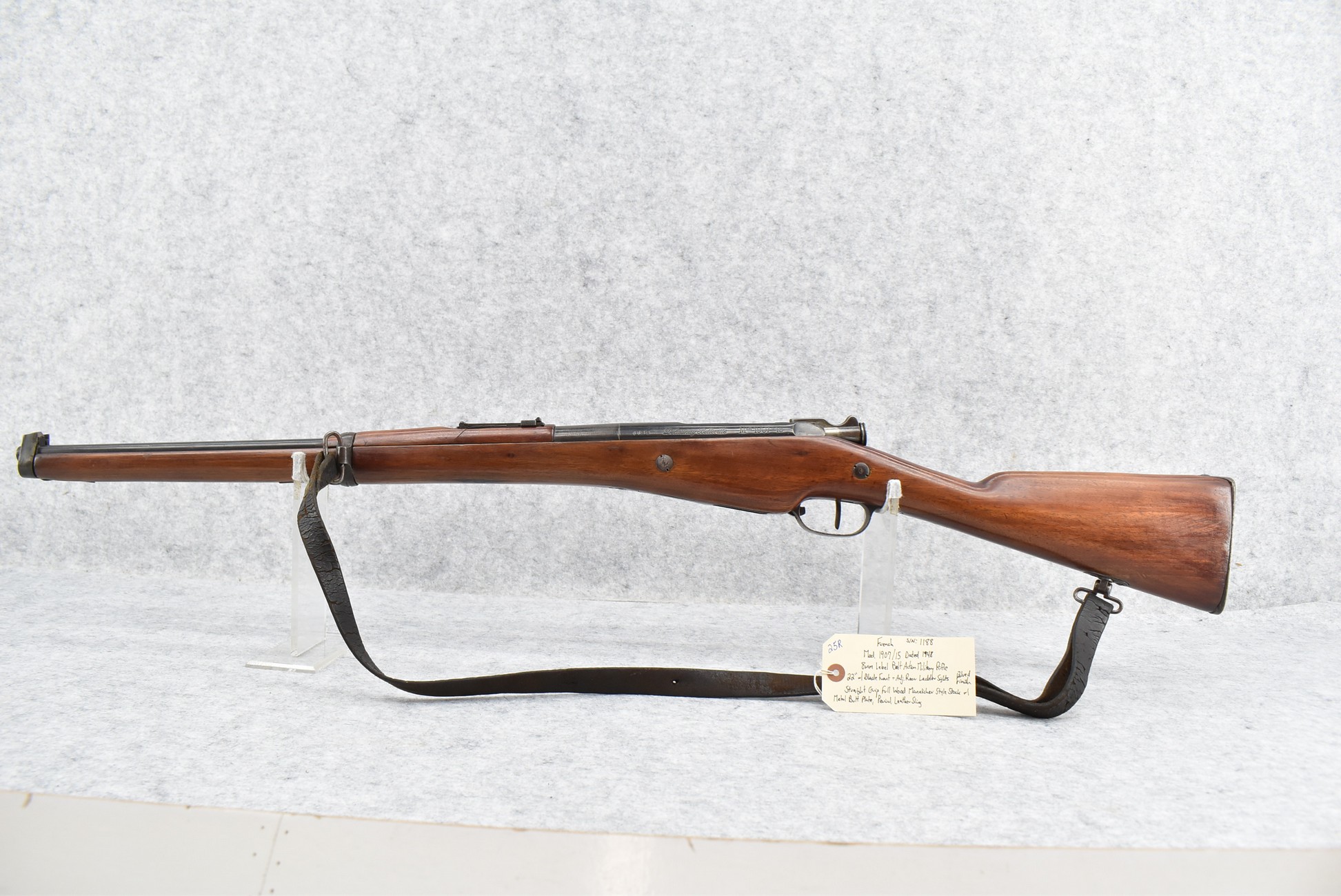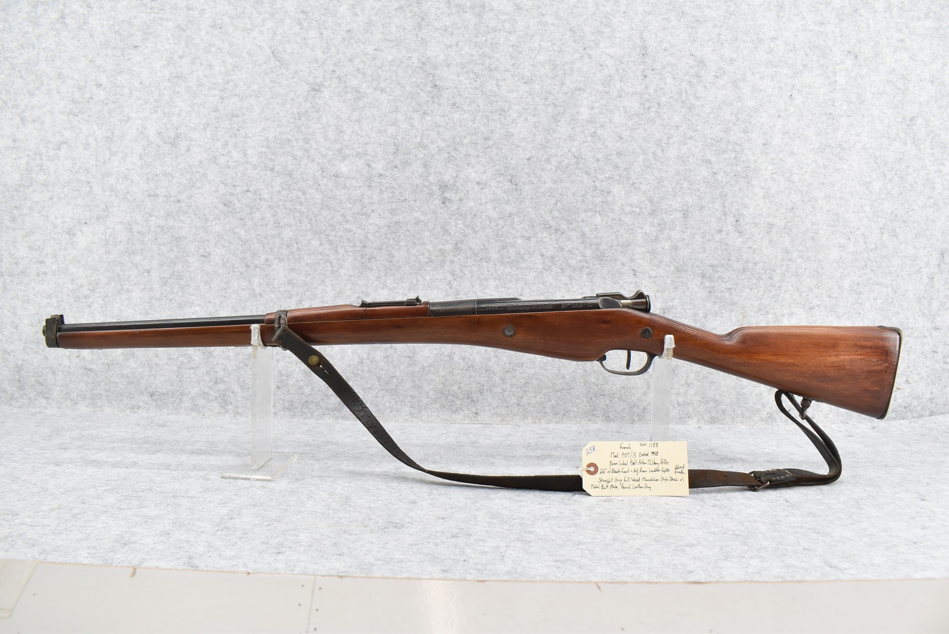 25R. French – Mod. 1907/15 – 8mm Lebel Cal. Bolt Action Rifle – w/22” Barrel w/Blade Front & Adj. Rear Ladder Sights – Blued Finish – w/Straight Grip Full Wood Mannlicher Style Stock w/Metal Butt Plate – w/Period Leather Sling – Dated 1948