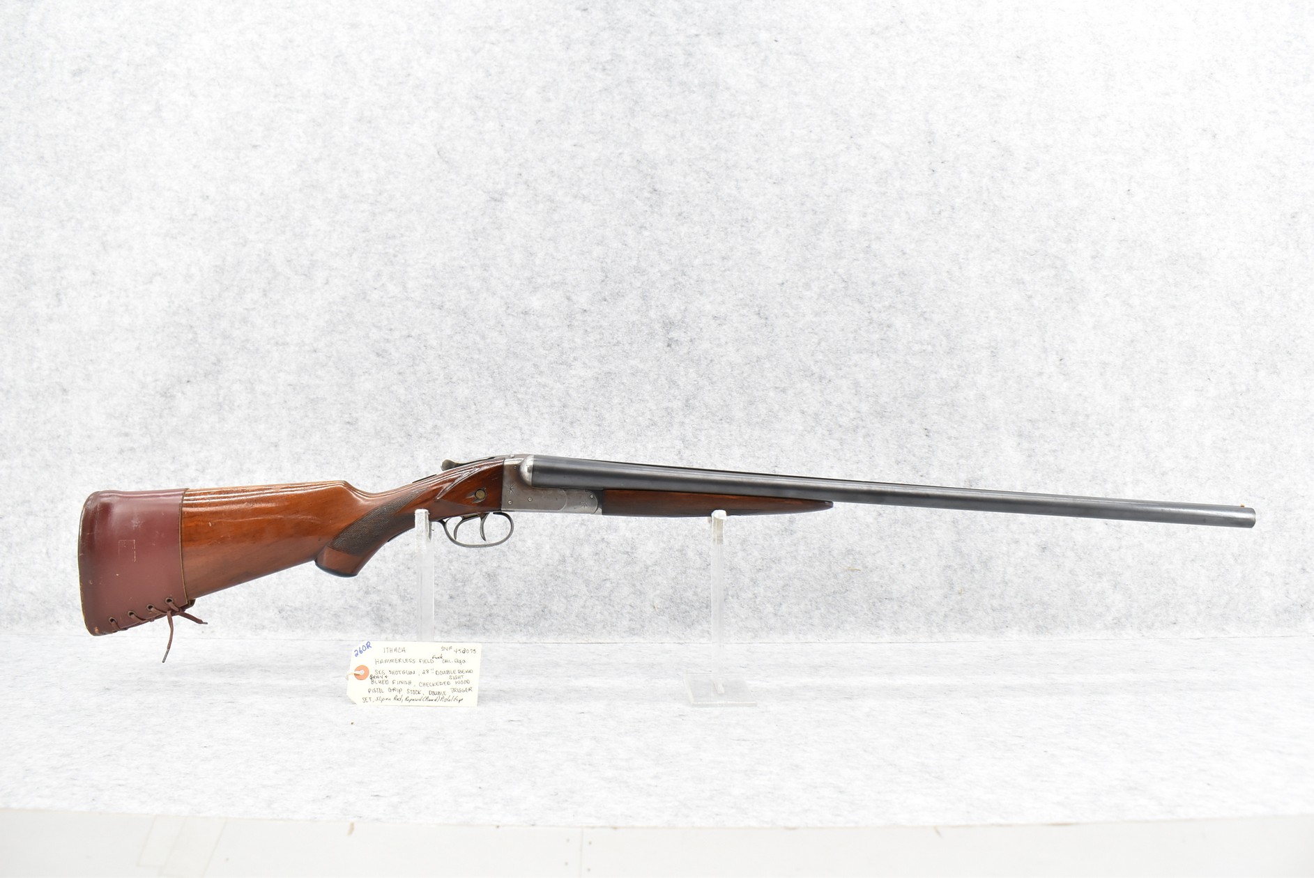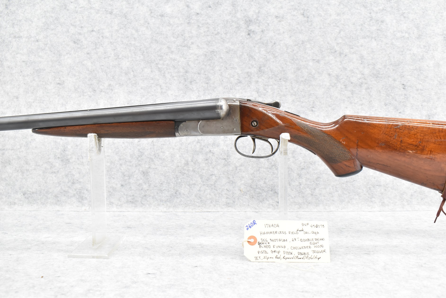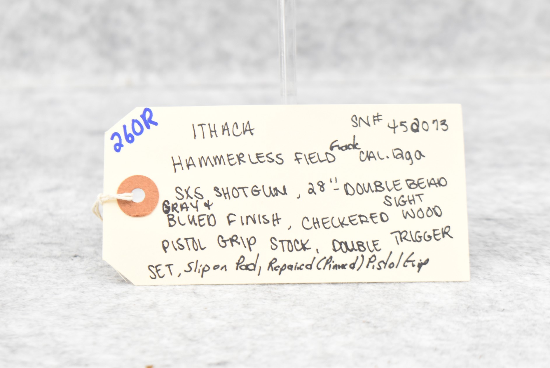 260R. Ithaca – Mod. Hammerless Field Grade – 12ga. Double Barrel Shotgun – w/28” Barrels w/Double Bead Sight – Gray & Blued Finish – w/Checkered Wood Pistol Grip Stock w/Slip-On Pad – w/Double Trigger – Note: Repaired (Pinned) Pistol Grip