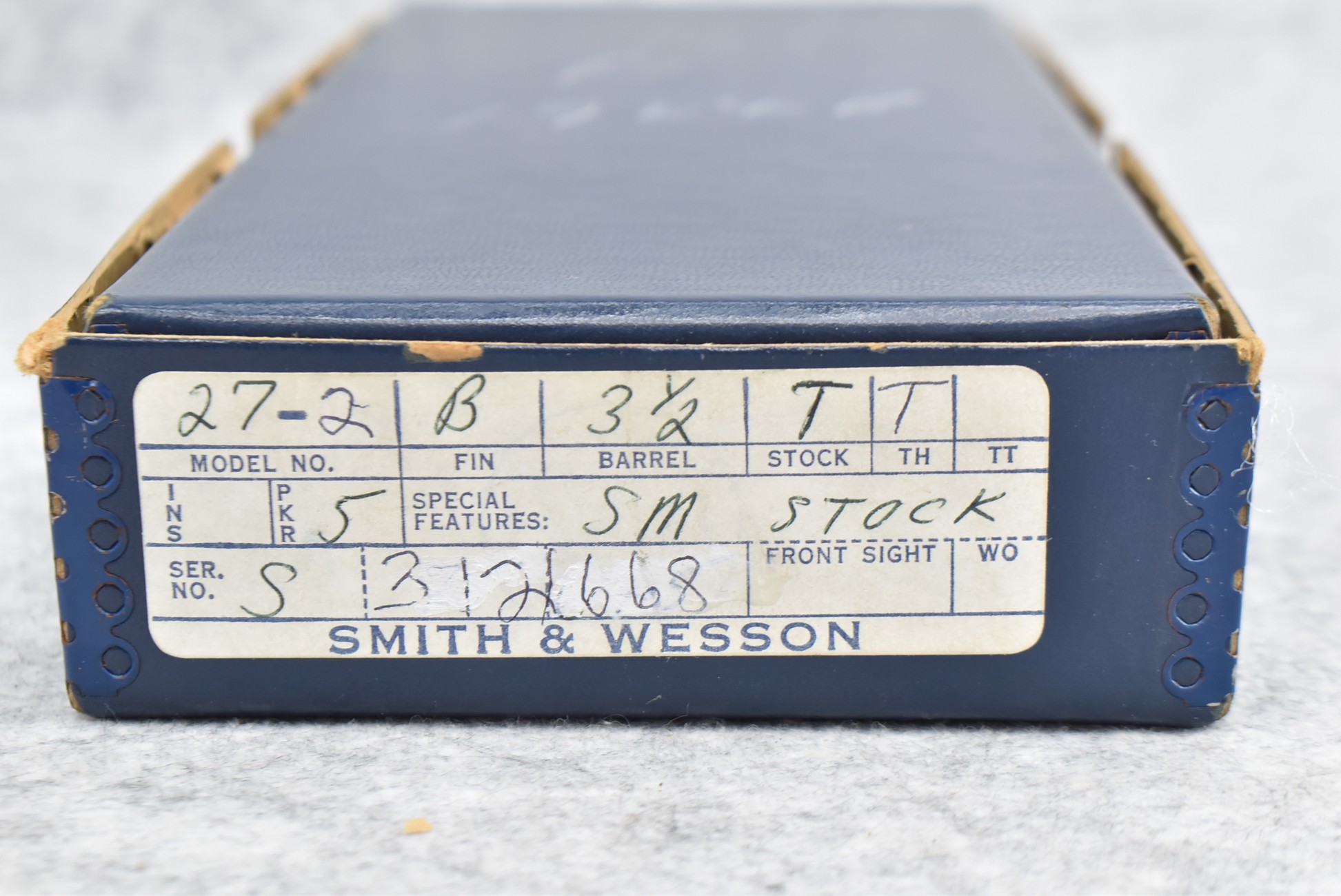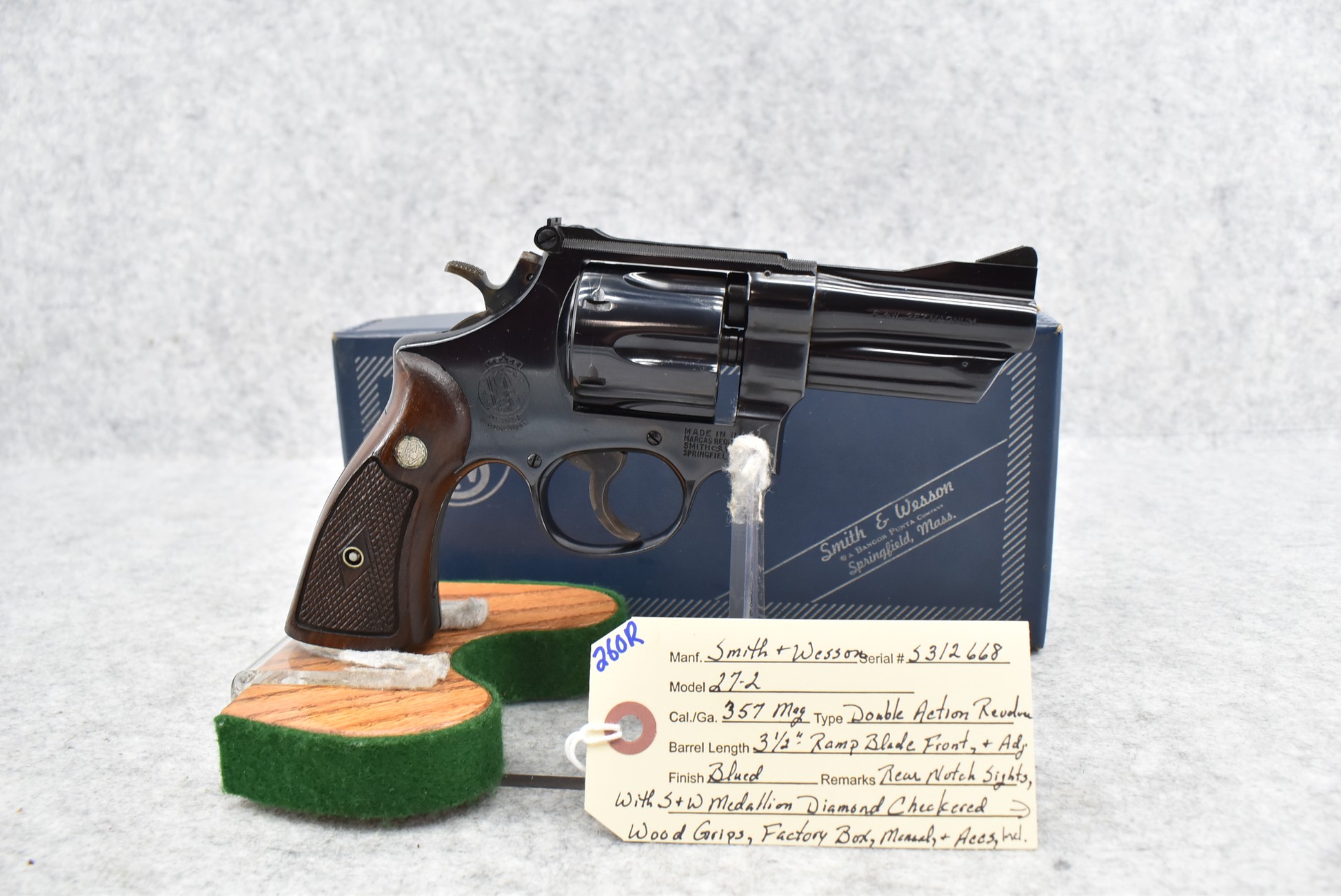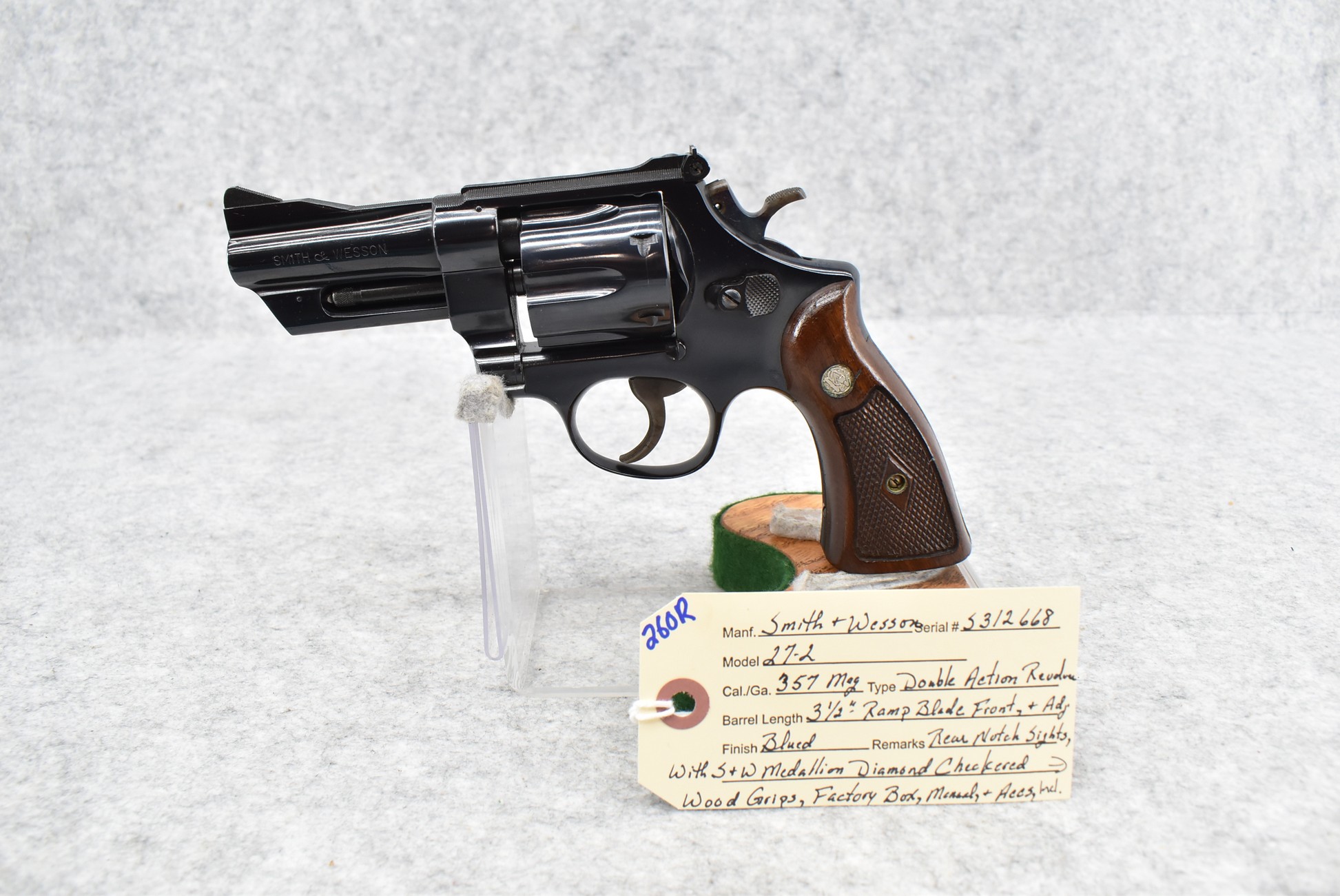 260R. Smith & Wesson – Mod. 27-2 – 357 Mag. Cal. Double Action Revolver – w/3 ½” Barrel w/Ramp Blade Front & Adj. Rear Notch Sights – Blued Finish – w/S&W Medallion Diamond Checkered Wood Grips – w/Factory Box, Manual & Accessories Including Cleaning Rod w/Brush & Swab & Screwdriver