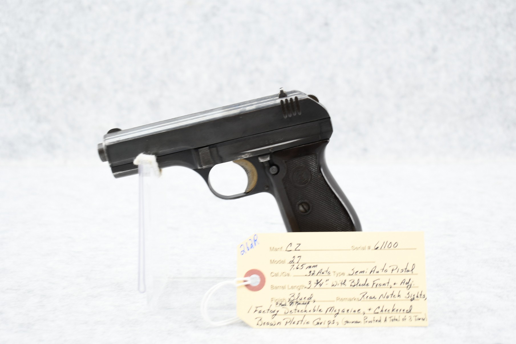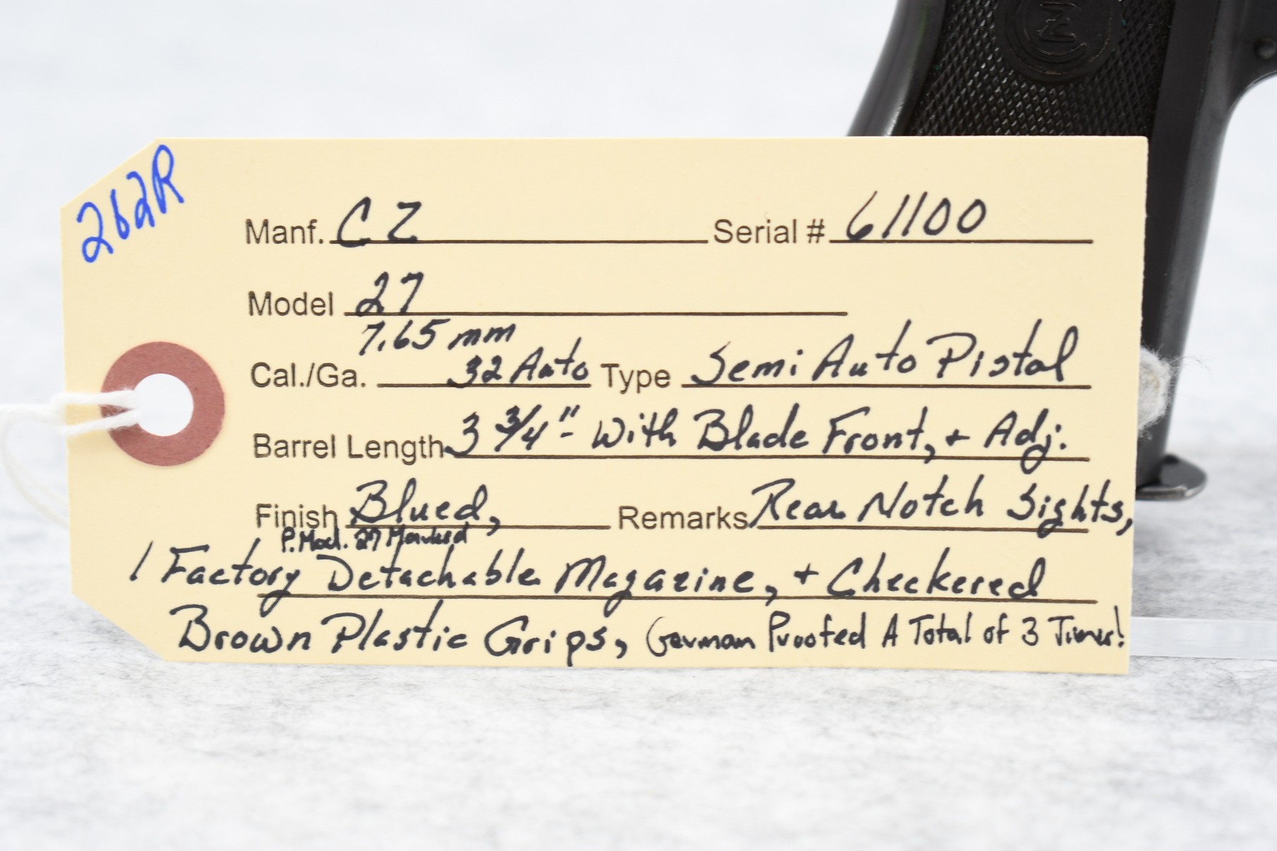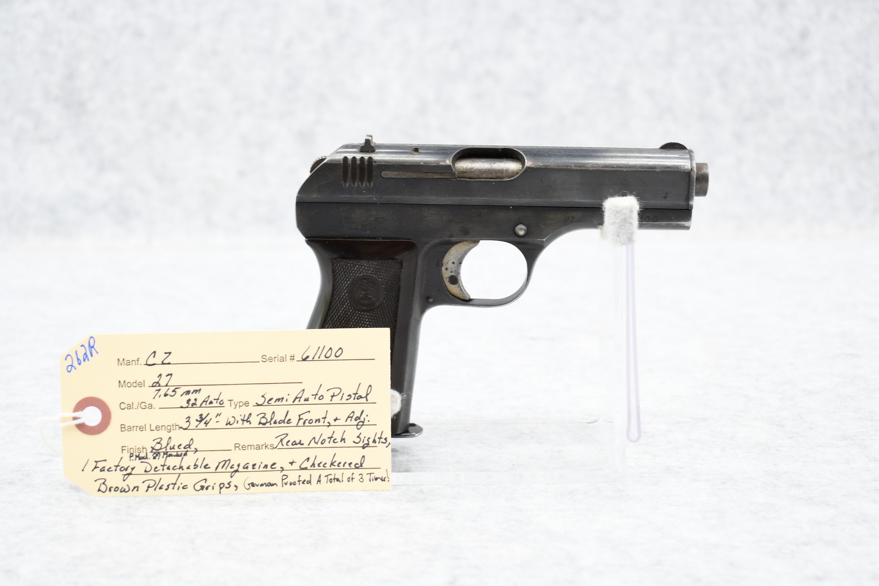 262R. CZ – Mod. 27 – 7.65mm (32 Auto) Cal. Semi-Auto Pistol – w/3 ¾” Barrel w/Blade Front & Adj. Rear Notch Sights – Blued Finish – w/Checkered Brown Plastic Grips – w/Factory P. Mod. 27 Marked Detachable Magazine – German Proofed a Total of 3 Times!
