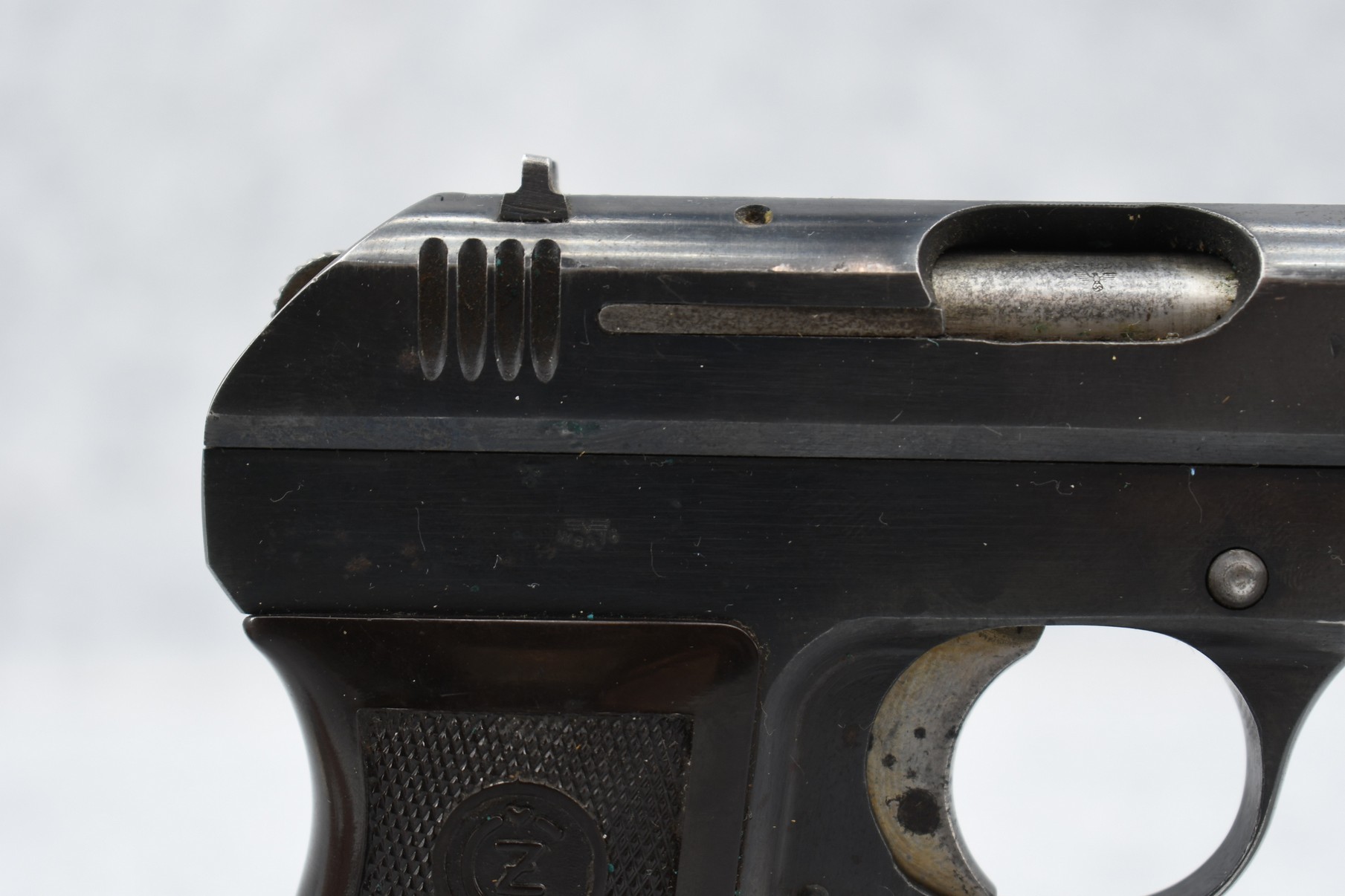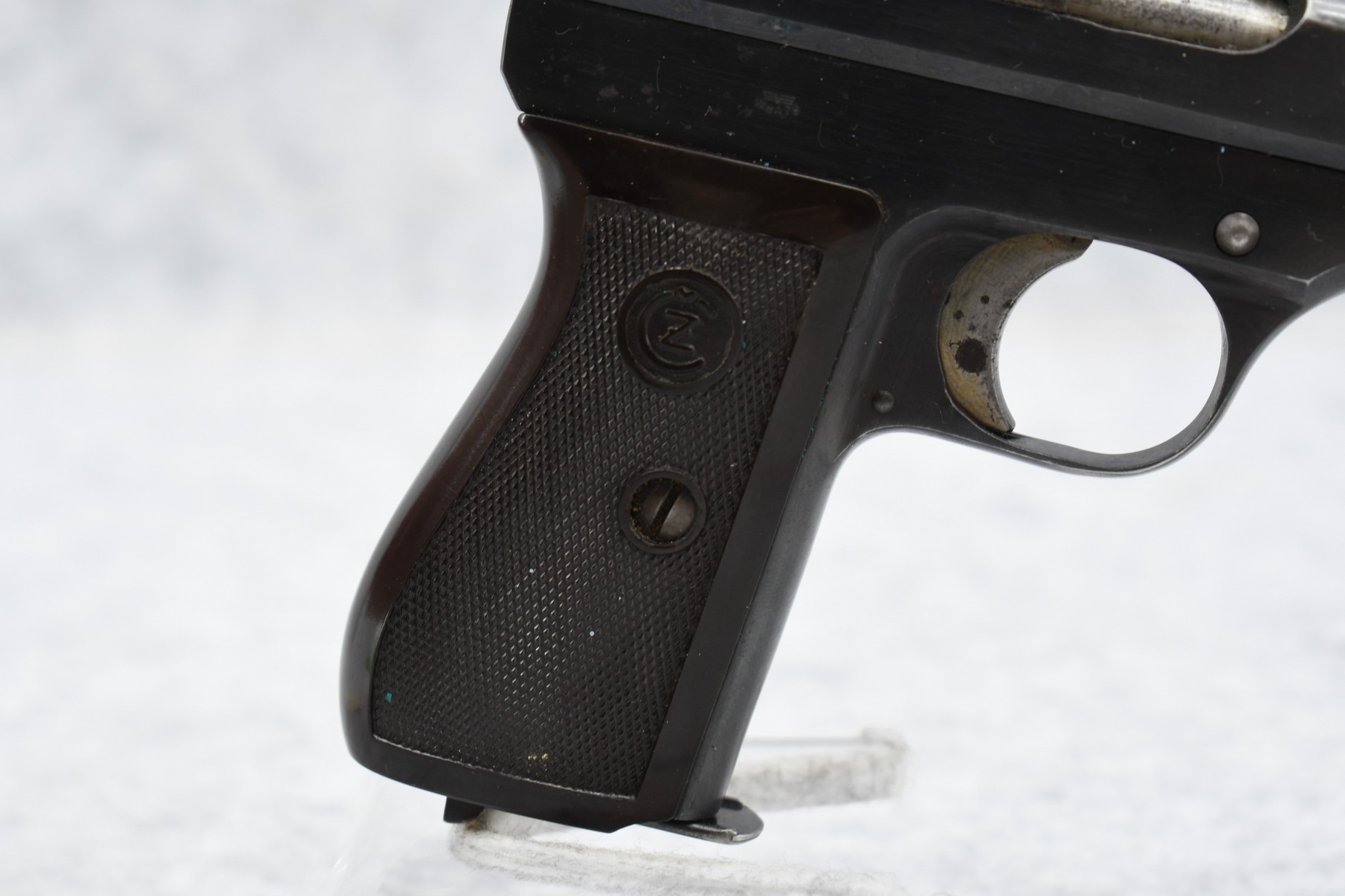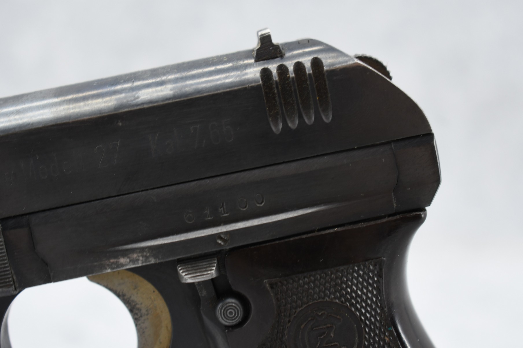 262R. CZ – Mod. 27 – 7.65mm (32 Auto) Cal. Semi-Auto Pistol – w/3 ¾” Barrel w/Blade Front & Adj. Rear Notch Sights – Blued Finish – w/Checkered Brown Plastic Grips – w/Factory P. Mod. 27 Marked Detachable Magazine – German Proofed a Total of 3 Times!