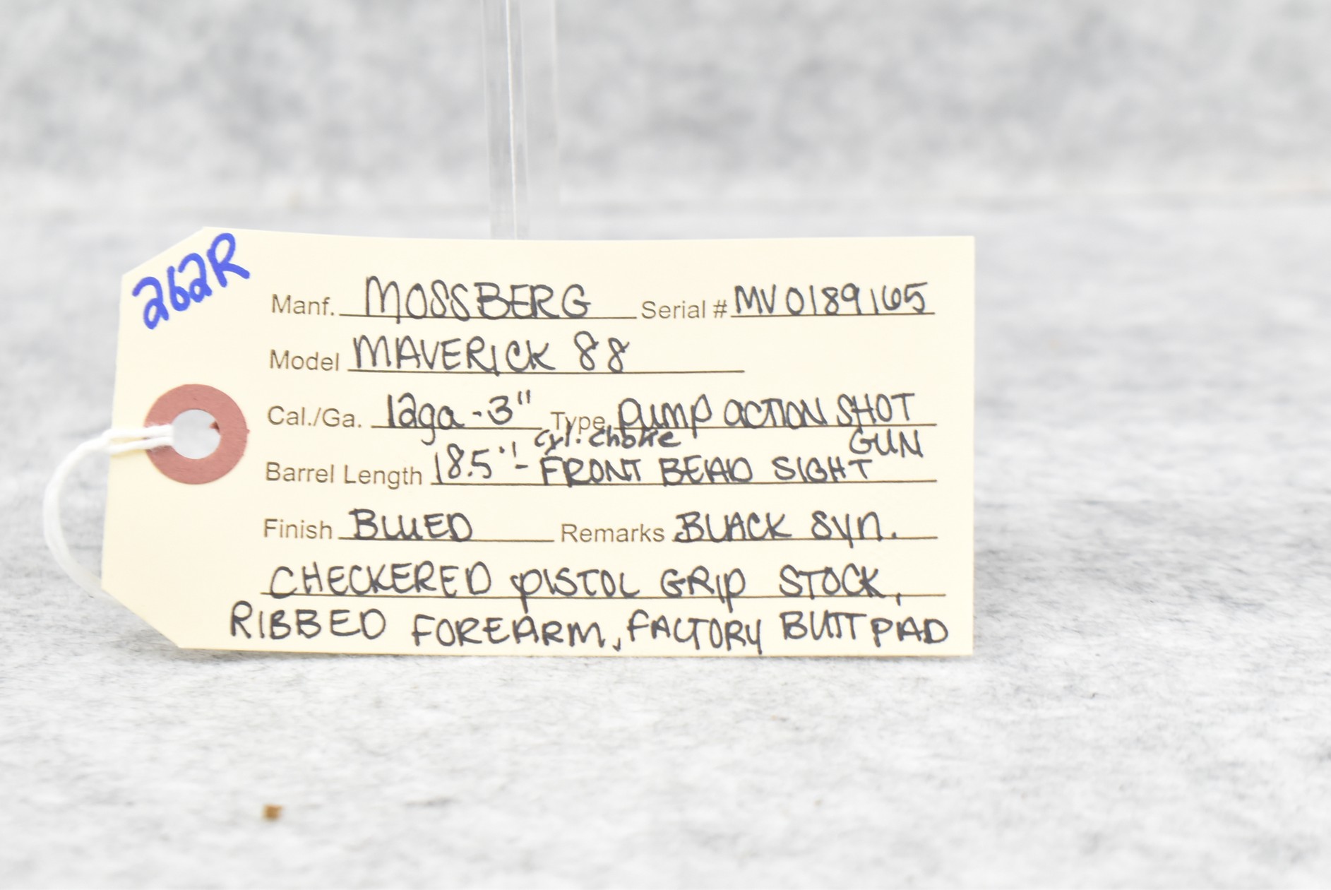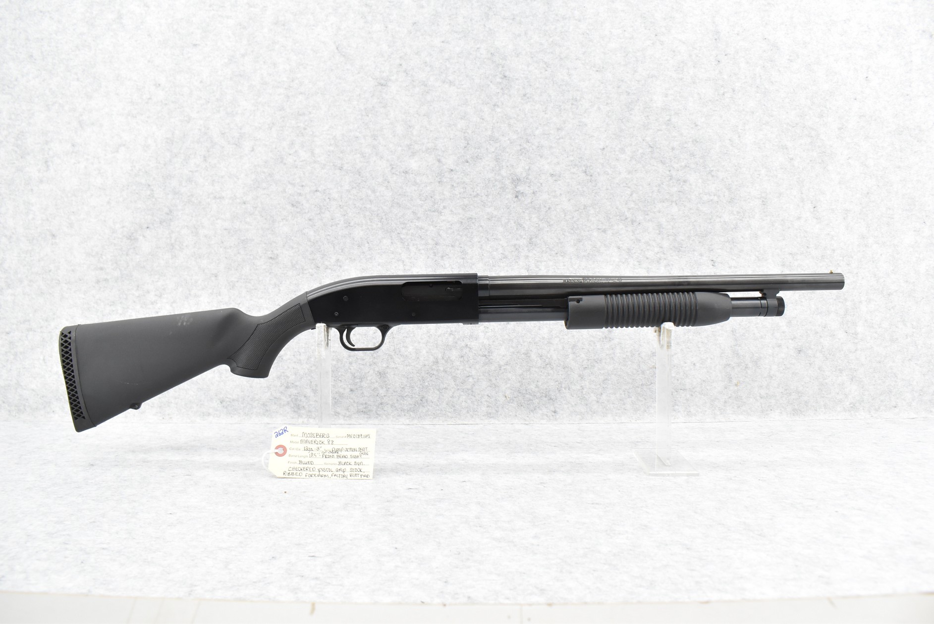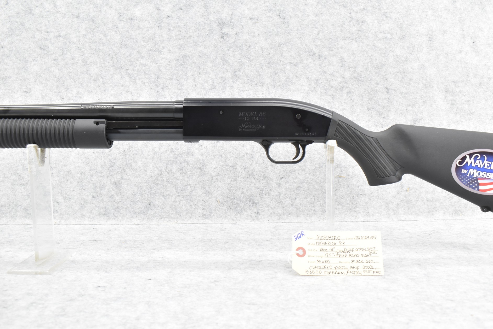 262R. Mossberg – Mod. Maverick 88 – 12ga. 3” Pump Action Shotgun – w/18.5” Cyl. Choke Barrel w/Front Bead Sight – Blued Finish – w/Black Synthetic Checkered Pistol Grip Stock w/Factory Butt Pad & Ribbed Forearm