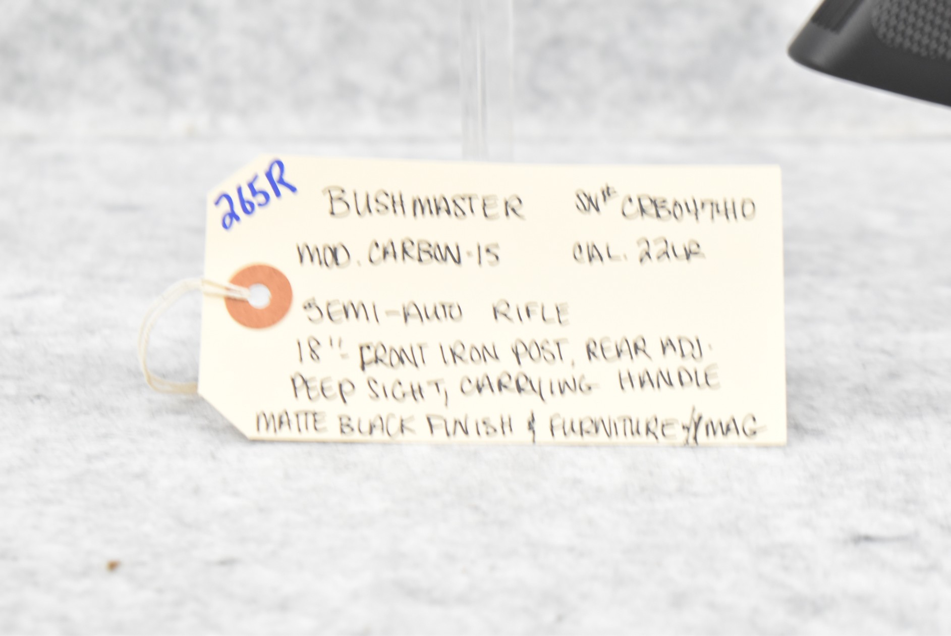 265R. Bushmaster – Mod. Carbon-15 – 22LR Cal. Semi-Auto Rifle – w/18” Barrel w/Front Iron Post & Rear Adj. Peep Sight – Matte Black Finish – w/Matte Black Furniture, Carrying Handle – w/Mag