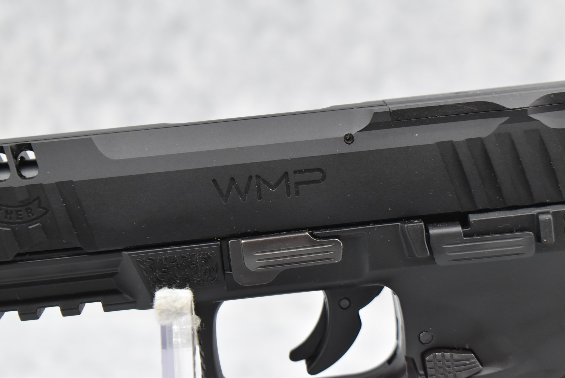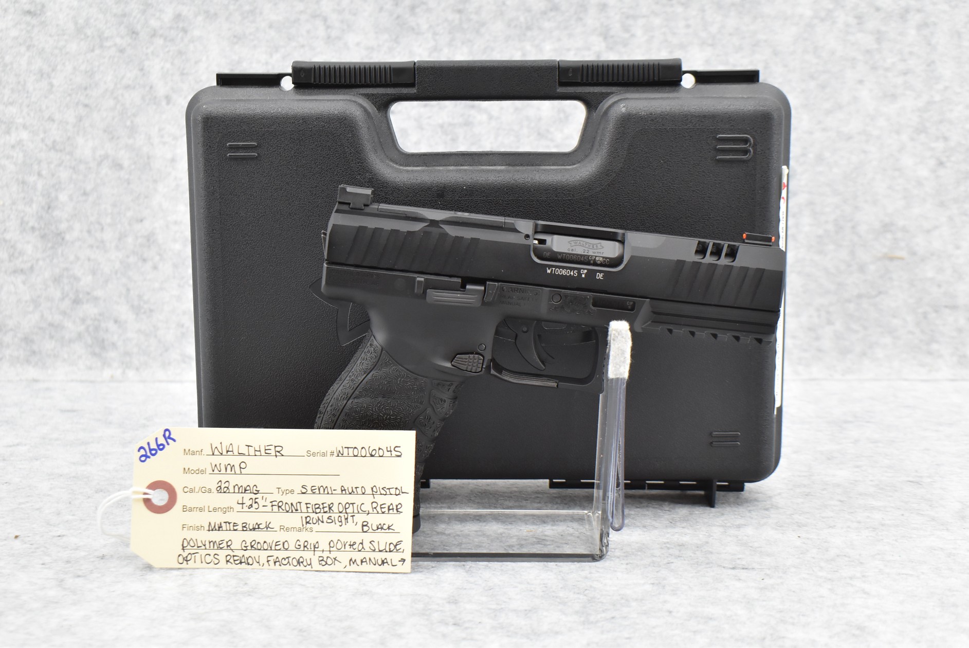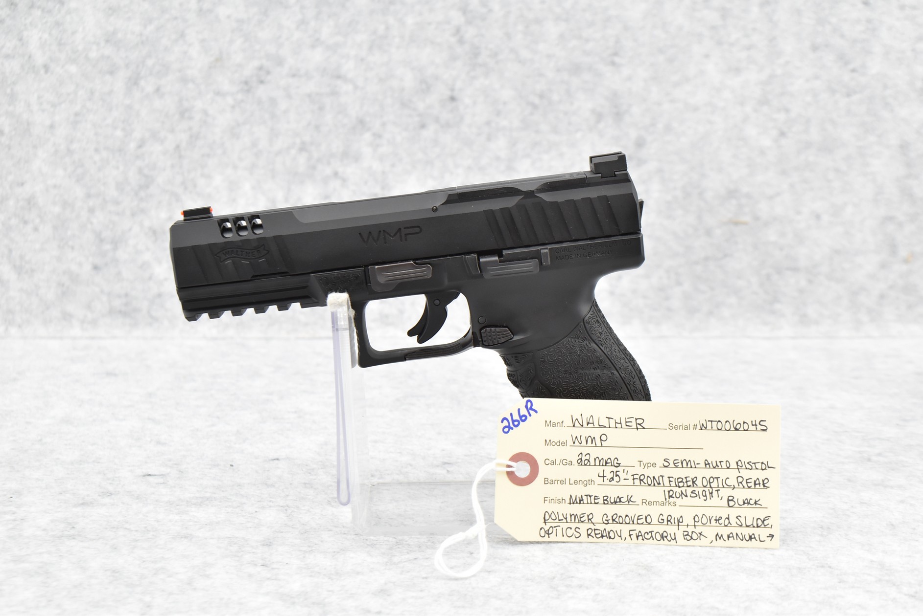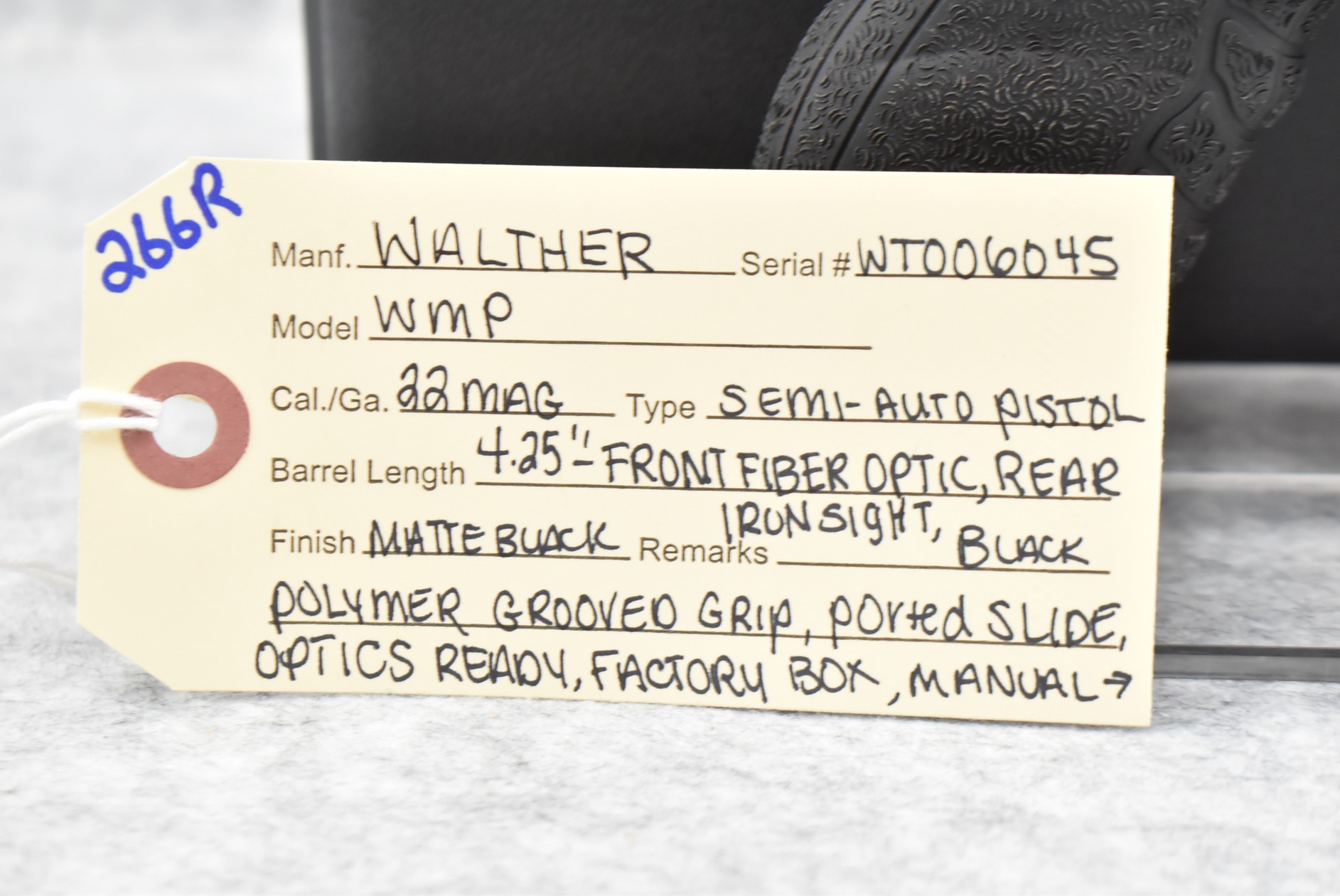 266R. Walther – Mod. WMP – 22 Win. Mag. Cal. Semi-Auto Pistol – w/4.25” Barrel w/Front Fiber Optic & Rear Iron Sights – Matte Black Finish – w/Black Polymer Grooved Grips – w/Ported Slide – Optics Ready – w/Factory Box, Manual & 2 Mags