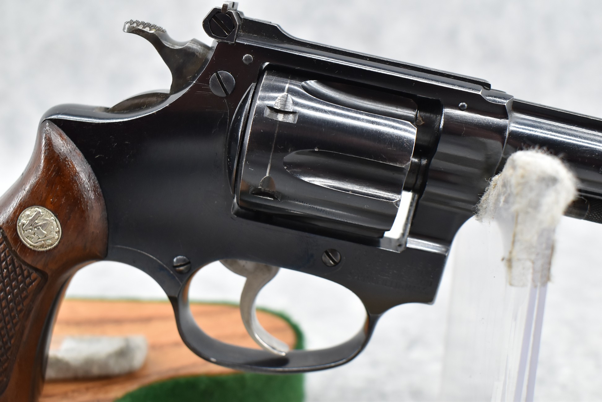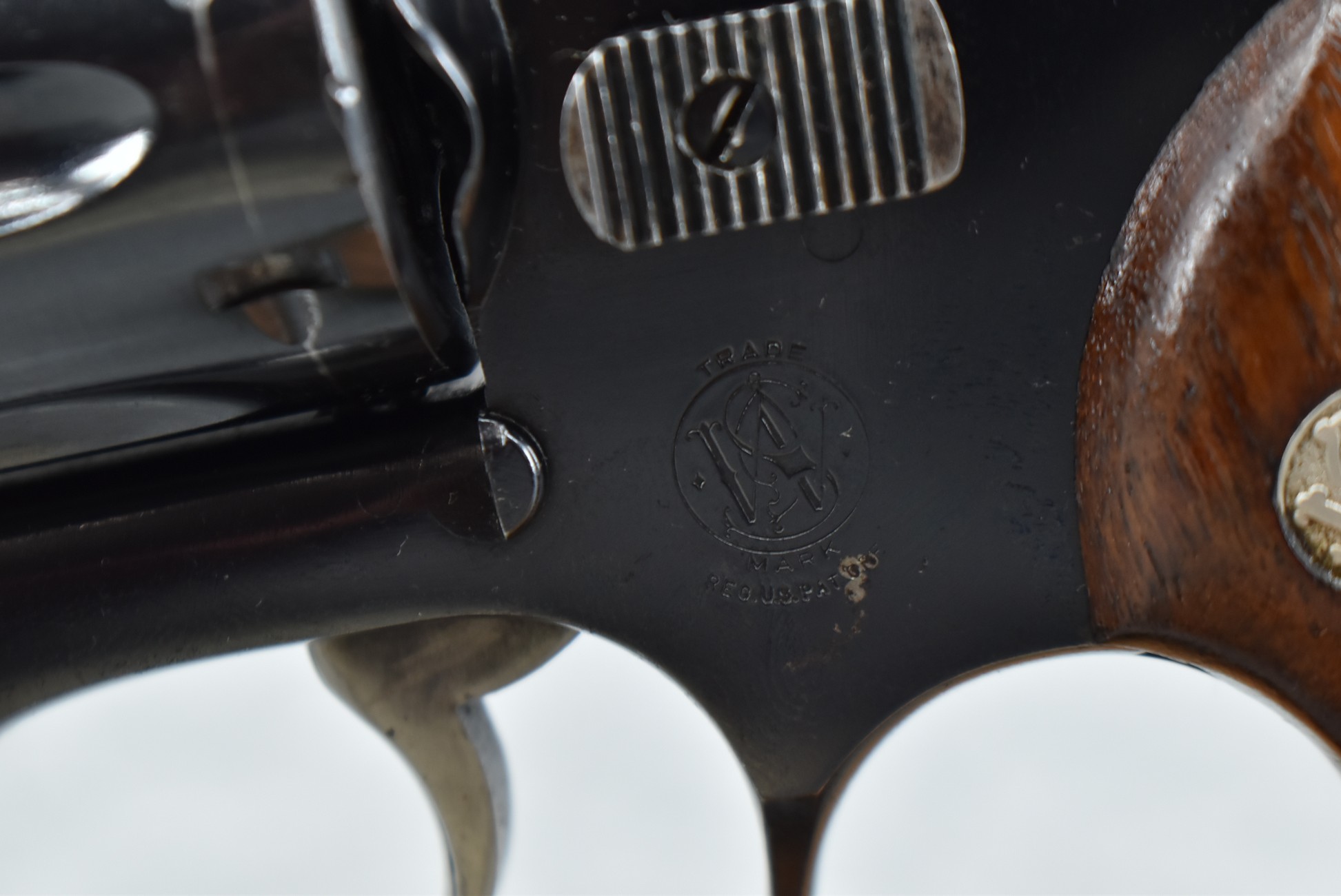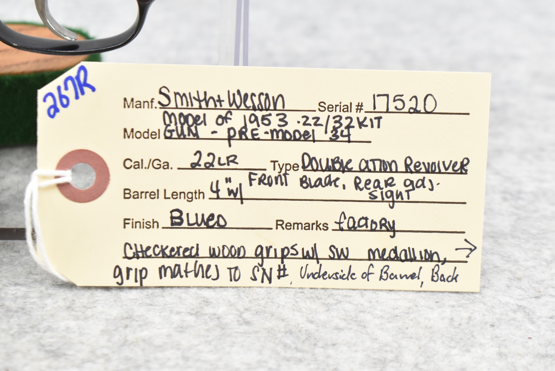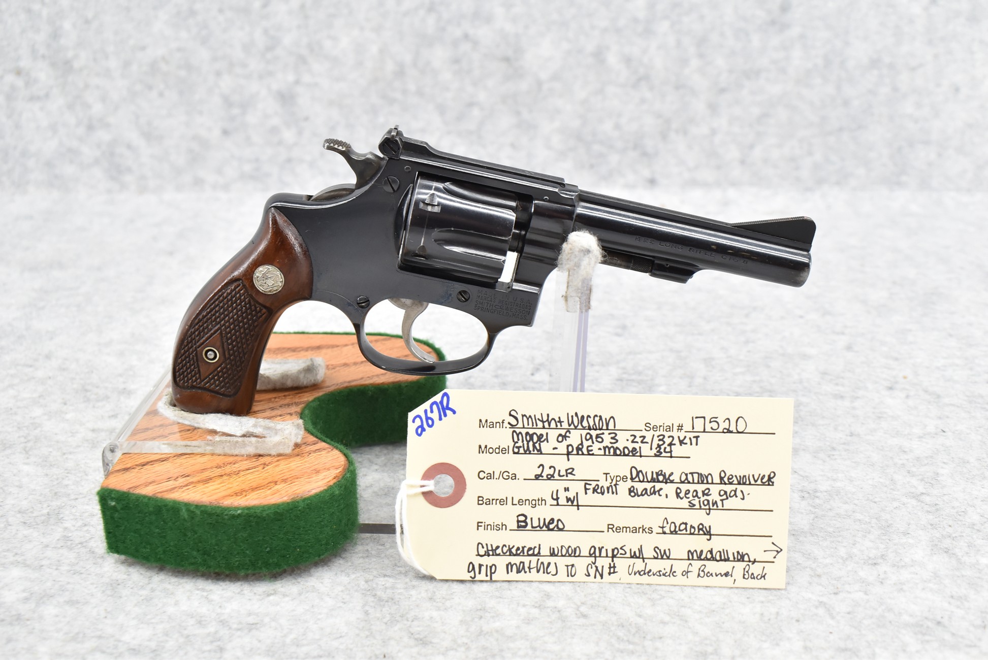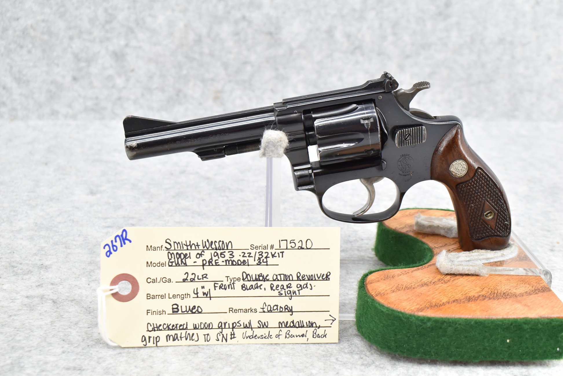 267R. Smith & Wesson – Modl of 1953 .22/32 Kit Gun-Pre-Model 34 – 22LR Cal. Double Action Revolver – w/4” Barrel w/Front Blade & Rear Adj. Sights – Blued Finish – w/Factory Checkered Wood Grips w/S&W Medallion That Match to Serial Number – Underside of Barrel, Back of Cylinder & Butt Numbers All Match! – Mfg. Between 1953-1969