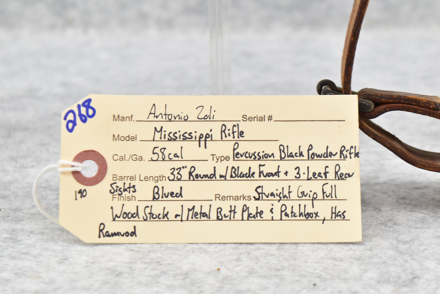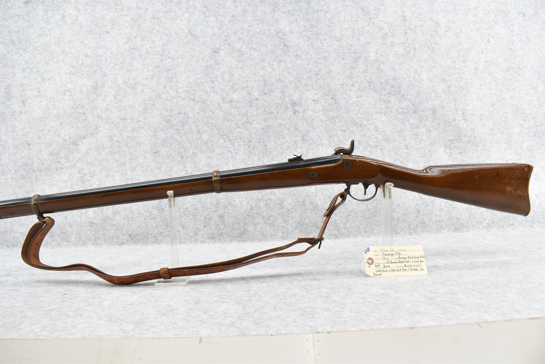 268. Antonio Zoli – Mod. Mississippi Rifle – 58 Cal. Black Powder Percussion Rifle – w/33” Round Barrel w/Blade Front & 3-Leaf Rear Sights – Blued Finish – w/Straight Grip Full Wood Stock w/Metal Butt Plate & Patch Box – w/Ram Rod