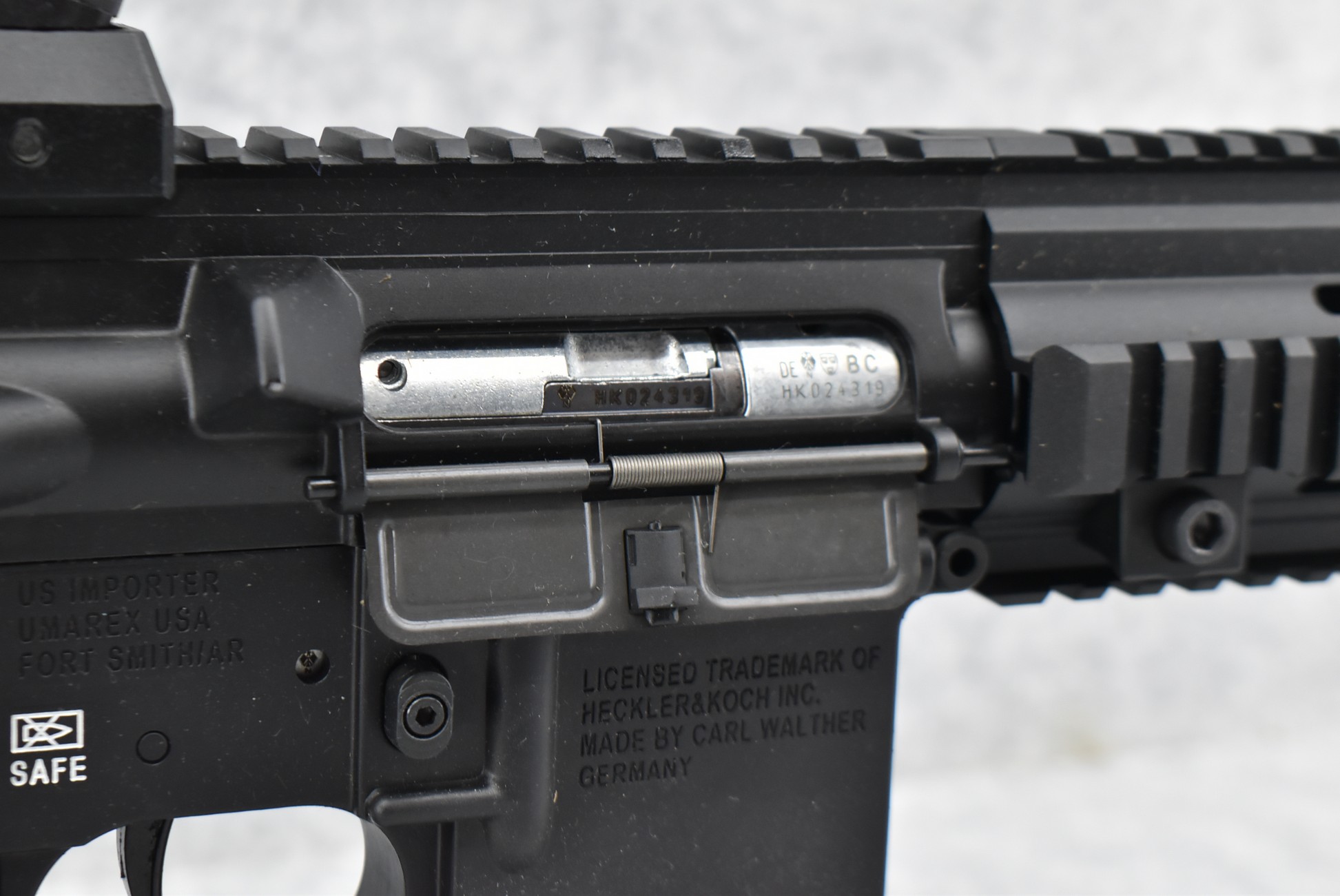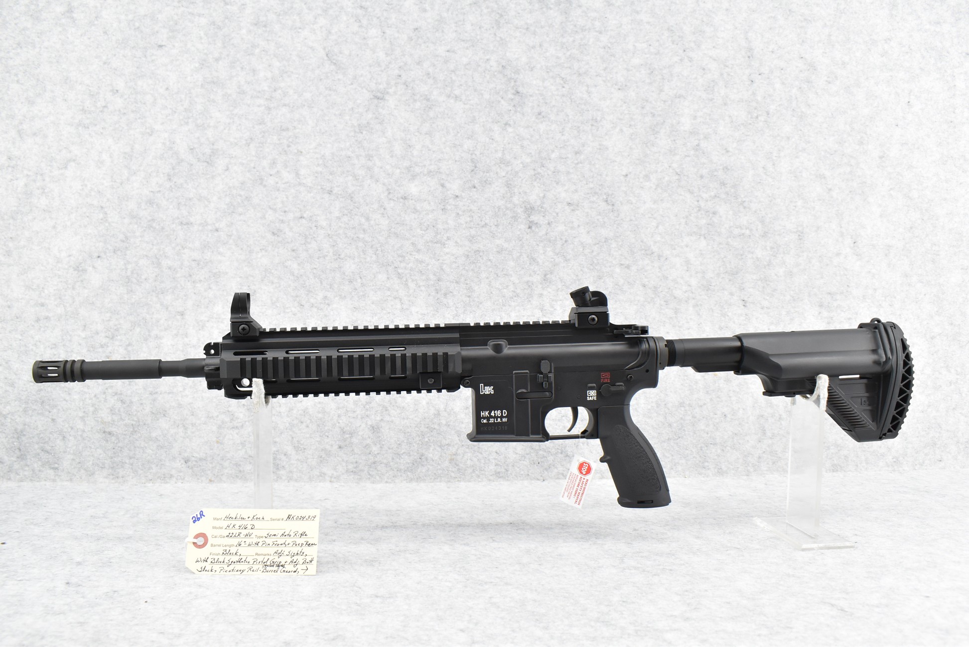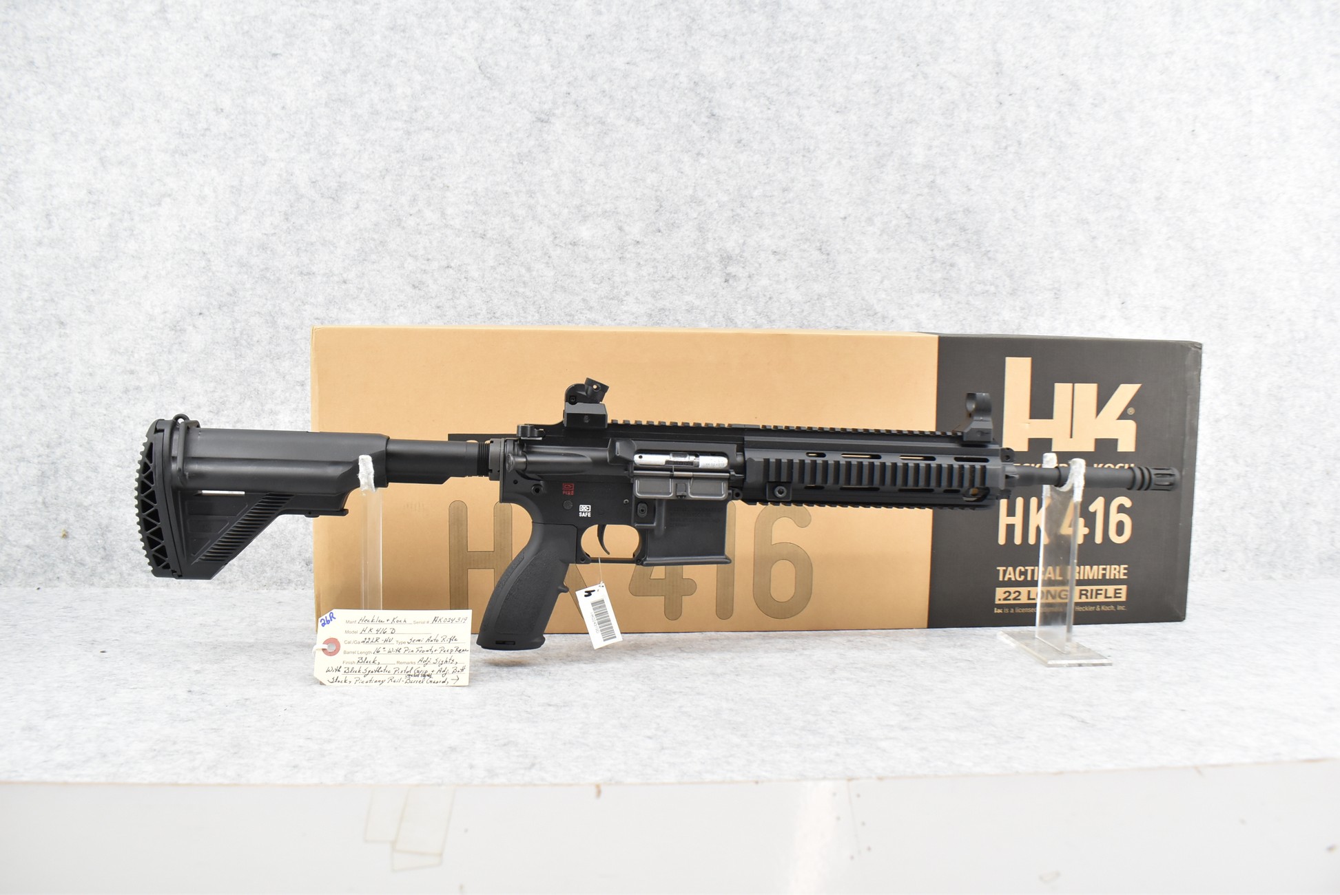 26R. Heckler & Koch – Mod. HK 416D – 22LR-HV Cal. Semi-Auto Rifle – w/16” Barrel w/Pin Front & Peep Rear Adj. Sights – Matte Black Finish – w/Black Synthetic Pistol Grip & Adj. Butt Stock w/Vented Hand Guard – w/Picatinny Rails – No Mag – Unfired w/Box