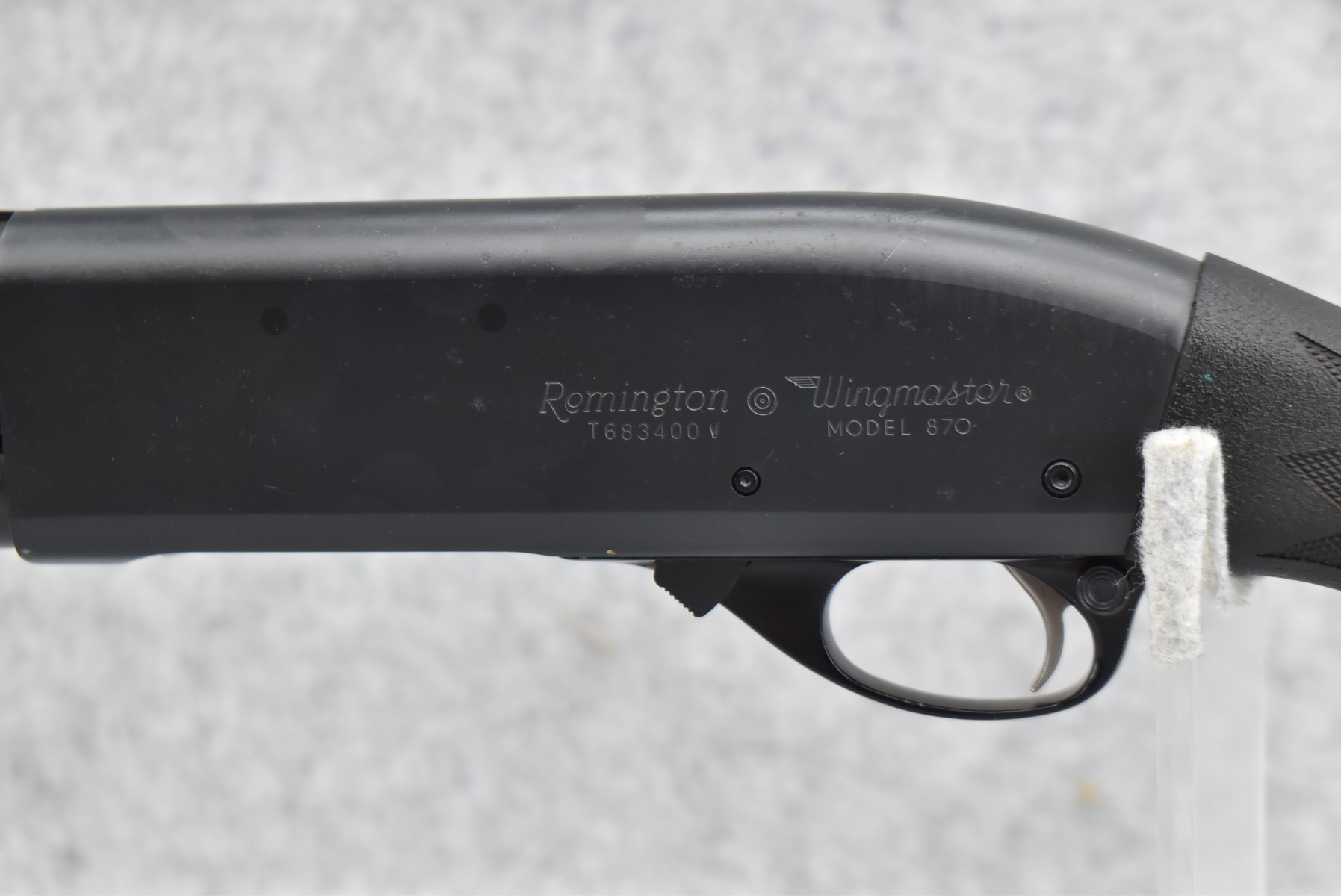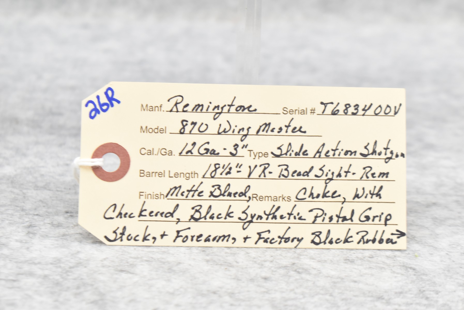 26R. Remington – Mod. 870 Wingmaster – 12ga. 3” Pump Action Shotgun – w/18½” Rem. Choked Vent Rib Barrel w/Bead Sight – Matte Blued Finish – w/Checkered Black Synthetic Pistol Grip Stock and Forearm w/Factory Black Rubber Butt Pad