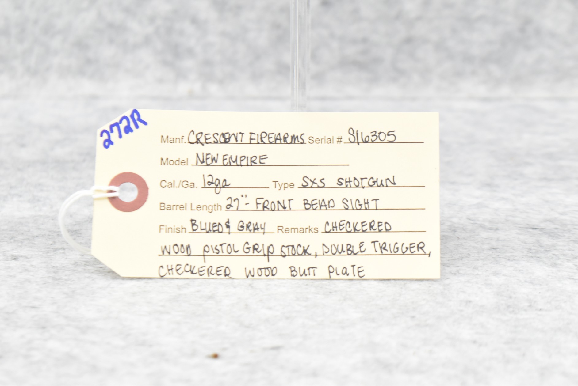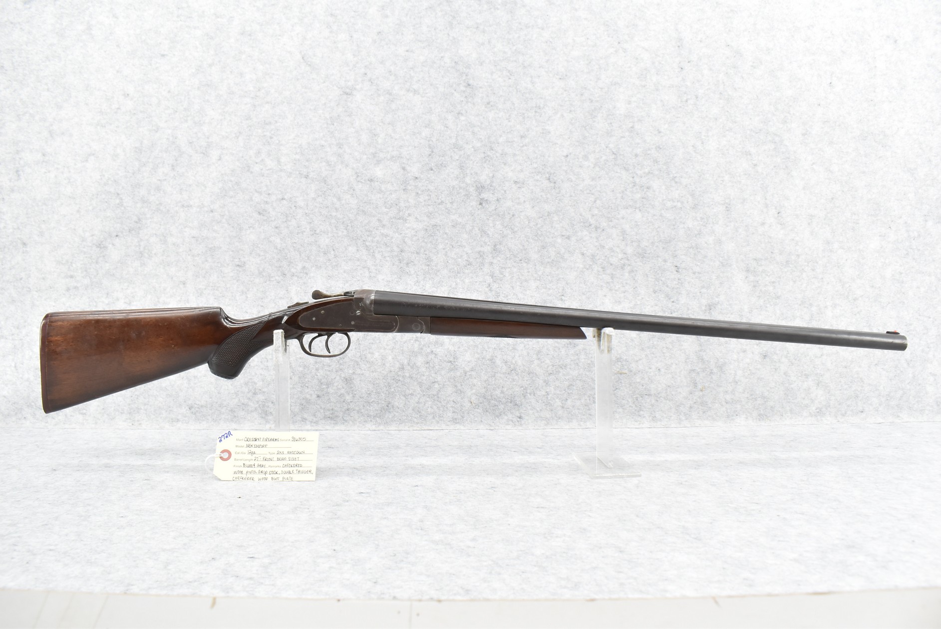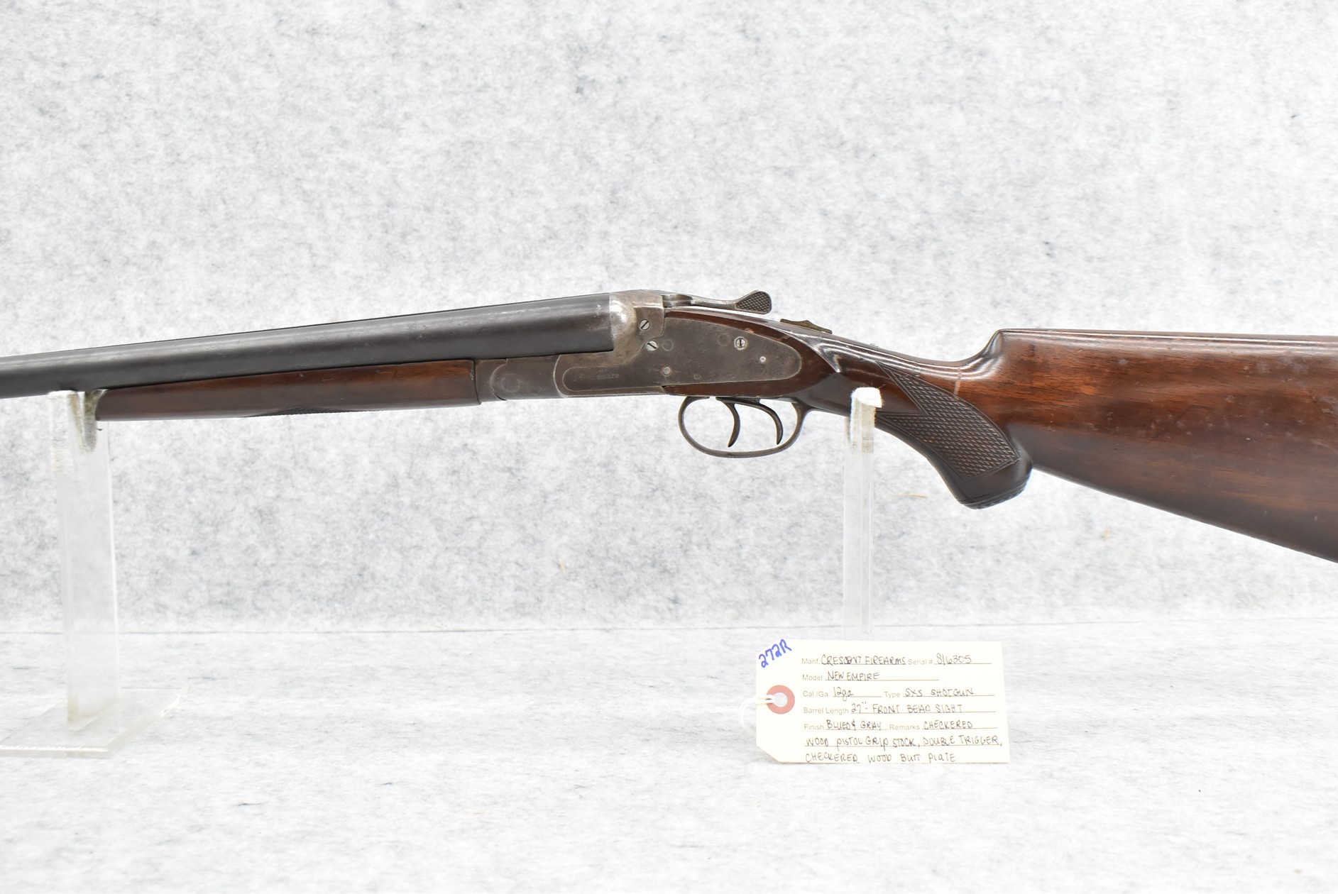 272R. Crescent Firearms – Mod. New Empire – 12ga. Double Barrel Shotgun – w/27” Barrel w/Front Bead Sight – Blued/Gray Finish – w/Checkered Wood Pistol Grip Stock w/Checkered Wood Butt Plate – w/Double Triggers
