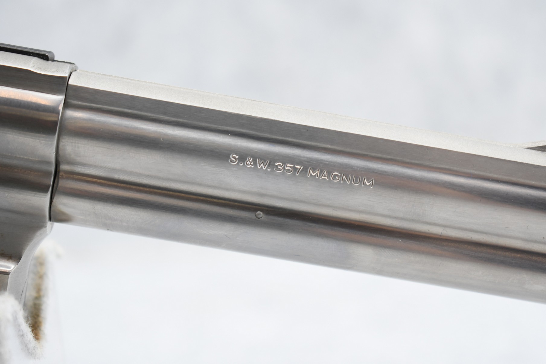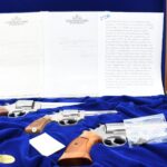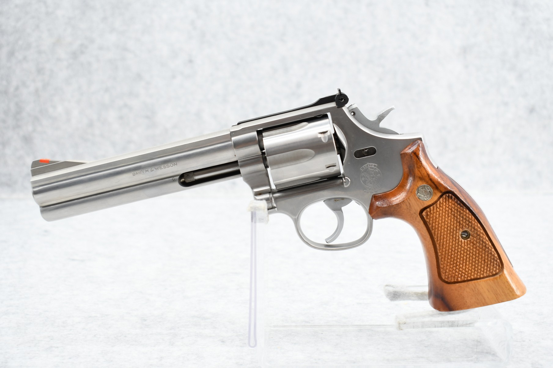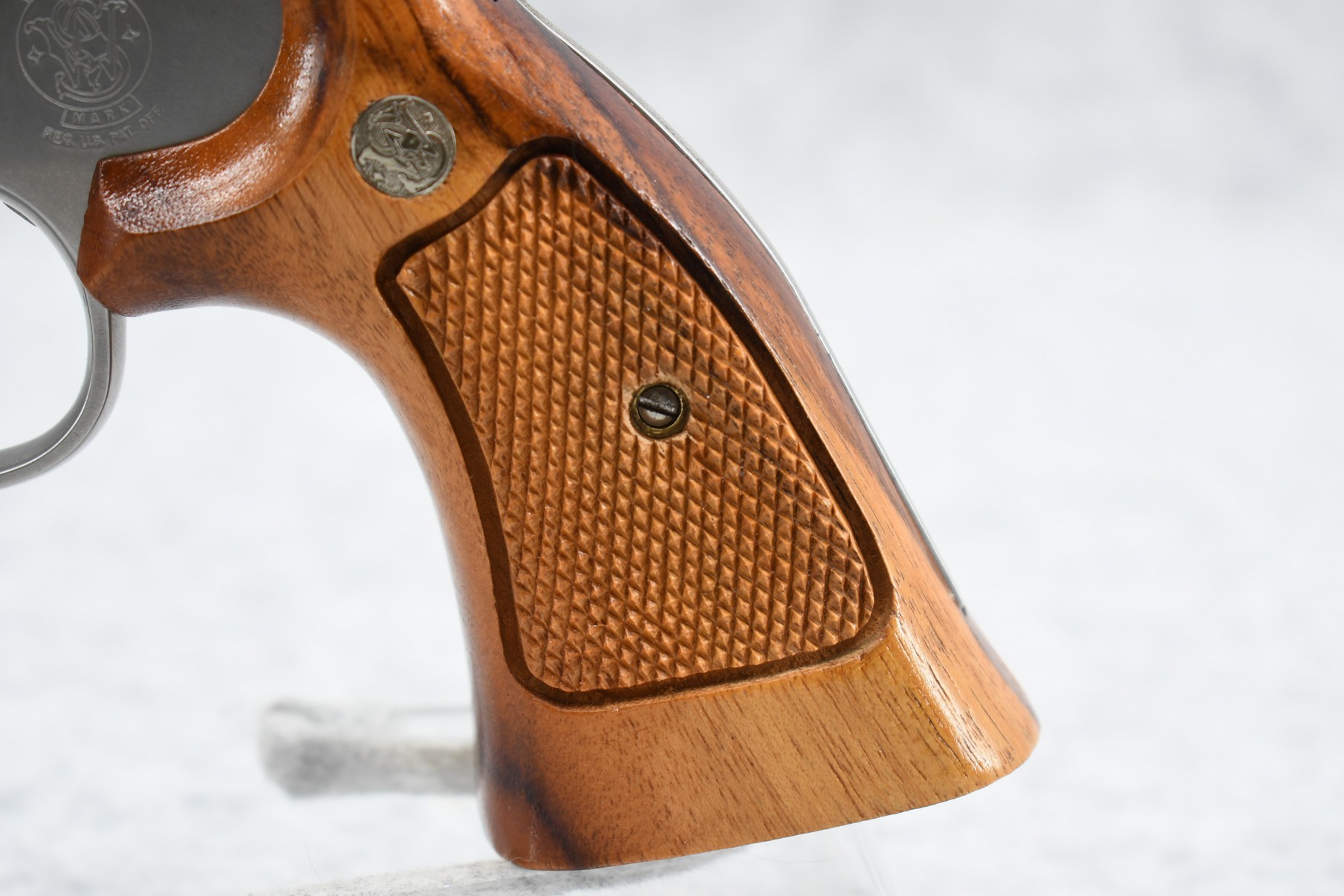 272R. Smith & Wesson 3-Gun Cased Set of Double Action Revolvers – The First Gun is a Smith & Wesson Model 629-1 44 Mag. Cal. Double Action Revolver w/6” Barrel w/Orange Ramp Front and Adjustable Rear Sights, Stainless Finish, Smith & Wesson Checkered Target Wood Grips, w/Target Hammer, Target Trigger, and Target Grips (3 T’s) – The Second Gun is a Smith & Wesson Model 63 22LR Cal. Double Action Revolver w/4” Barrel w/Orange Ramp Front and Adjustable Rear Sights, Stainless Finish, and Smith & Wesson Checkered Wood Grips – The Third Gun is a Smith & Wesson Model 586 or 686 357 Mag. Cal. Double Action Revolver w/6” Barrel w/Orange Ramp Front and Adjustable Rear Sights, Stainless Finish, and Smith & Wesson Checkered Target Wood Grips (Currently the Screw that Holds the Cylinder Latch is Snapped, So we Cannot Open the Cylinder to Verify the Model), The Latch is Present – The First and Second Gun Appear to be Unfired and the Third Gun is Potentially Unfired As Well – All Three Guns are in a Large Walnut Presentation Case with a Blue Felt Liner and Keys – These Guns were Commissioned to Smith & Wesson by the “First Bank & Trust Harrisburg, Ill.” as an Incentive to Get Their Customers to Invest $5,000.00 or More for a 5-Year Term