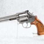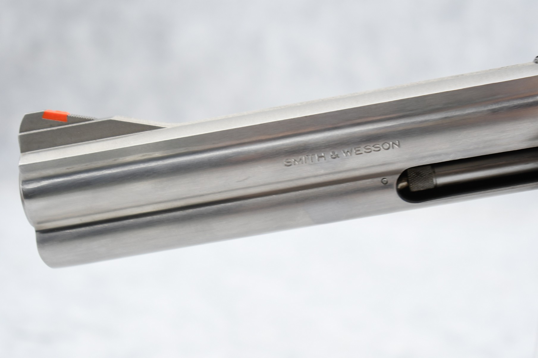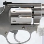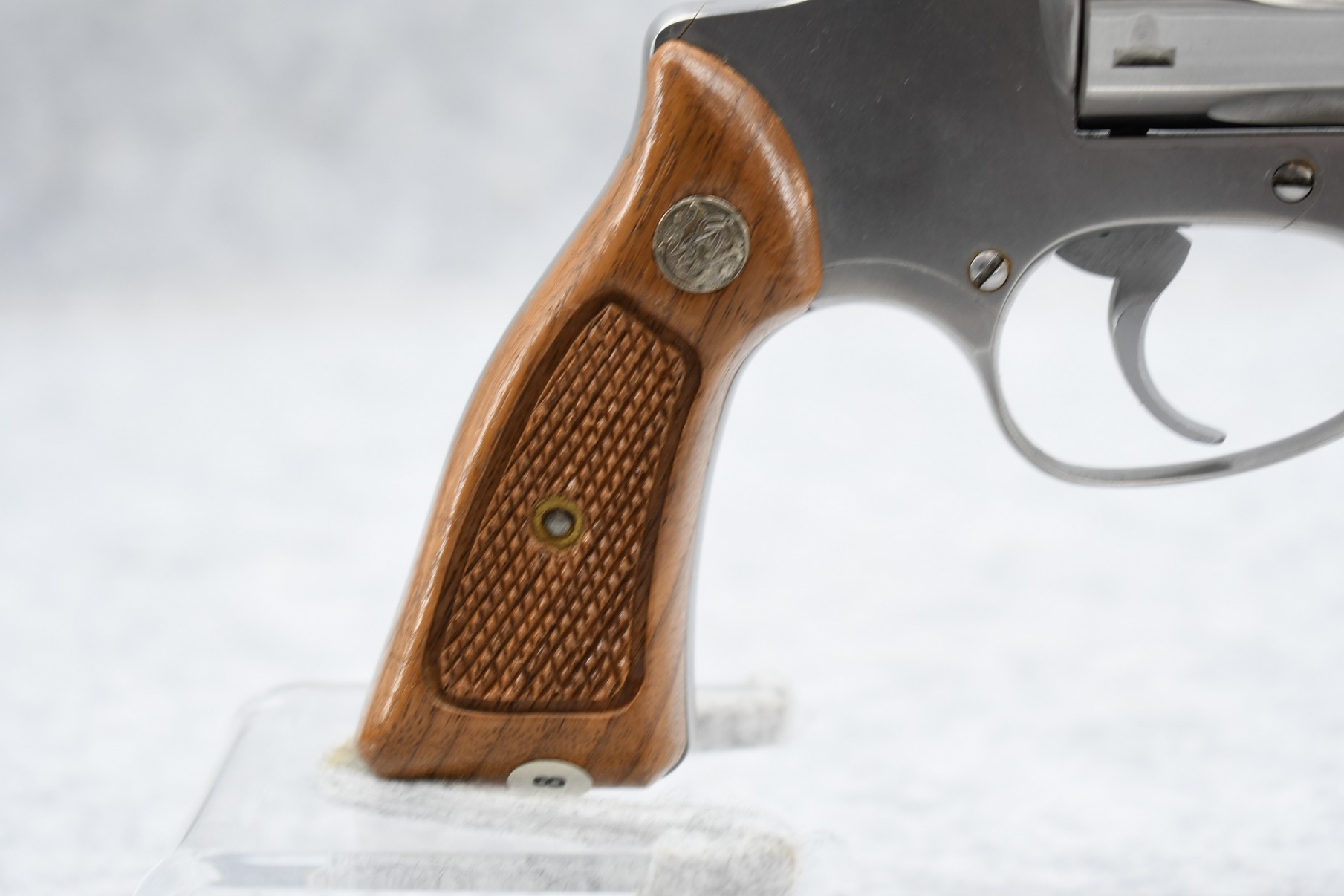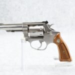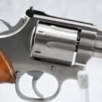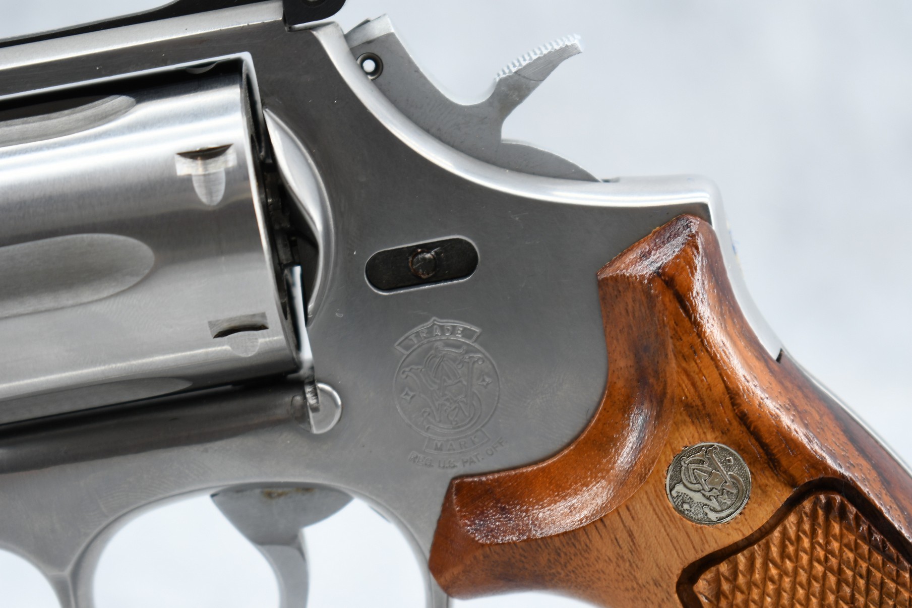 272R. Smith & Wesson 3-Gun Cased Set of Double Action Revolvers – The First Gun is a Smith & Wesson Model 629-1 44 Mag. Cal. Double Action Revolver w/6” Barrel w/Orange Ramp Front and Adjustable Rear Sights, Stainless Finish, Smith & Wesson Checkered Target Wood Grips, w/Target Hammer, Target Trigger, and Target Grips (3 T’s) – The Second Gun is a Smith & Wesson Model 63 22LR Cal. Double Action Revolver w/4” Barrel w/Orange Ramp Front and Adjustable Rear Sights, Stainless Finish, and Smith & Wesson Checkered Wood Grips – The Third Gun is a Smith & Wesson Model 586 or 686 357 Mag. Cal. Double Action Revolver w/6” Barrel w/Orange Ramp Front and Adjustable Rear Sights, Stainless Finish, and Smith & Wesson Checkered Target Wood Grips (Currently the Screw that Holds the Cylinder Latch is Snapped, So we Cannot Open the Cylinder to Verify the Model), The Latch is Present – The First and Second Gun Appear to be Unfired and the Third Gun is Potentially Unfired As Well – All Three Guns are in a Large Walnut Presentation Case with a Blue Felt Liner and Keys – These Guns were Commissioned to Smith & Wesson by the “First Bank & Trust Harrisburg, Ill.” as an Incentive to Get Their Customers to Invest $5,000.00 or More for a 5-Year Term