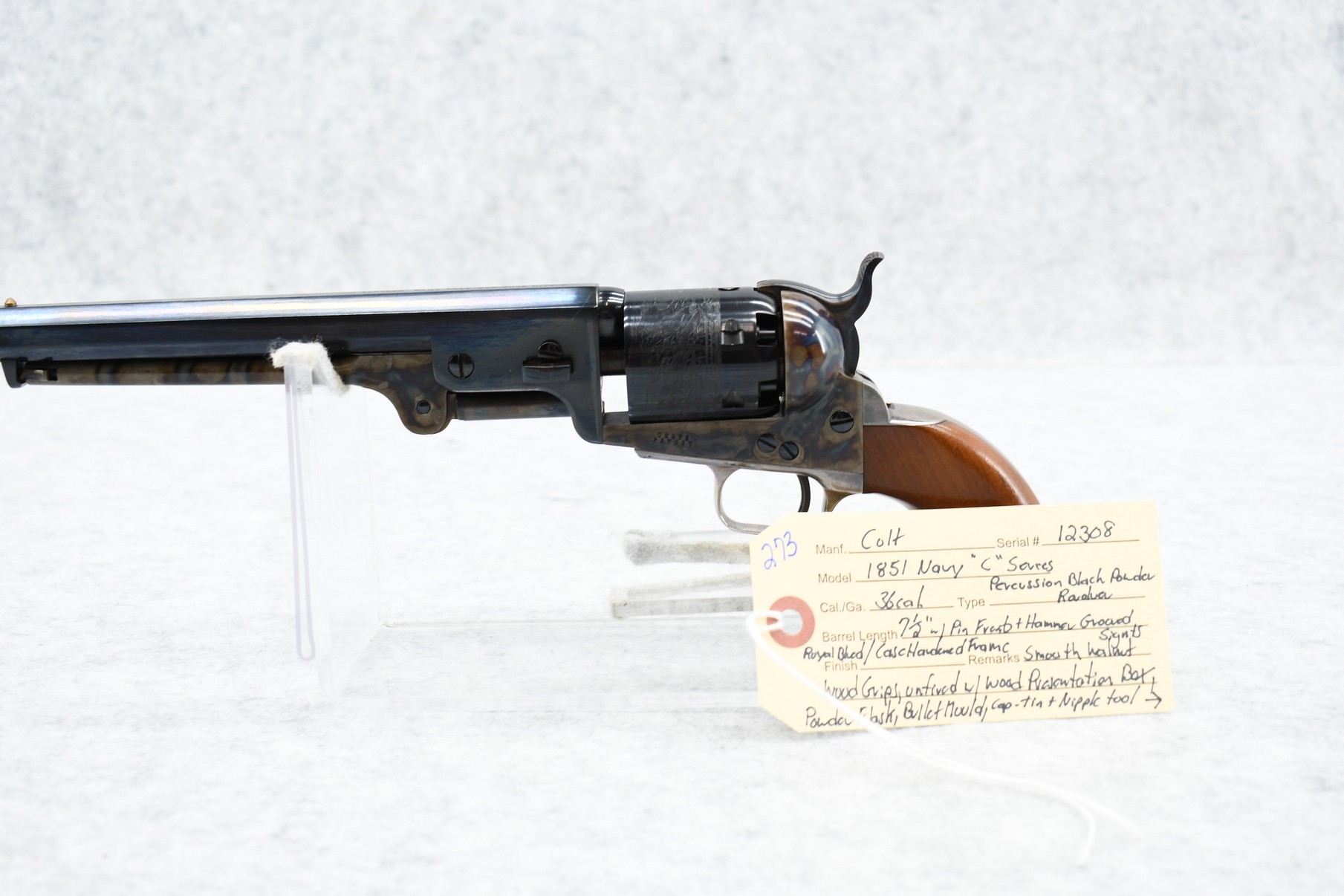 273. Colt – Mod. 1851 Navy “C” Series – 36 Cal. Percussion Black Powder Revolver – w/7 ½” Barrel w/Pin Front & Hammer Grooved Sights – Royal Blued Finish Case Hardened Frame – w/Smooth Walnut Wood Grips – Unfired w/Wood Presentation Box, Powder Flask, Bullet Mold, Cap Tin & Nipple Tool – Mfg. Between 1971-1978