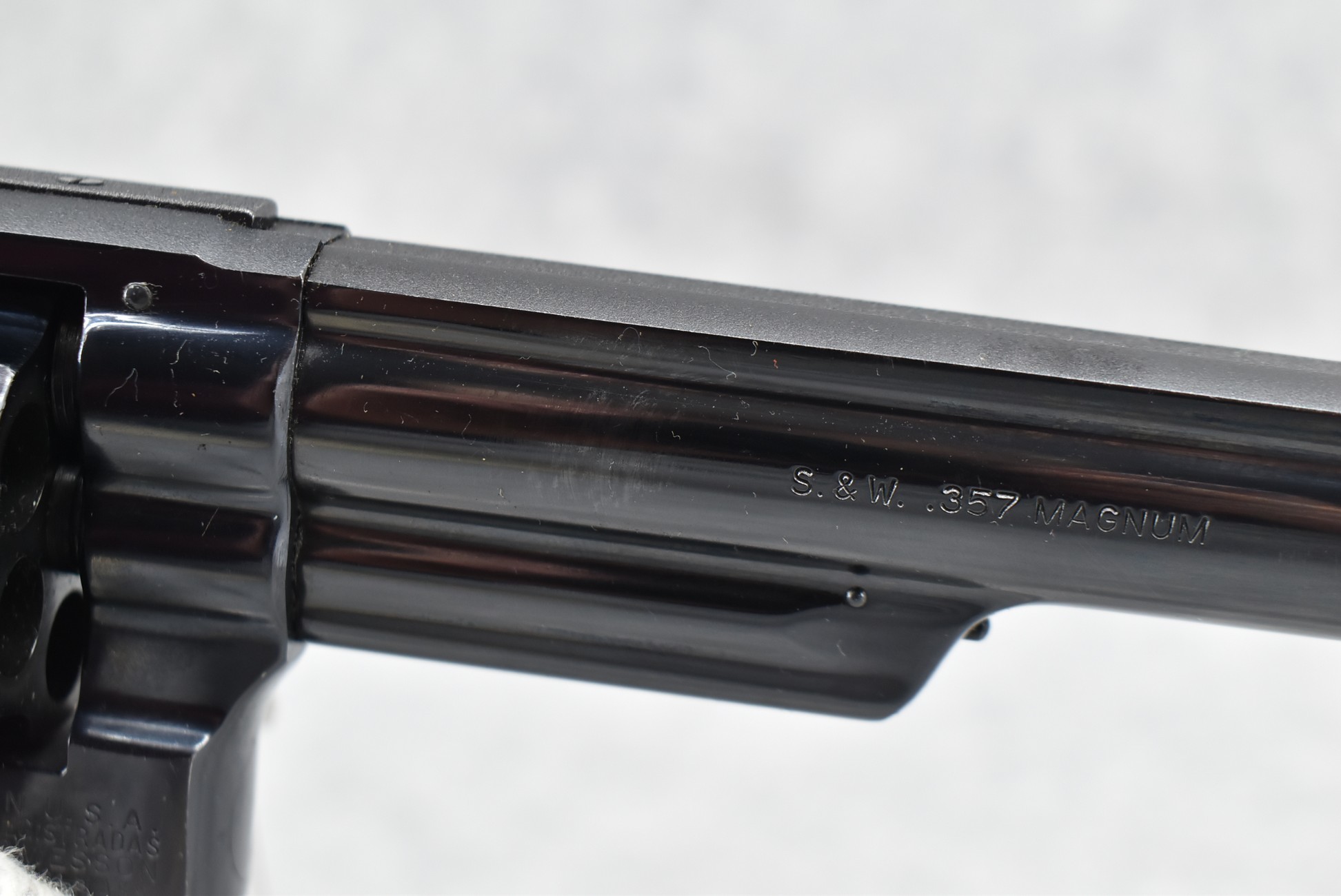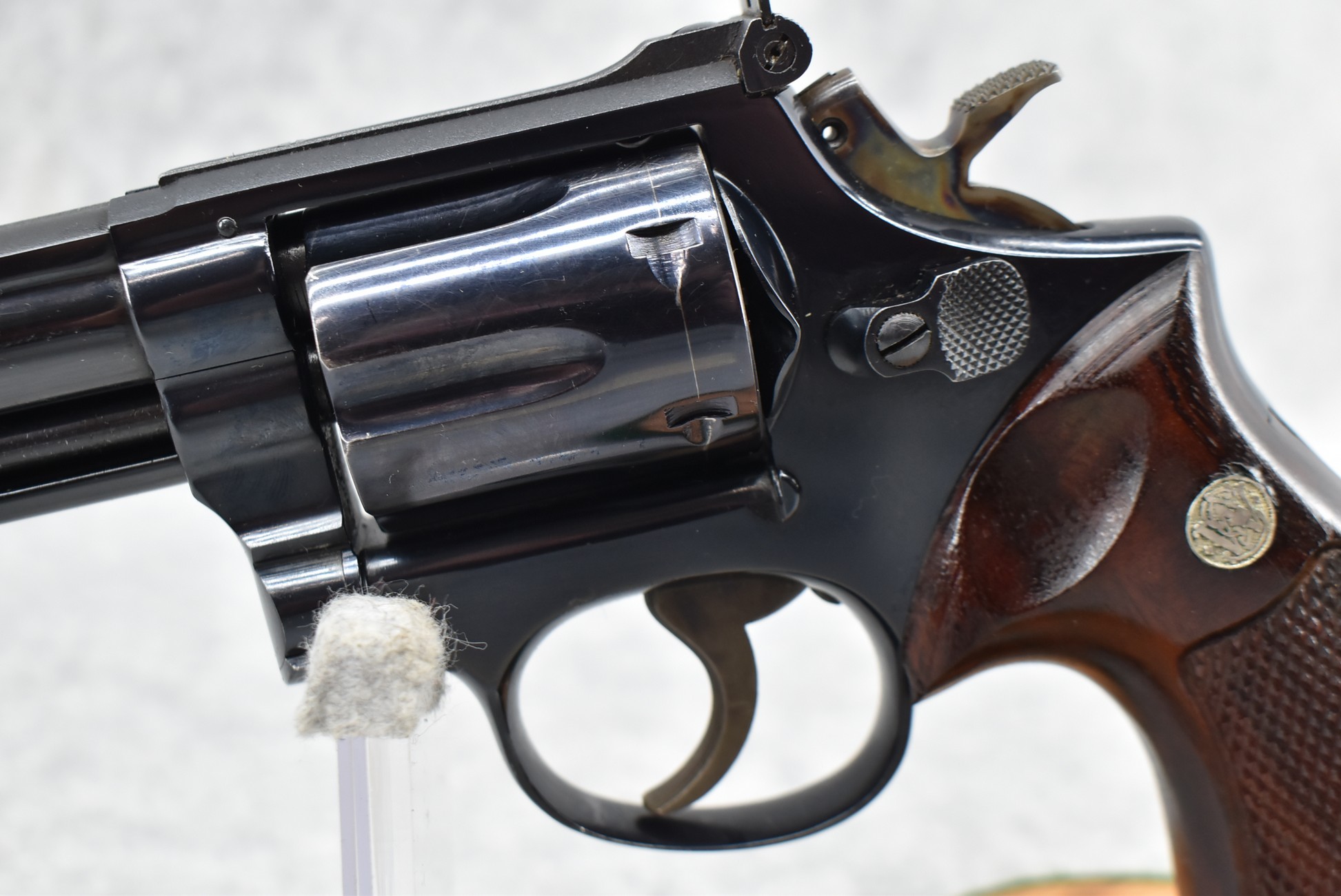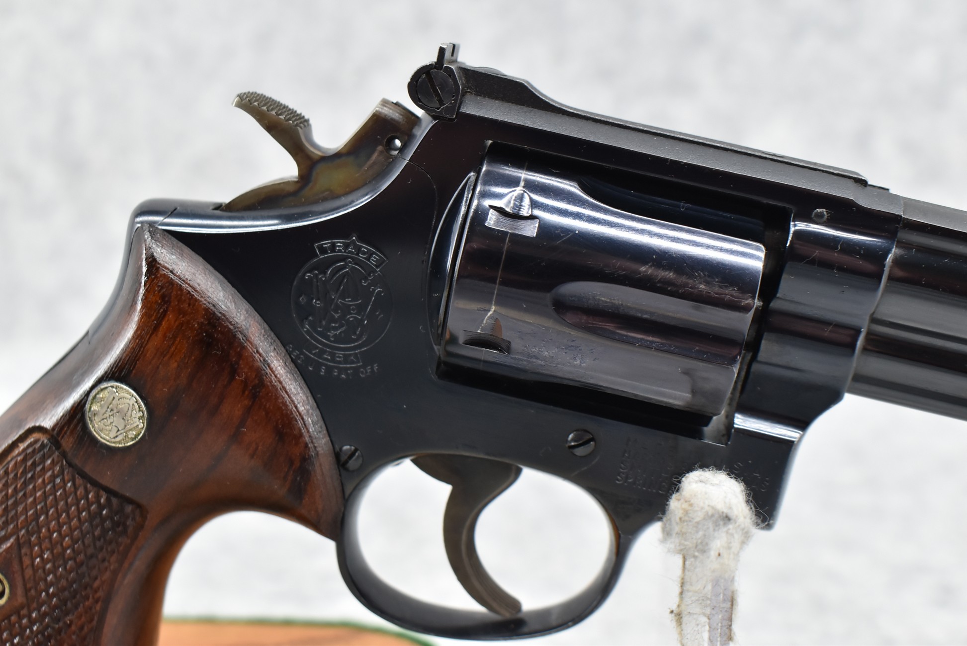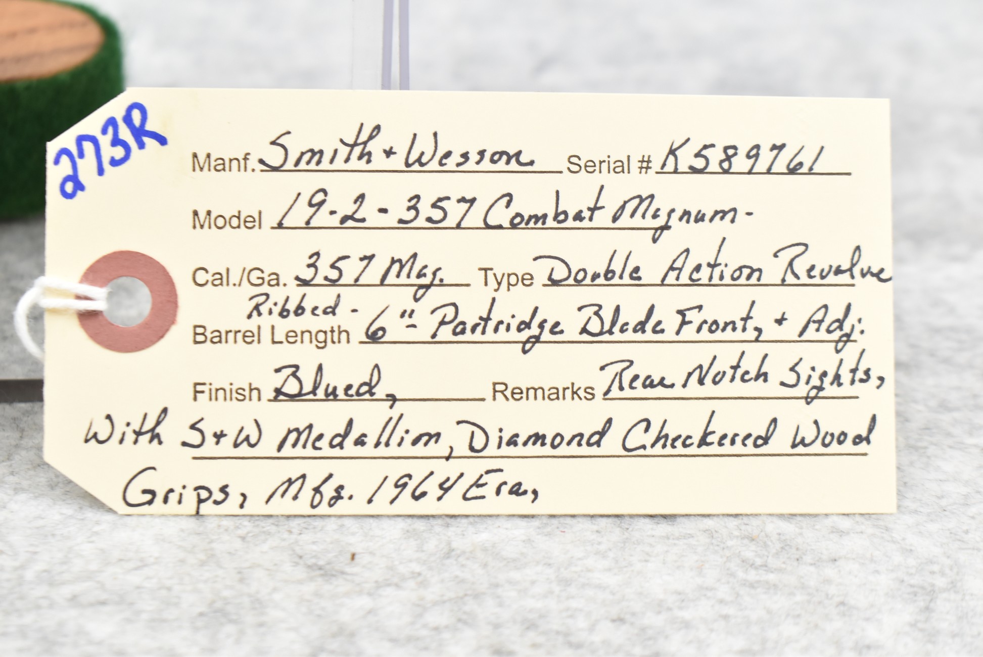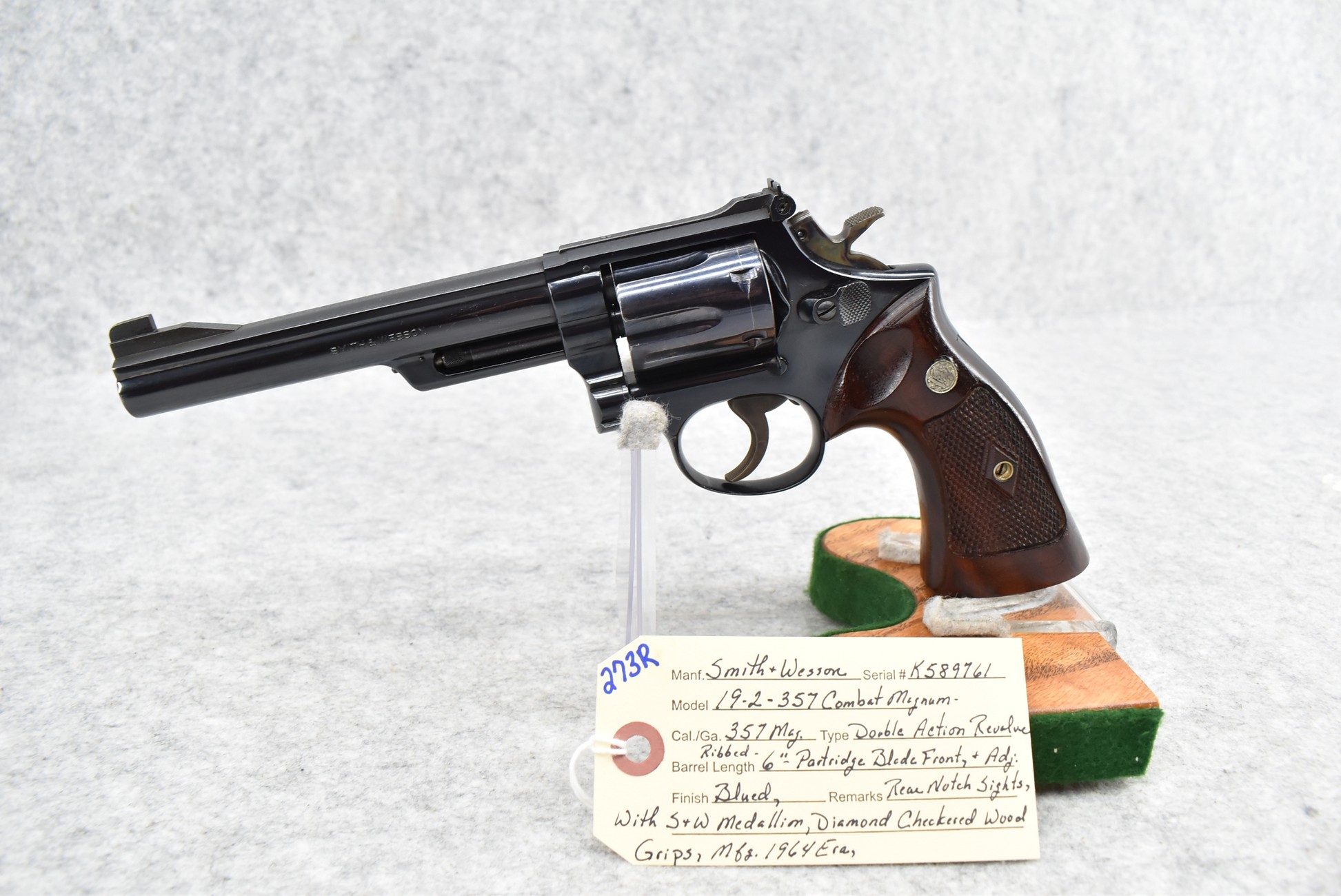 273R. Smith & Wesson – Mod. 19-2 357 Combat Magnum – 357 Mag. Cal. Double Action Revolver – w/6” Ribbed Barrel w/Partridge Blade Front & Adj. Rear Notch Sights – Blued Finish w/S&W Medallion Diamond Checkered Wood Grips