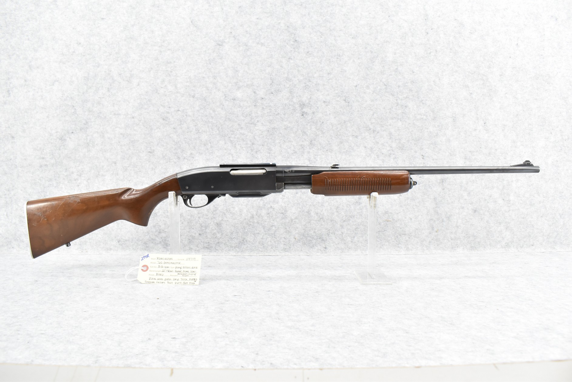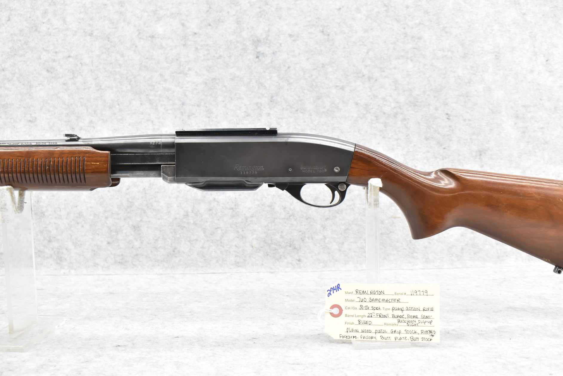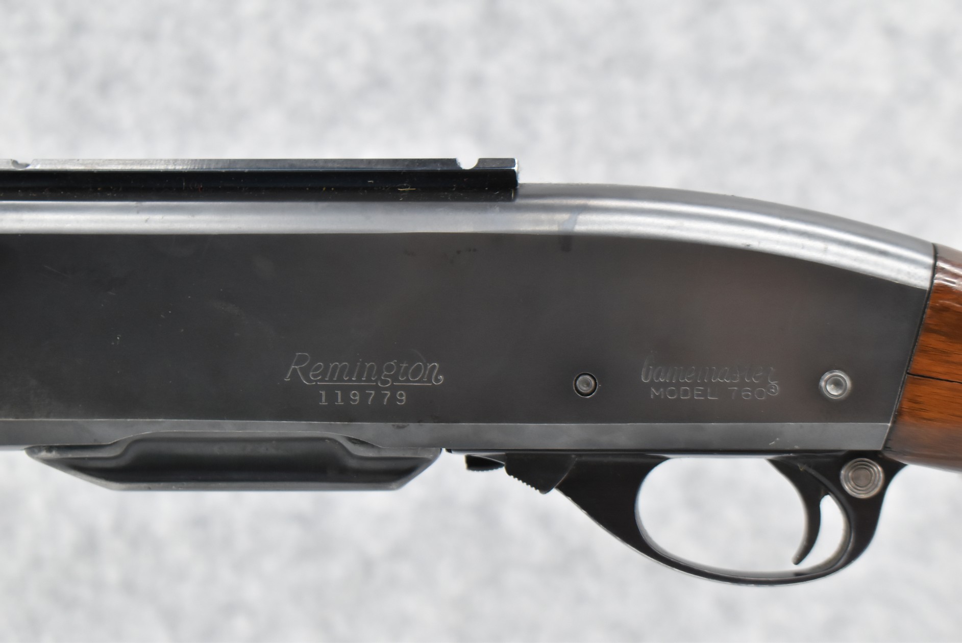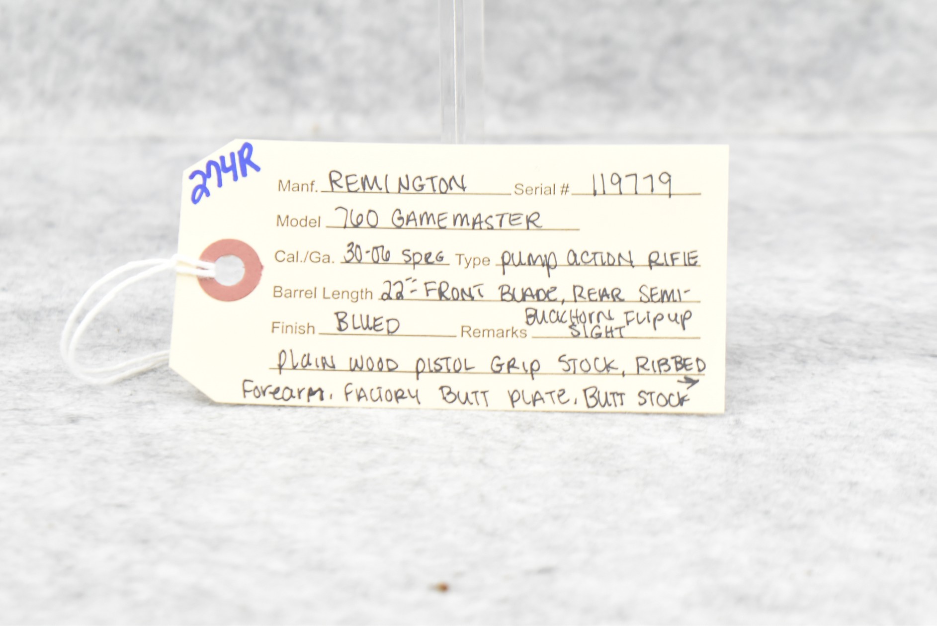 274R. Remington – Mod. 760 Gamemaster – 30-06 Sprg. Cal. Pump Action Rifle – w/22” Barrel w/Front Blade & Rear Semi-Buck Horn Flip Up Sight – Blued Finish – w/Plain Wood Pistol Grip Stock w/Factory Butt Plate & Corn Cob Forearm – w/Factory Mag – Note: Butt Stock Cracked at Pistol Grip