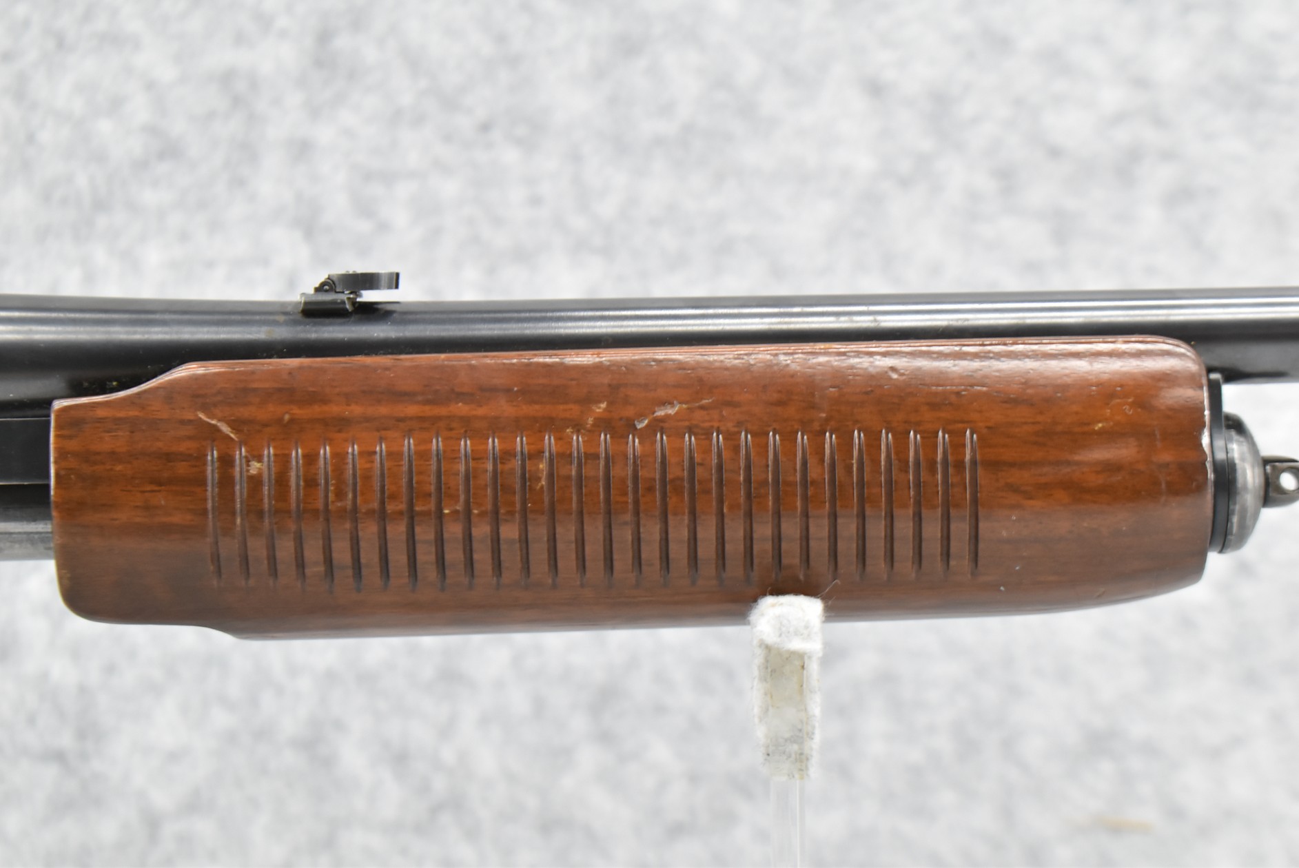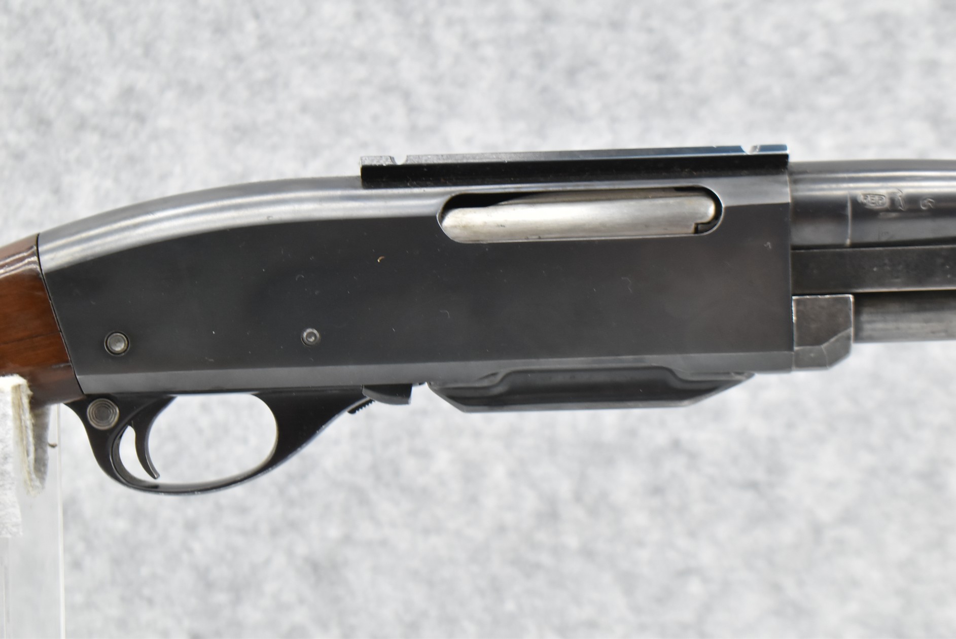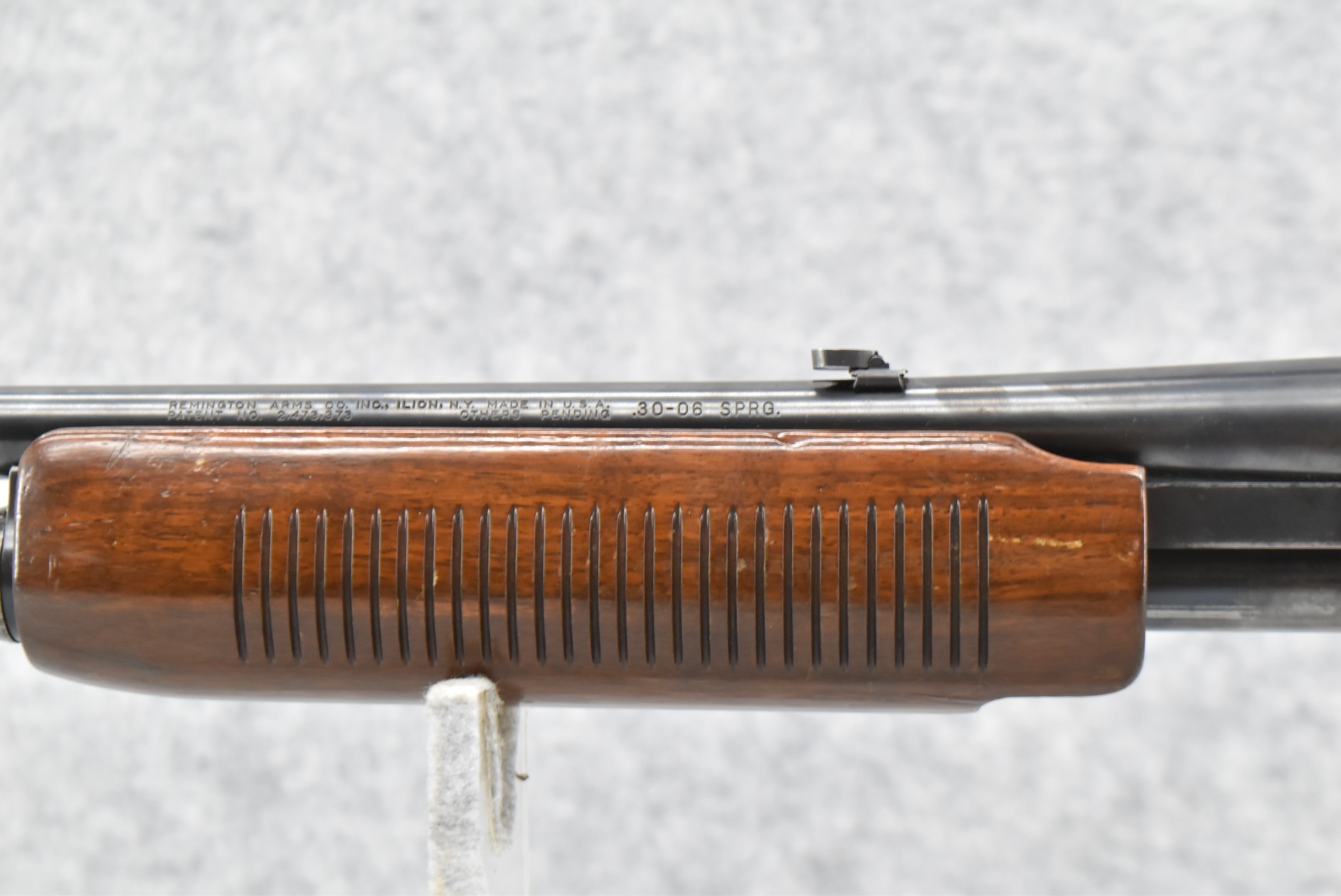 274R. Remington – Mod. 760 Gamemaster – 30-06 Sprg. Cal. Pump Action Rifle – w/22” Barrel w/Front Blade & Rear Semi-Buck Horn Flip Up Sight – Blued Finish – w/Plain Wood Pistol Grip Stock w/Factory Butt Plate & Corn Cob Forearm – w/Factory Mag – Note: Butt Stock Cracked at Pistol Grip