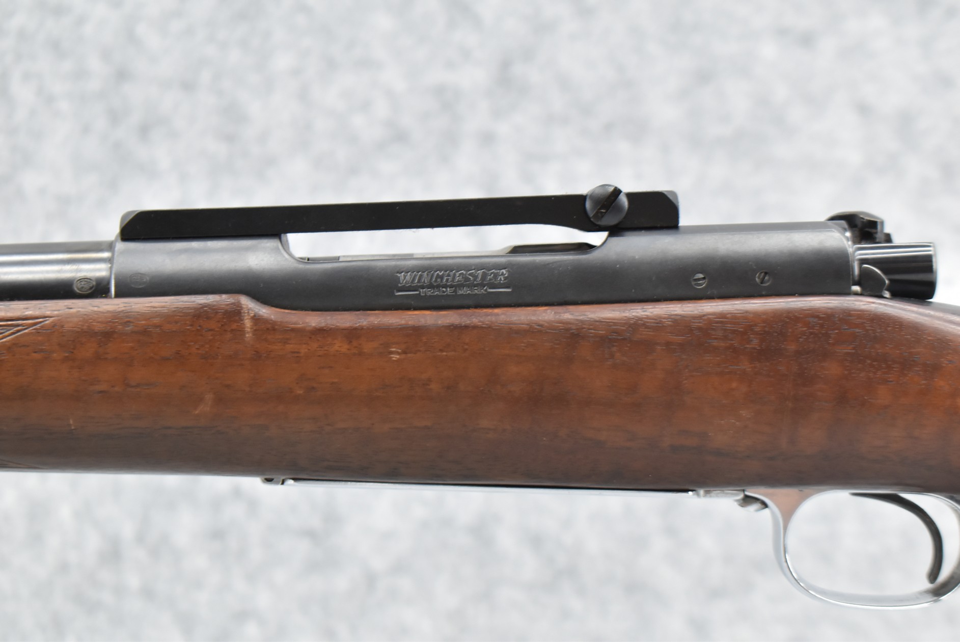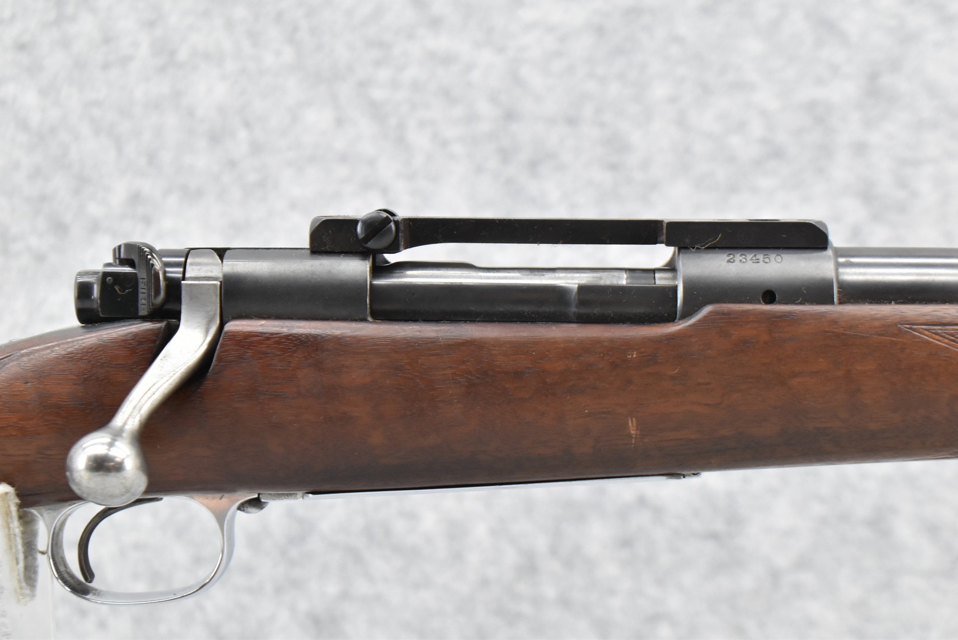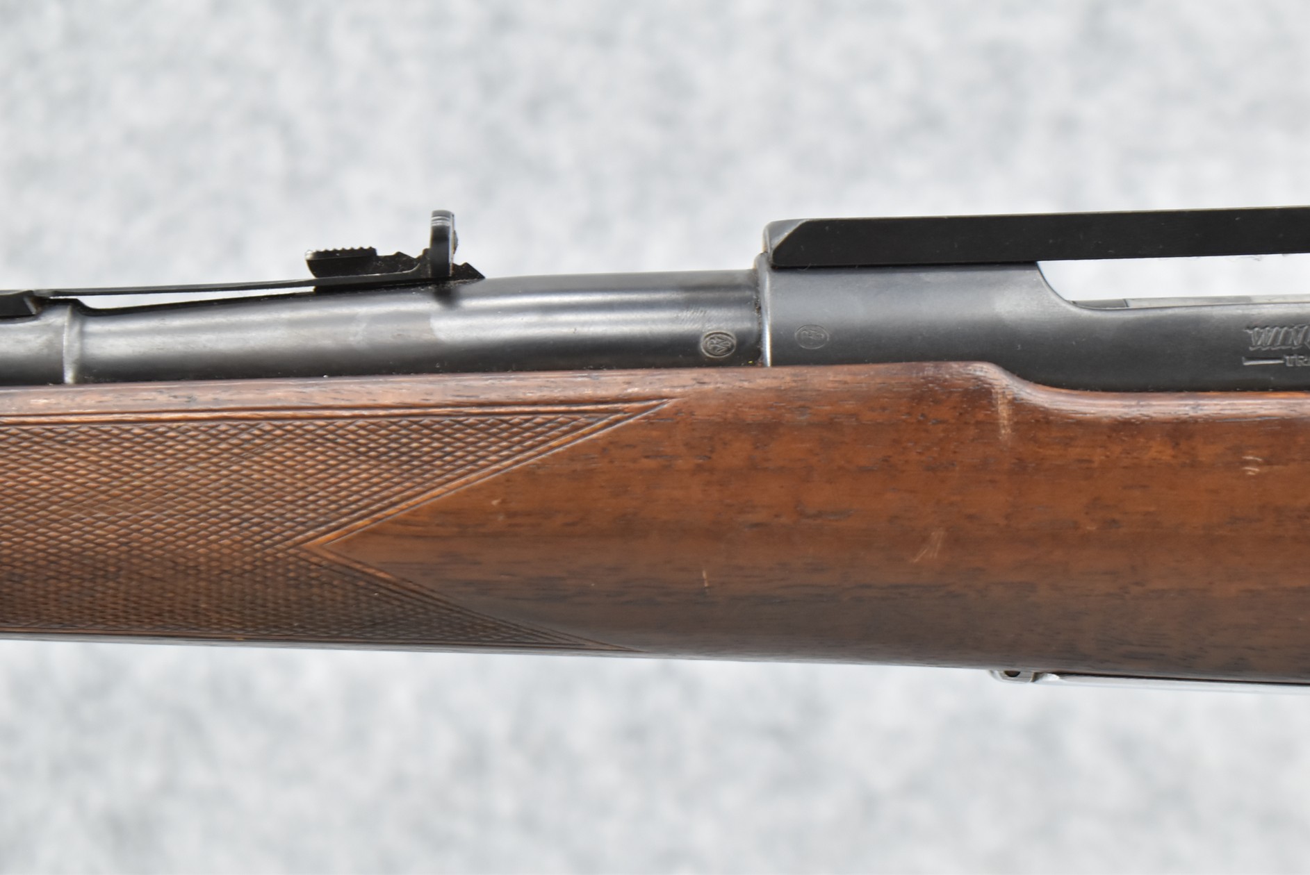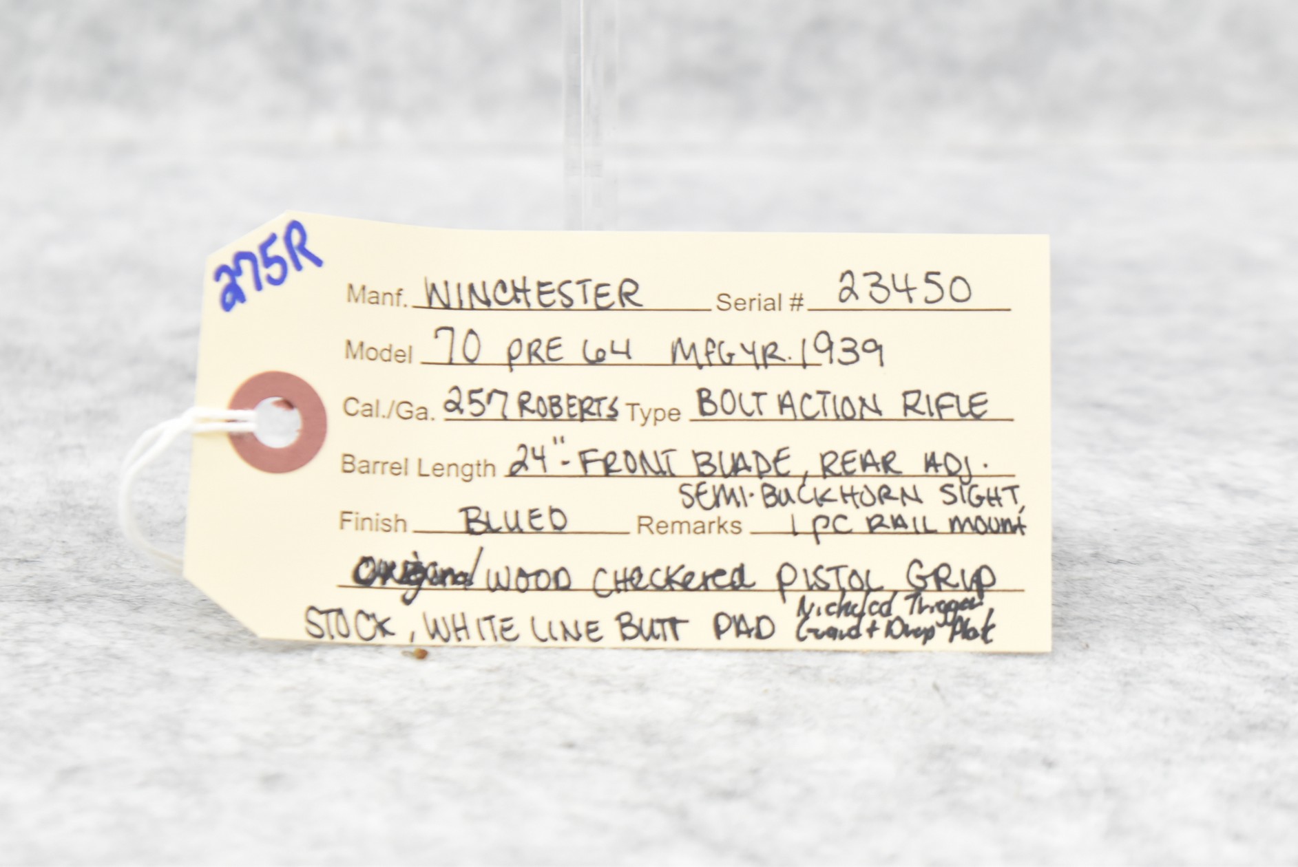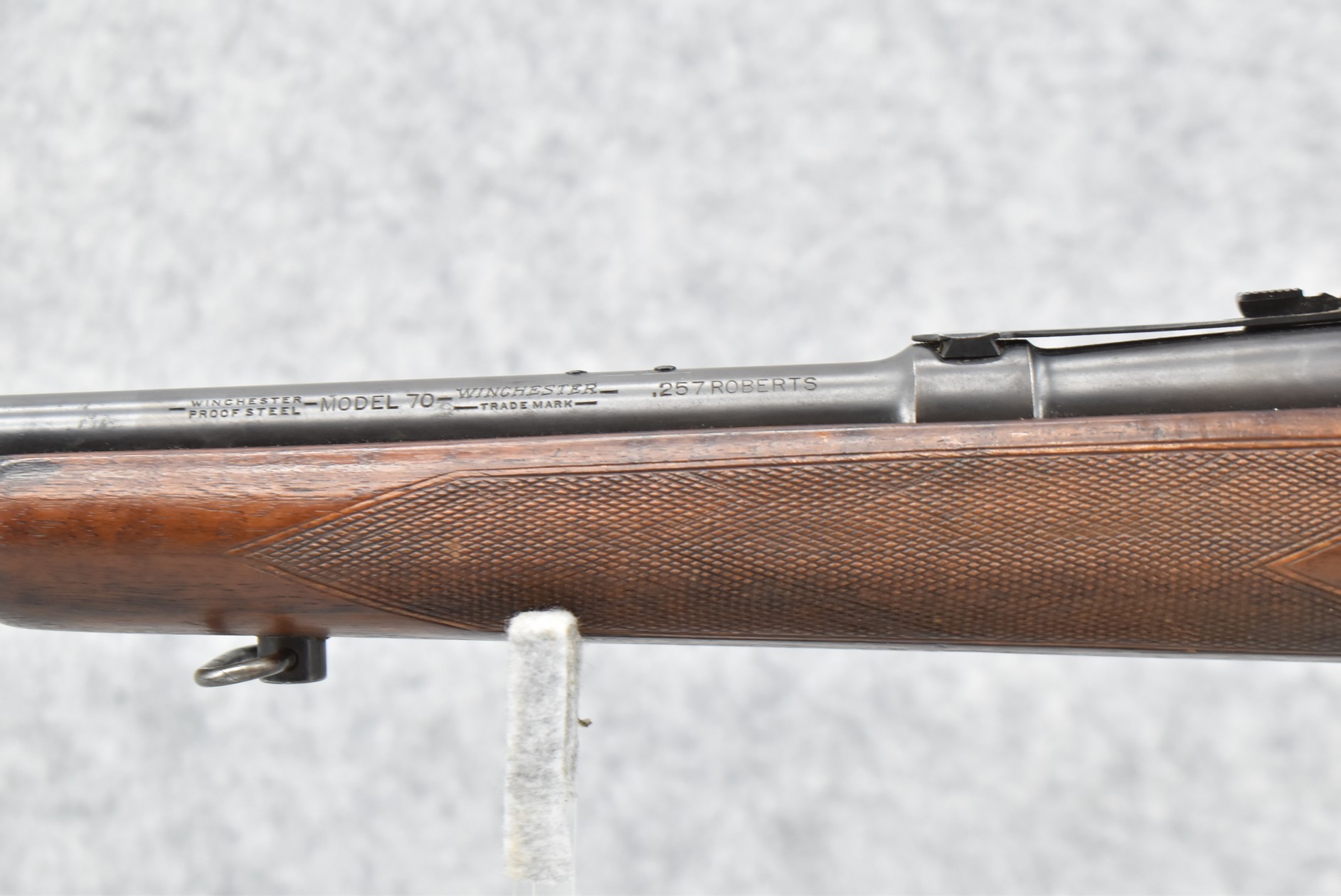 275R. Winchester – Mod. 70 (Pre-64) – 257 Roberts Cal. Bolt Action Rifle – w/24” Barrel w/Front Blade & Rear Adj. Semi-Buckhorn Sights – Blued Finish – w/Nickeled Trigger Guard & Drop Plate – w/Original Wood Checkered Pistol Grip Stock w/White Line Butt Pad – w/1pc. Scope Base – Mfg. 1939