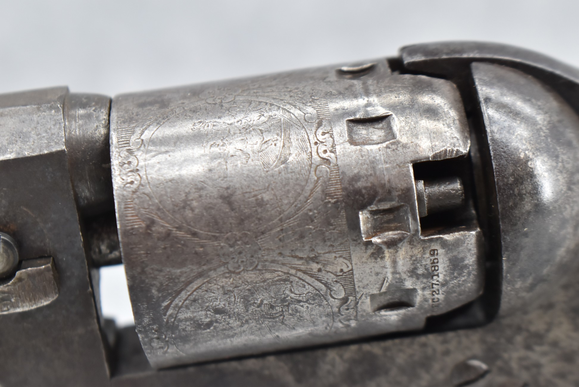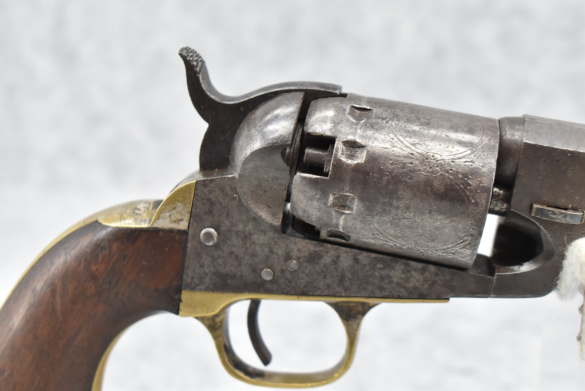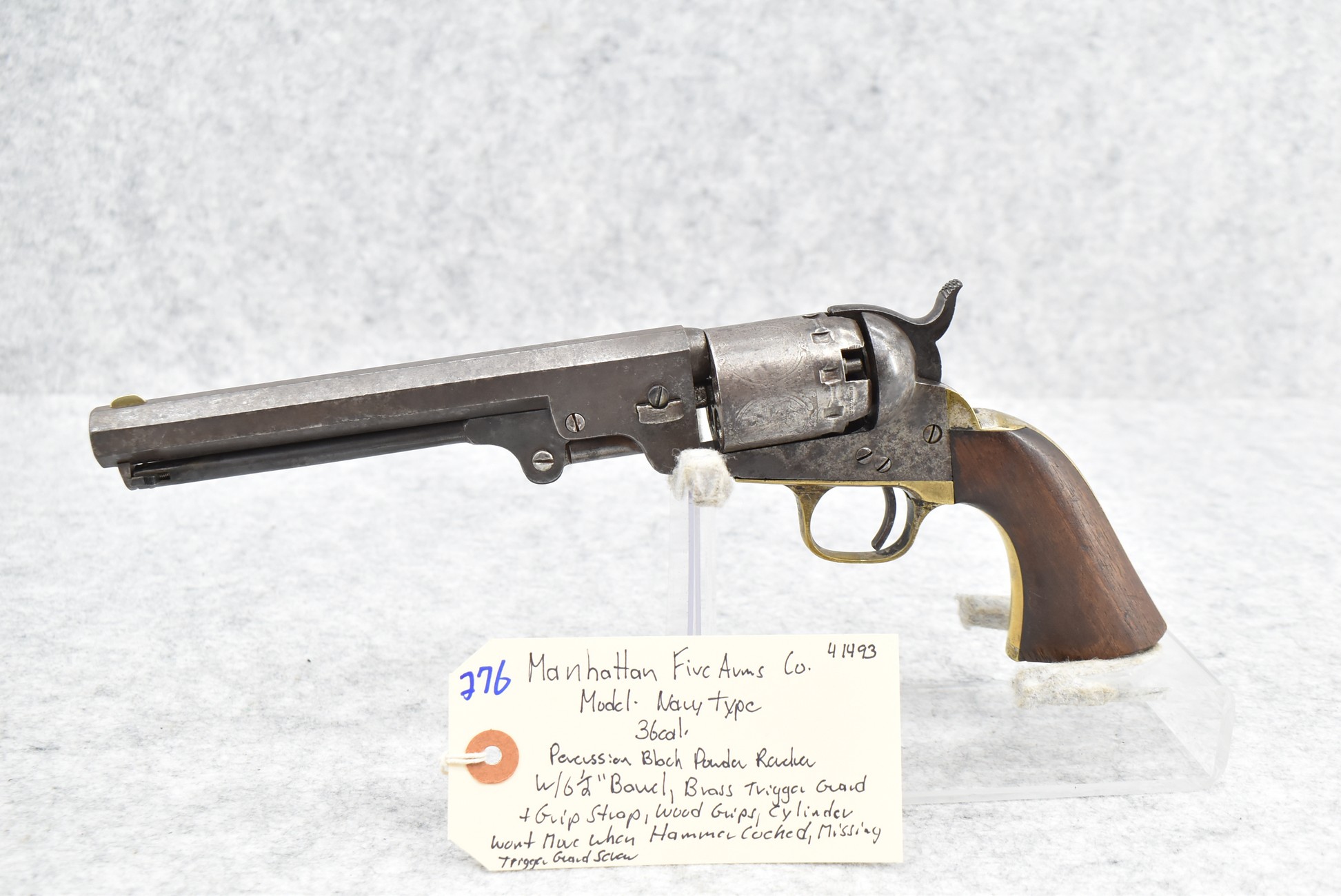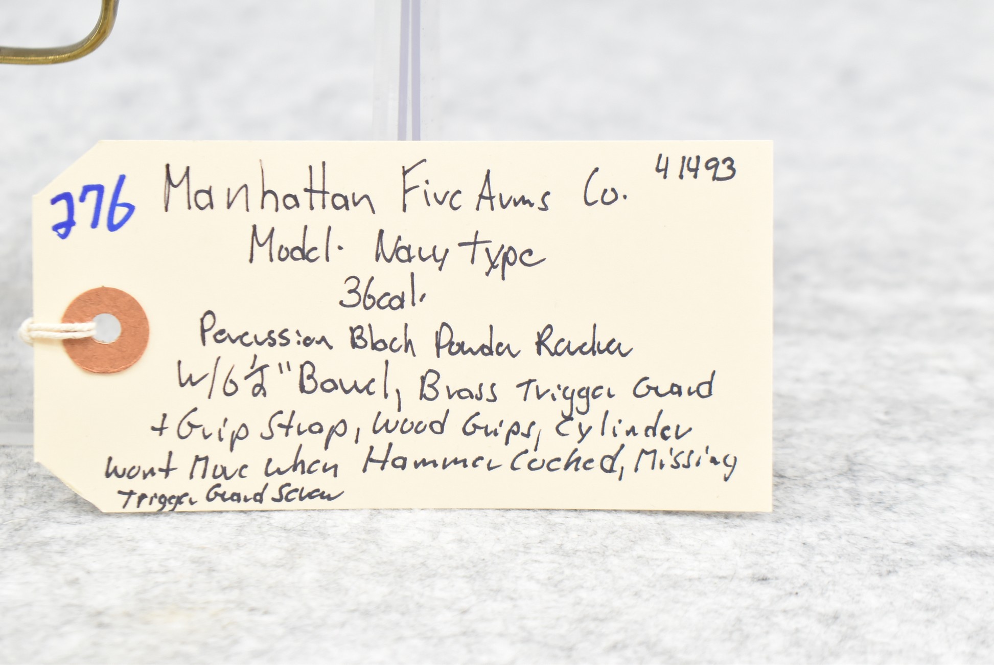 276. Manhattan Fire Arms Co. – Mod. Navy Type – 36 Cal. Percussion Black Powder Revolver – w/6 ½” Barrel – w/Wood Grips – w/Brass Trigger Guard & Grip Strap – Note: Cylinder Won’t Rotate When Hammer Cocked & Missing Trigger Guard Screw