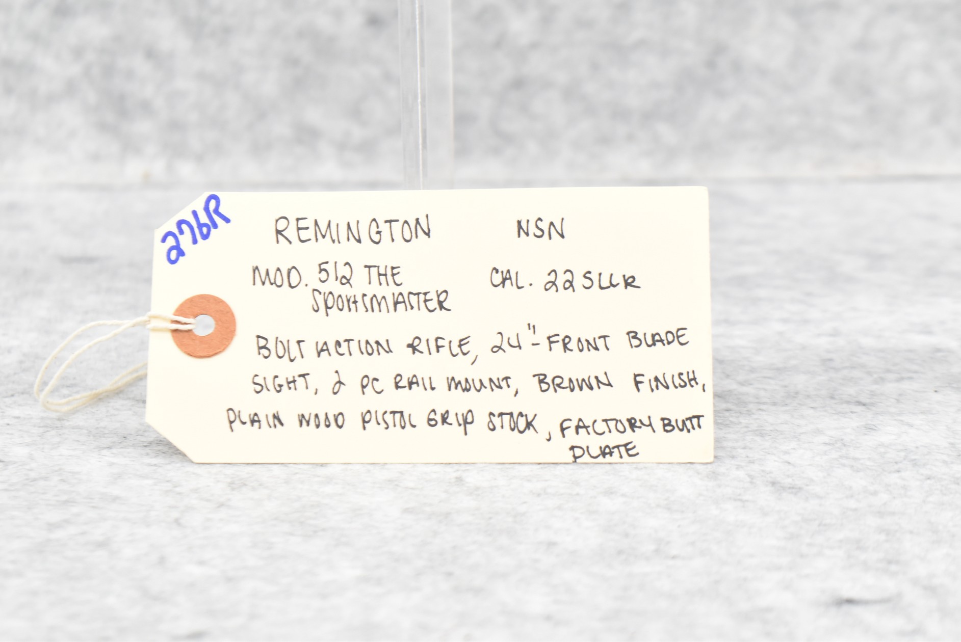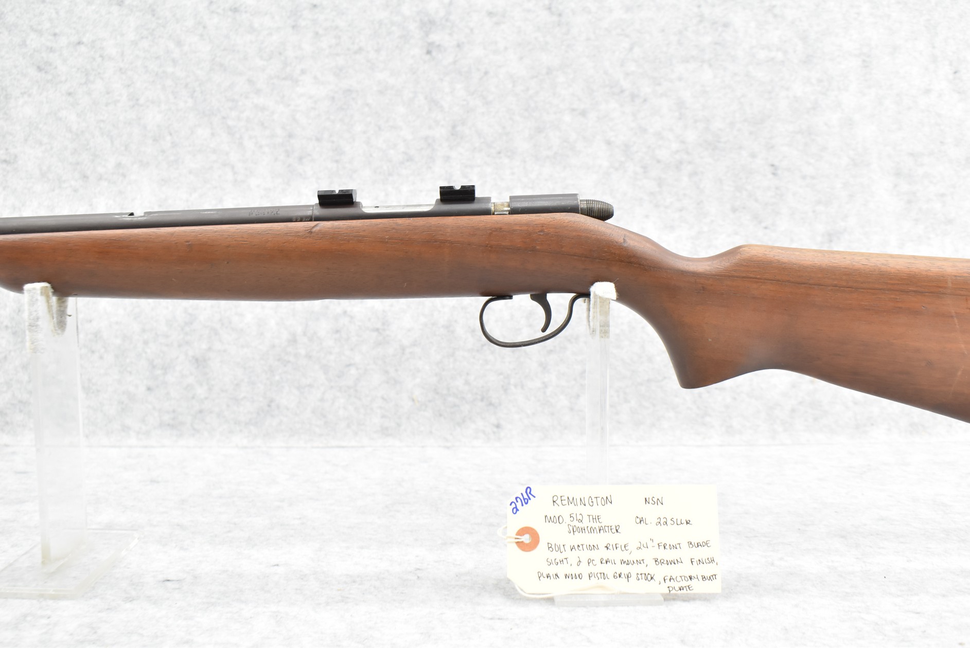 276R. Remington – Mod. 512 The Sportsmaster – 22 Cal. Bolt Action Rifle – w/24” Barrel w/Front Blade Sight – Brown Finish – w/Plain Wood Pistol Grip Stock w/Factory Butt Plate – w/2pc. Scope Base
