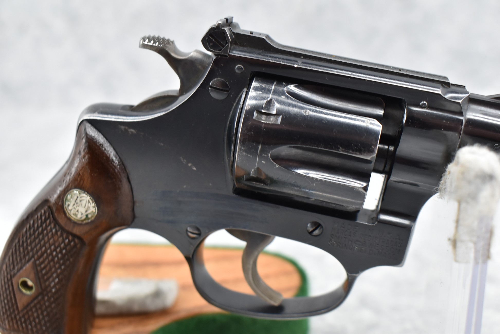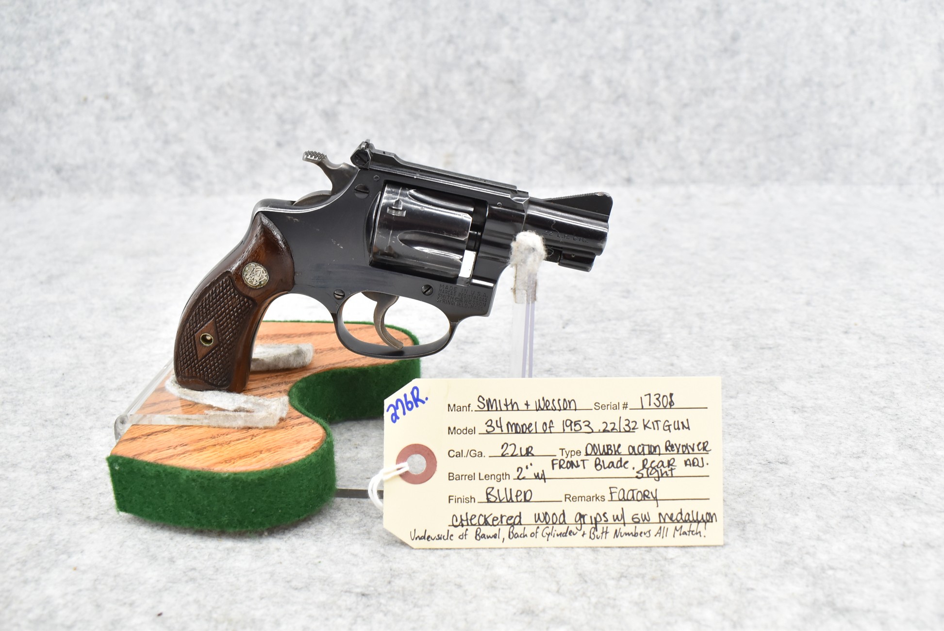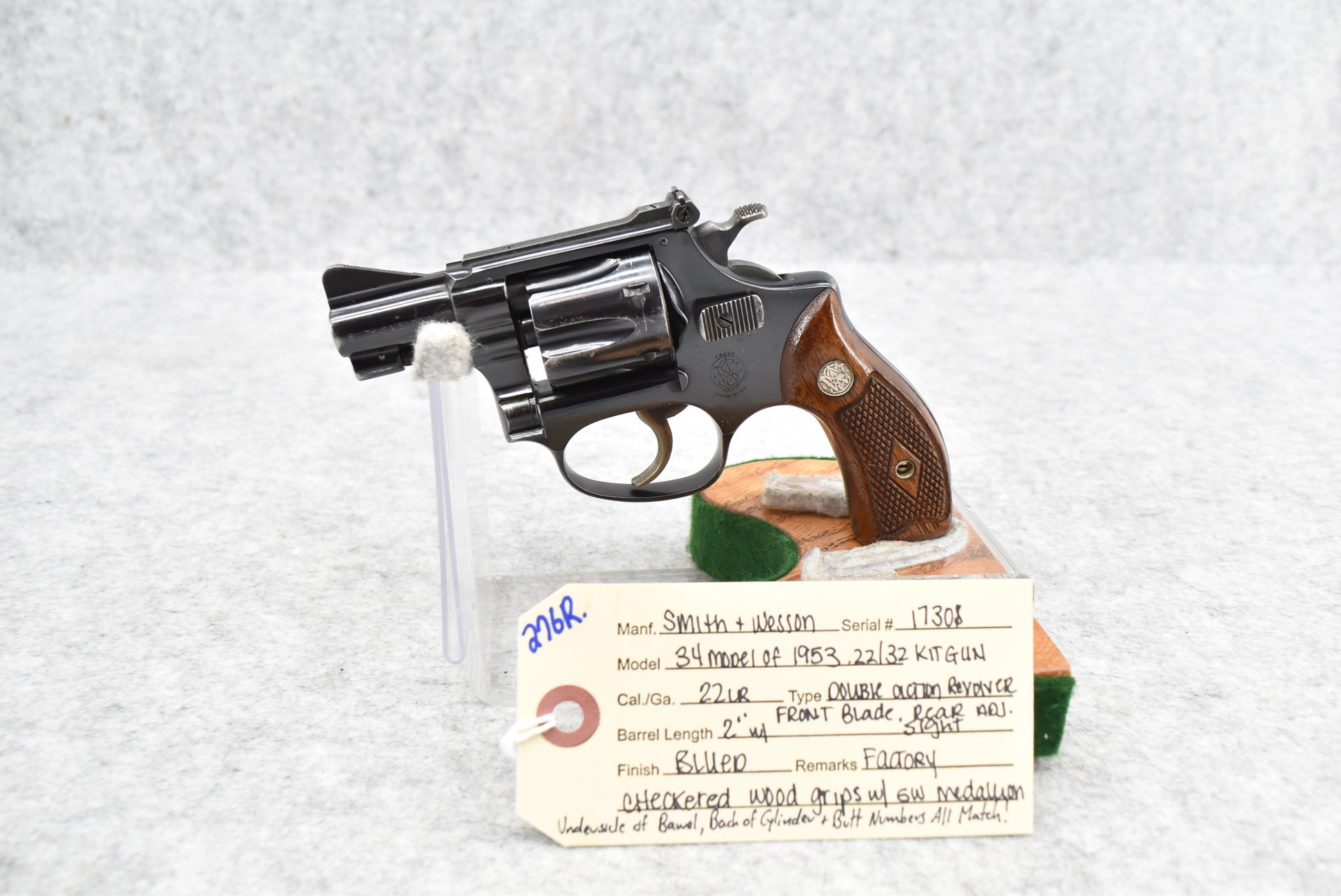 276R. Smith & Wesson – 34 Model of 1953 .22/32 Kit Gun – 22LR Cal. Double Action Revolver – w/2” Barrel w/Front Blade & Rear Adj. Sights – Blued Finish – w/Factory Diamond Checkered Wood Grips w/S&W Medallion – Underside of Barrel, Back of Cylinder & Butt Numbers All Match!
