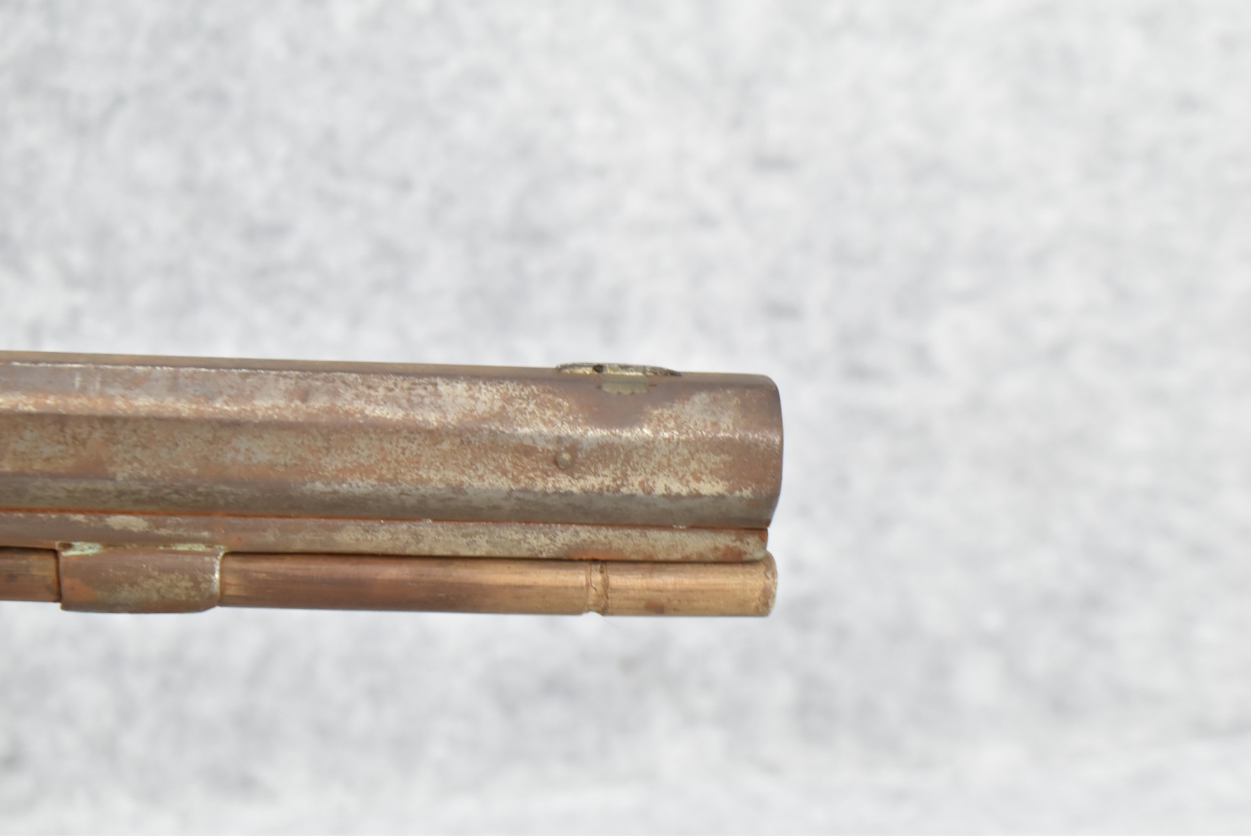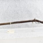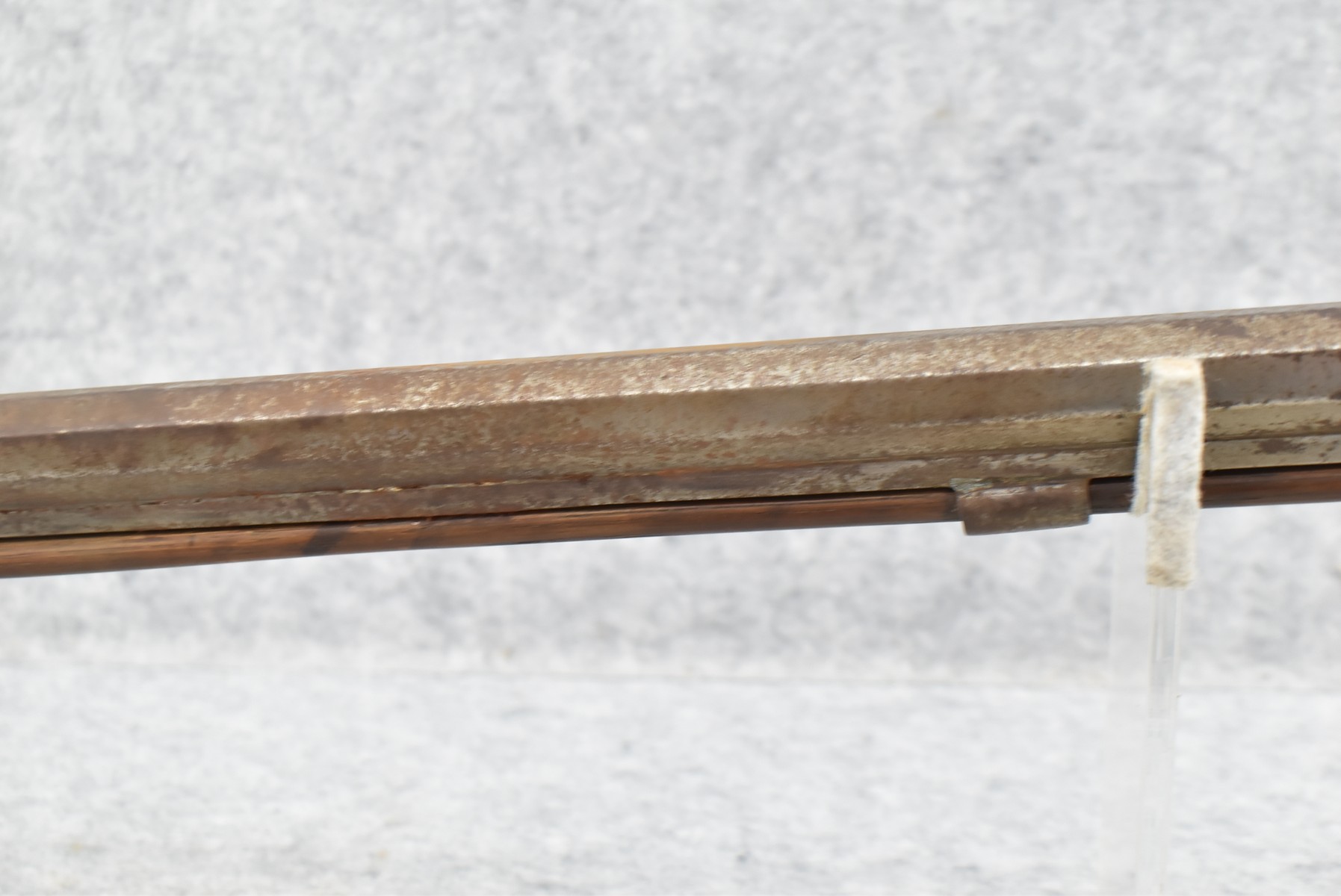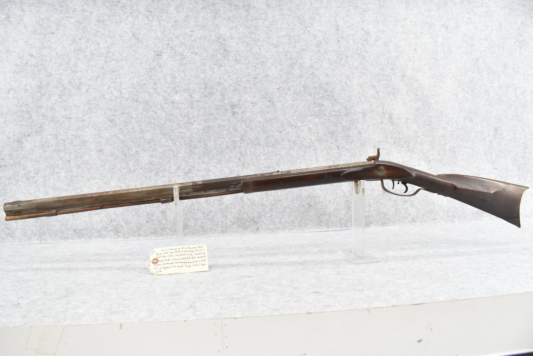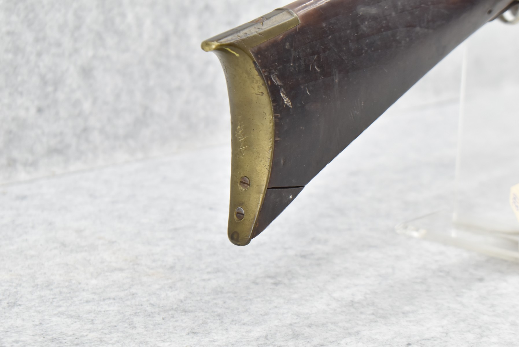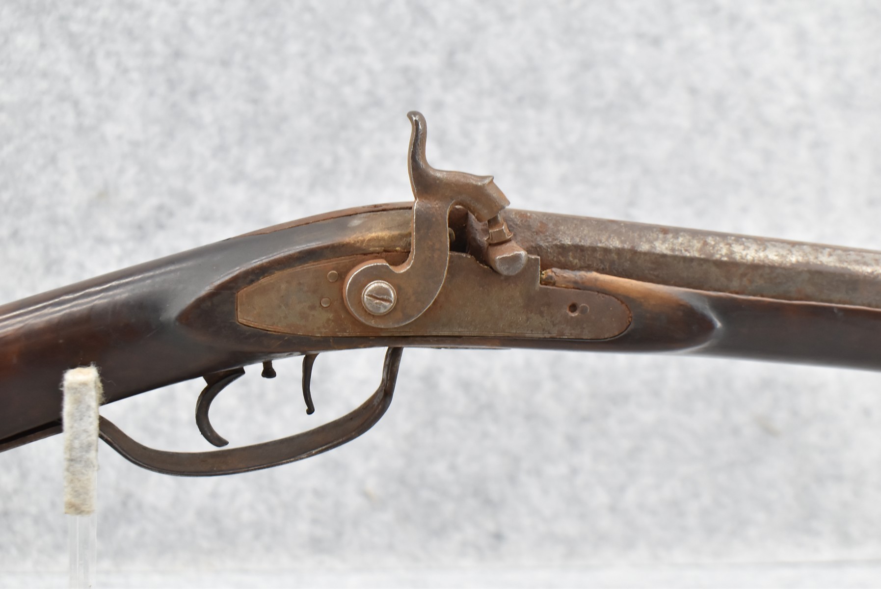 277. Early – 54 Cal. Black Powder Percussion Half Stock Rifle – w/32” Octagon Barrel w/Front & Rear Sights – Gray/Brown Finish – w/Straight Grip Wood Stock w/Crescent Metal Butt Plate – w/Double Set Triggers – w/Ram Rod – Note: Stock Damage Around Lock on Right Side, Lock Appears to be Signed “Joseph Golcher”, Repair at Toe