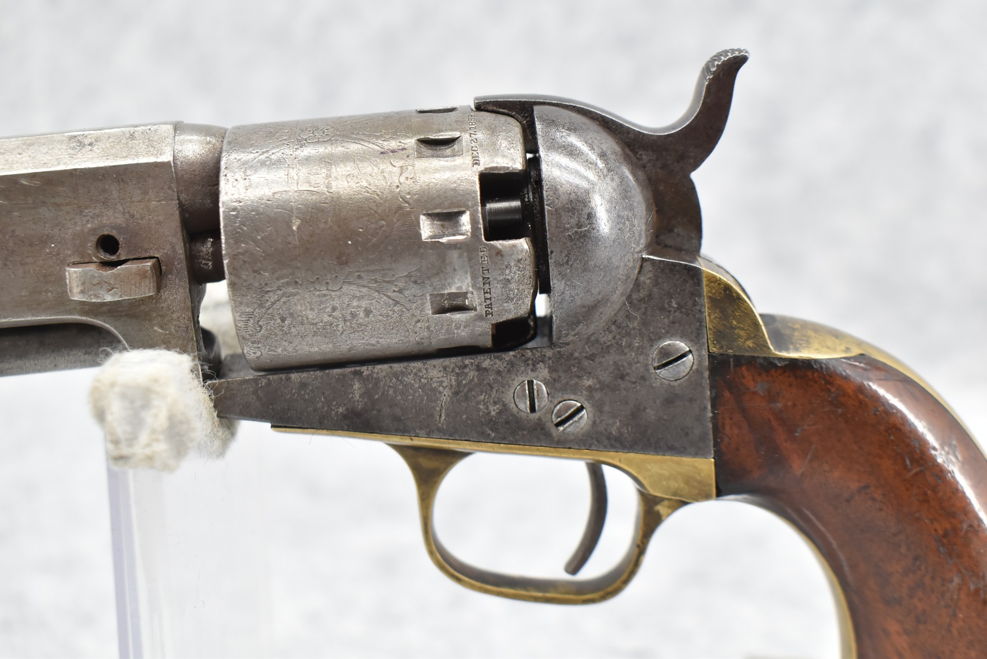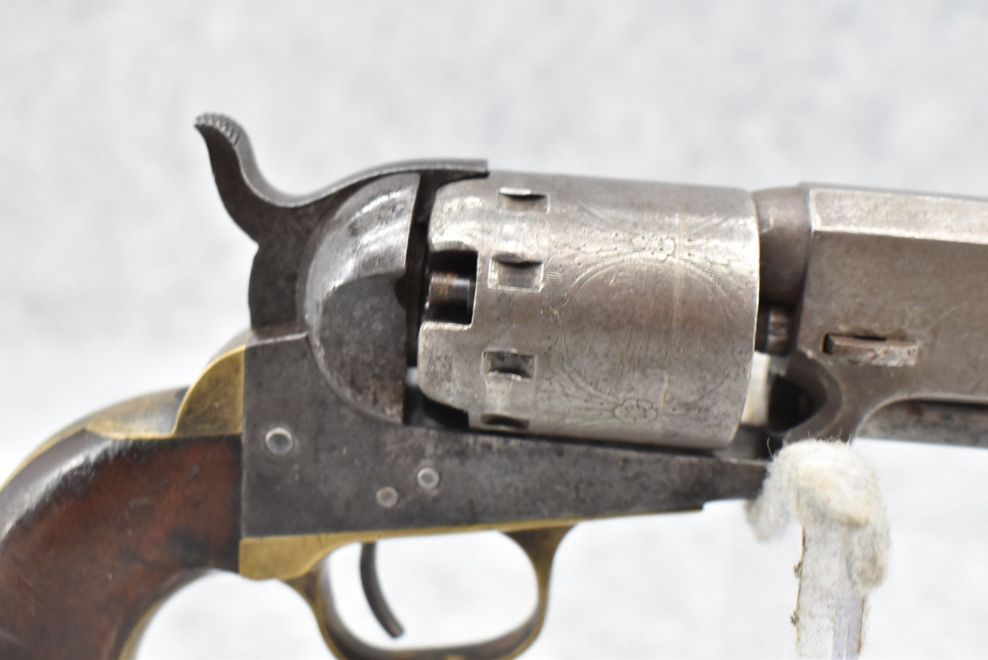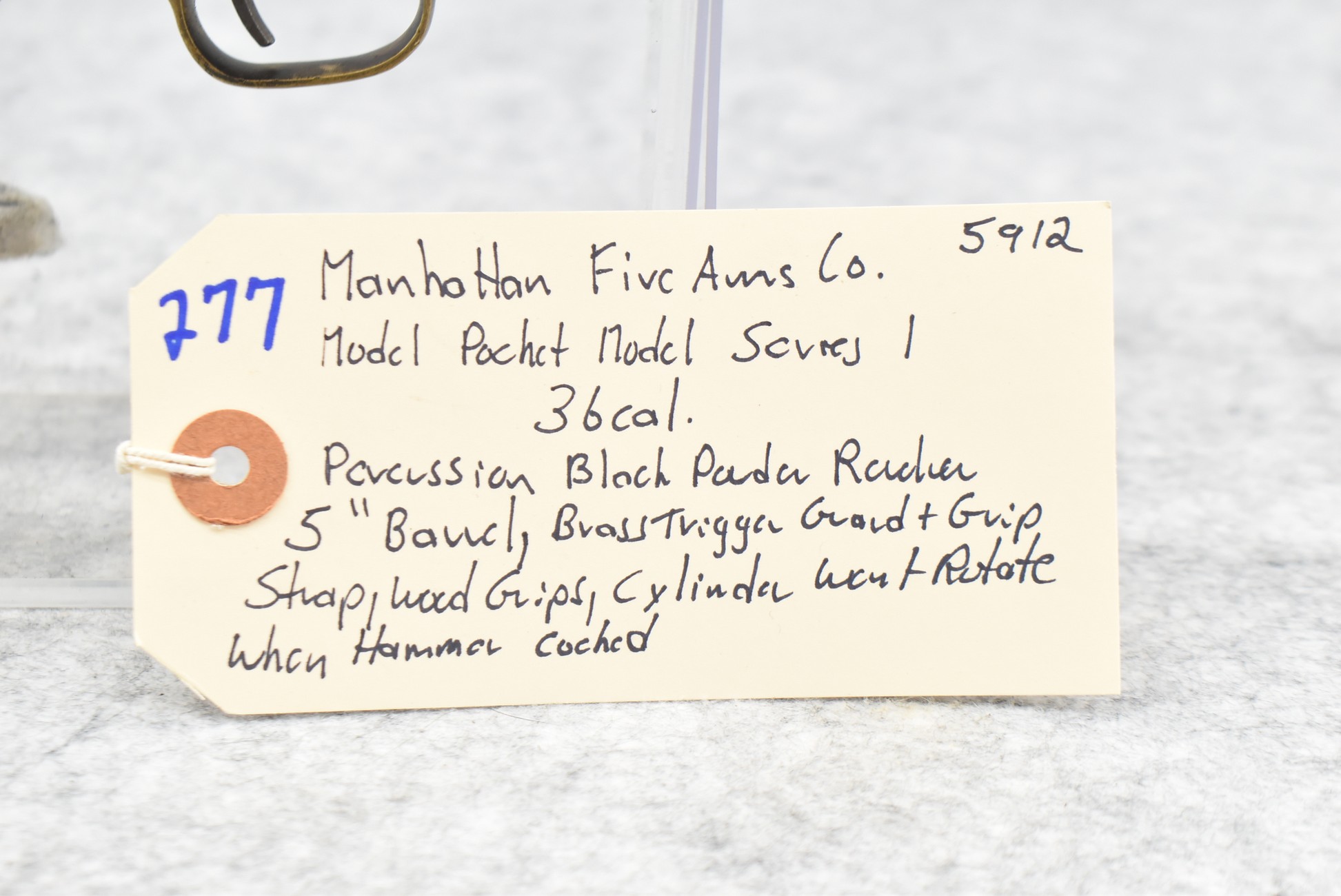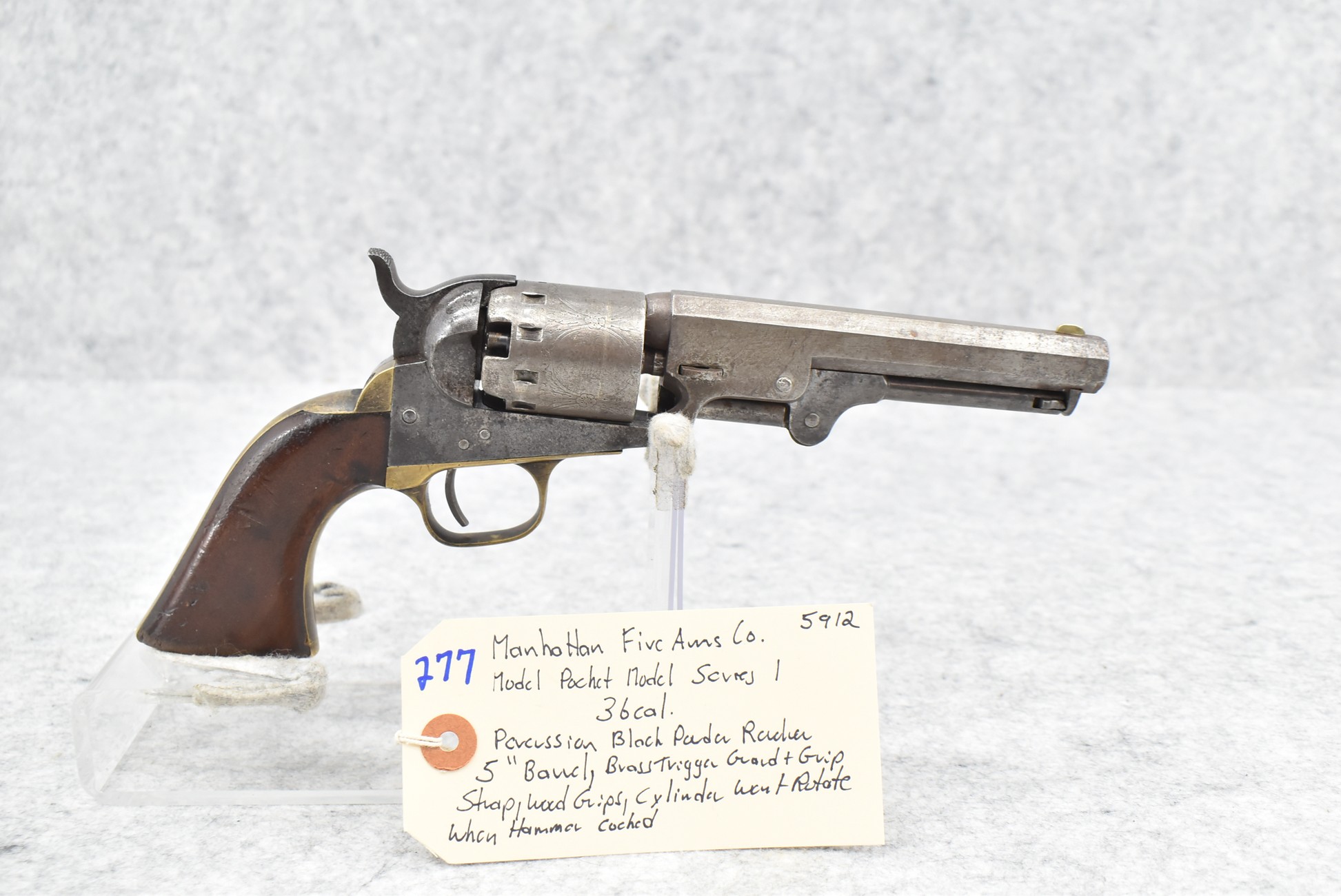 277.        Manhattan Fire Arms Co. – Mod. Pocket Model Series 1 – 36 Cal. Percussion Black Powder Revolver – w/5” Barrel – w/Wood Grips – w/Brass Trigger Guard & Grip Strap – Note:  Cylinder Won’t Rotate When Hammer Cocked