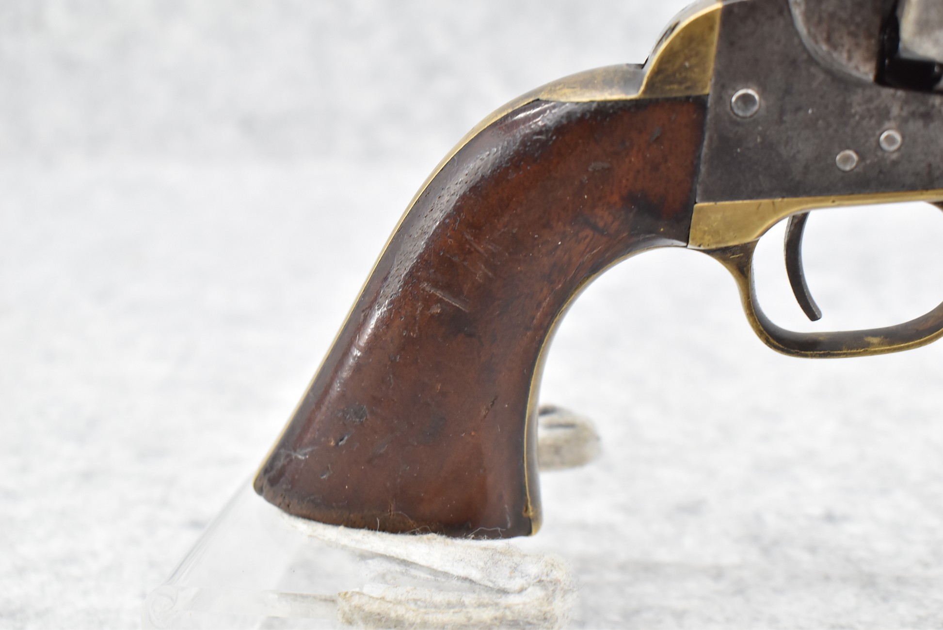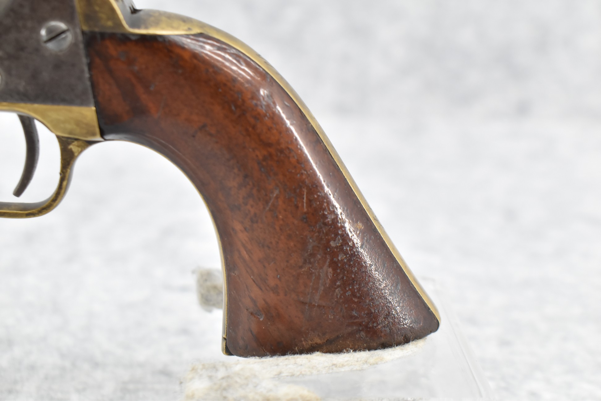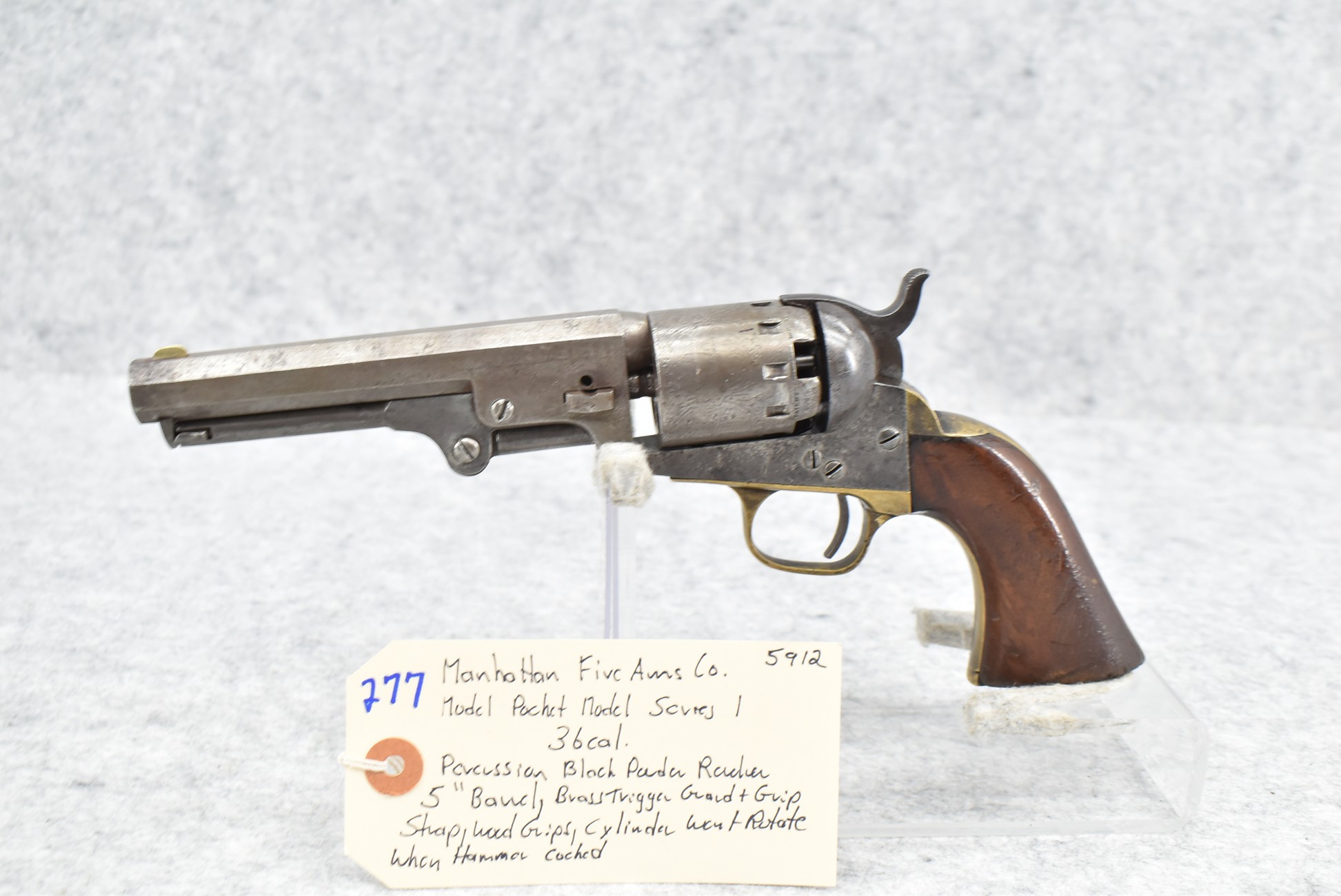 277. Manhattan Fire Arms Co. – Mod. Pocket Model Series 1 – 36 Cal. Percussion Black Powder Revolver – w/5” Barrel – w/Wood Grips – w/Brass Trigger Guard & Grip Strap – Note: Cylinder Won’t Rotate When Hammer Cocked