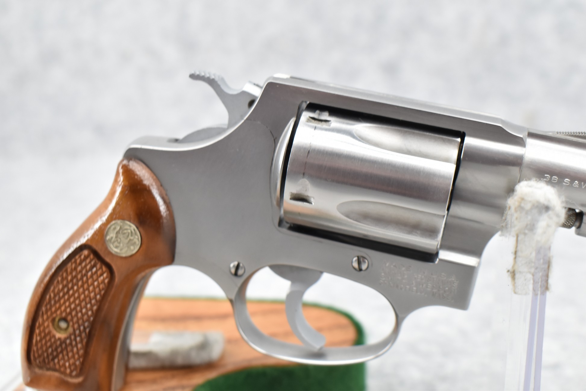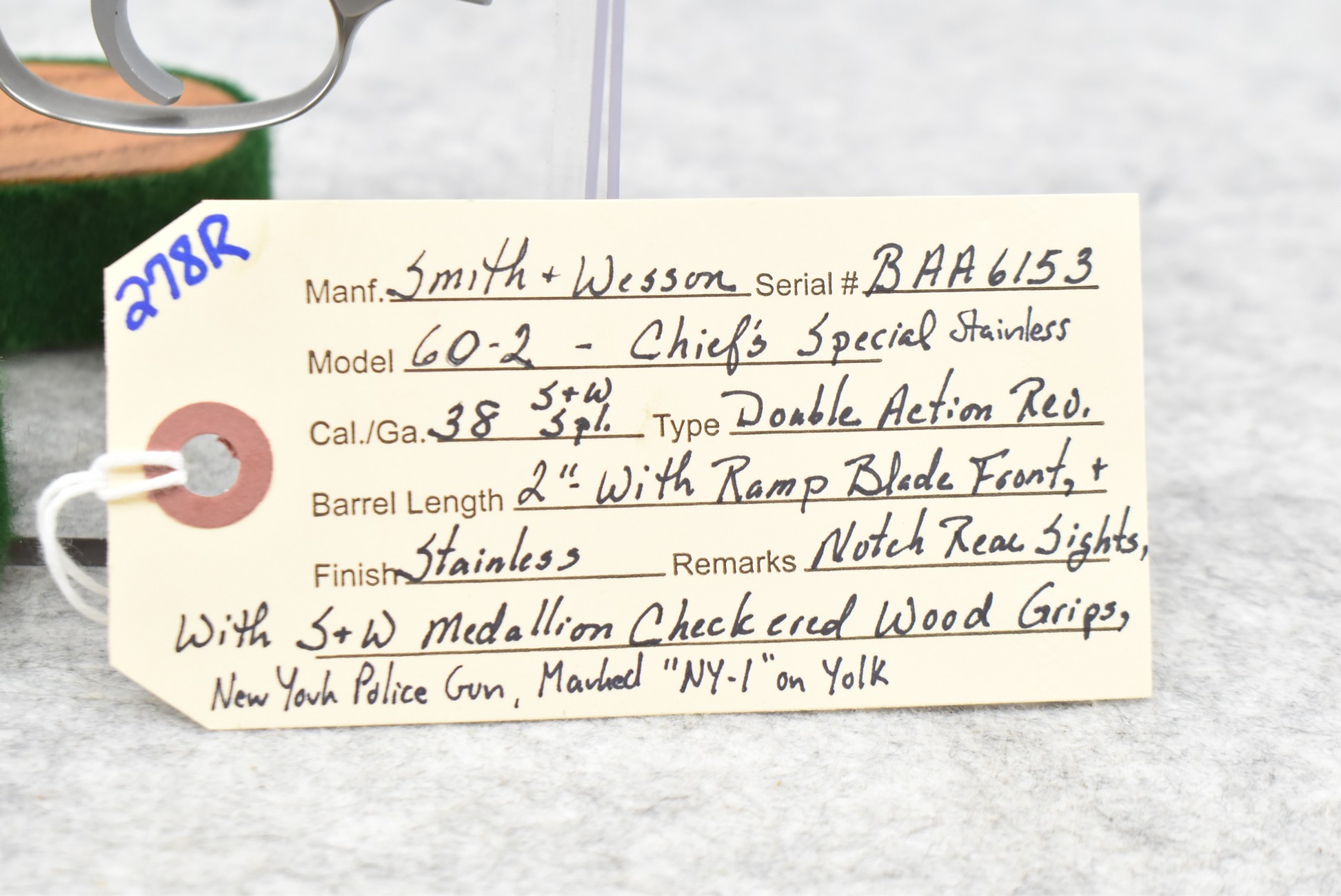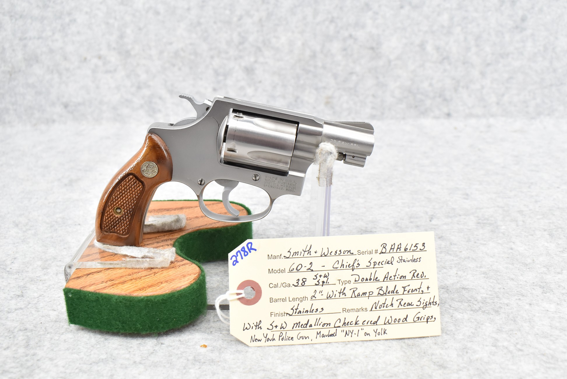 278R. Smith & Wesson – Mod. 60-2 Chiefs Special – 38 S&W Spl. Cal. Double Action Revolver – w/2” Barrel w/Ramp Blade Front & Notch Rear Sights – Stainless Finish – w/S&W Medallion Checkered Wood Grips – New York Police Gun, Marked “NY-1” on Yoke