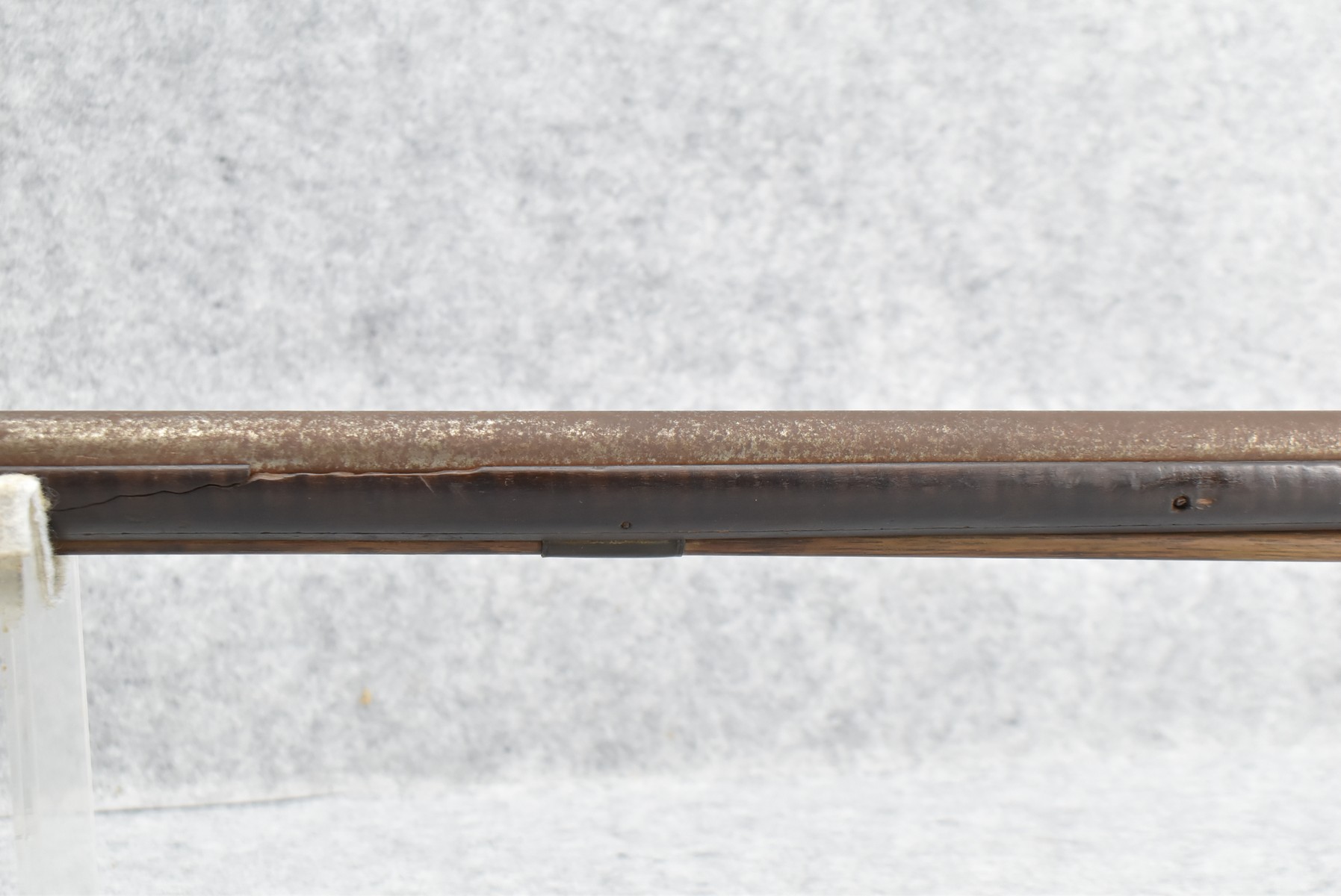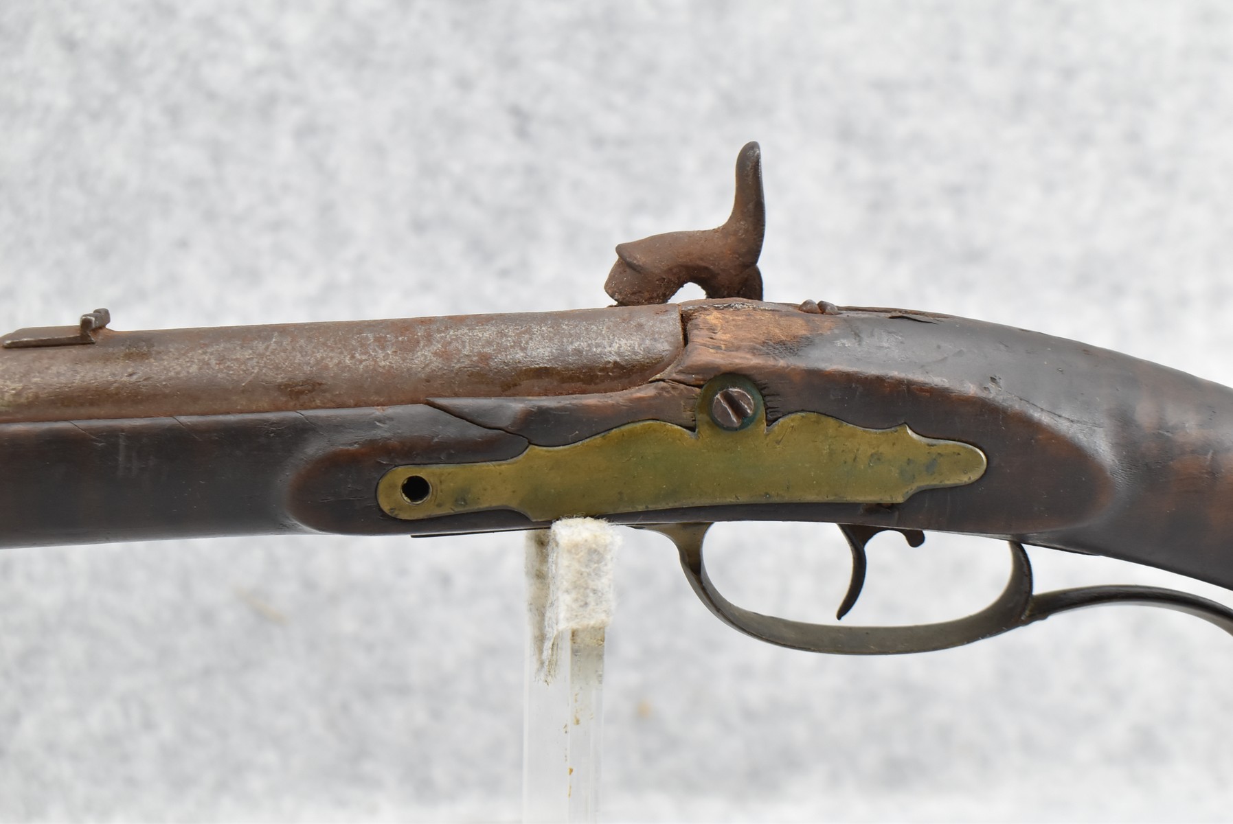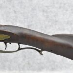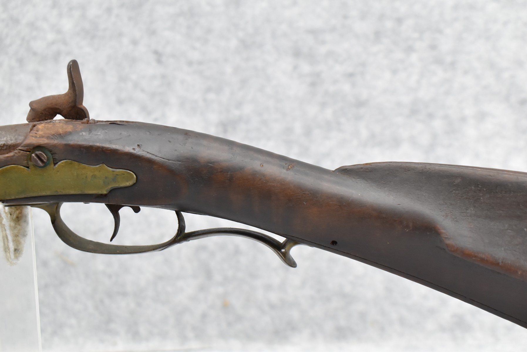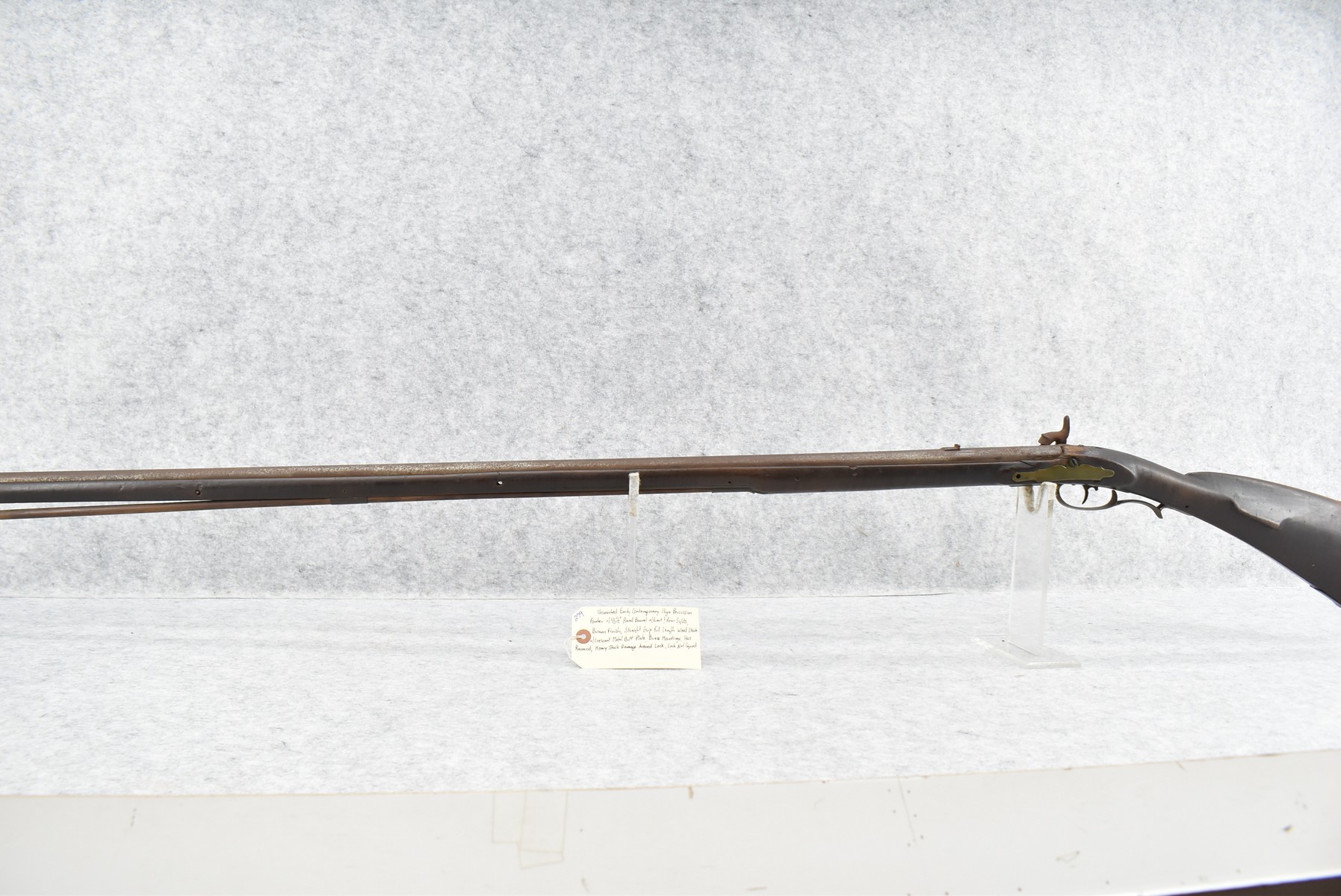 279. Unmarked Early – 16ga. Percussion Fowler – w/46 ½” Round Barrel w/Front & Rear Sights – Brown Finish – w/Straight Grip Full Length Wood Stock w/Crescent Metal Butt Plate & Brass Mountings – w/Ram Rod – Note: Heavy Stock Damage Around Lock, Lock Not Signed