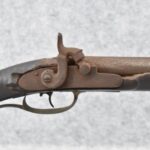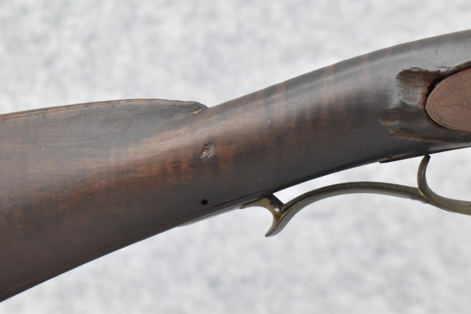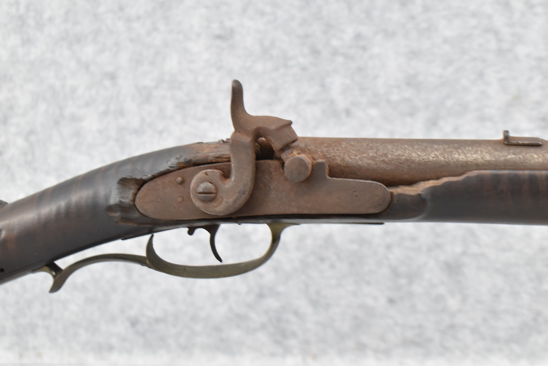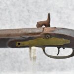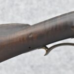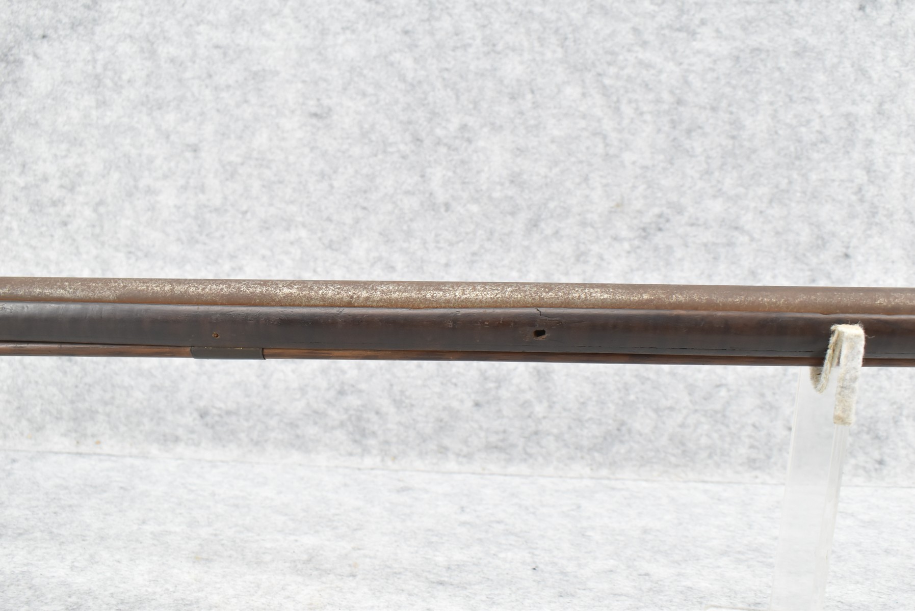 279. Unmarked Early – 16ga. Percussion Fowler – w/46 ½” Round Barrel w/Front & Rear Sights – Brown Finish – w/Straight Grip Full Length Wood Stock w/Crescent Metal Butt Plate & Brass Mountings – w/Ram Rod – Note: Heavy Stock Damage Around Lock, Lock Not Signed
