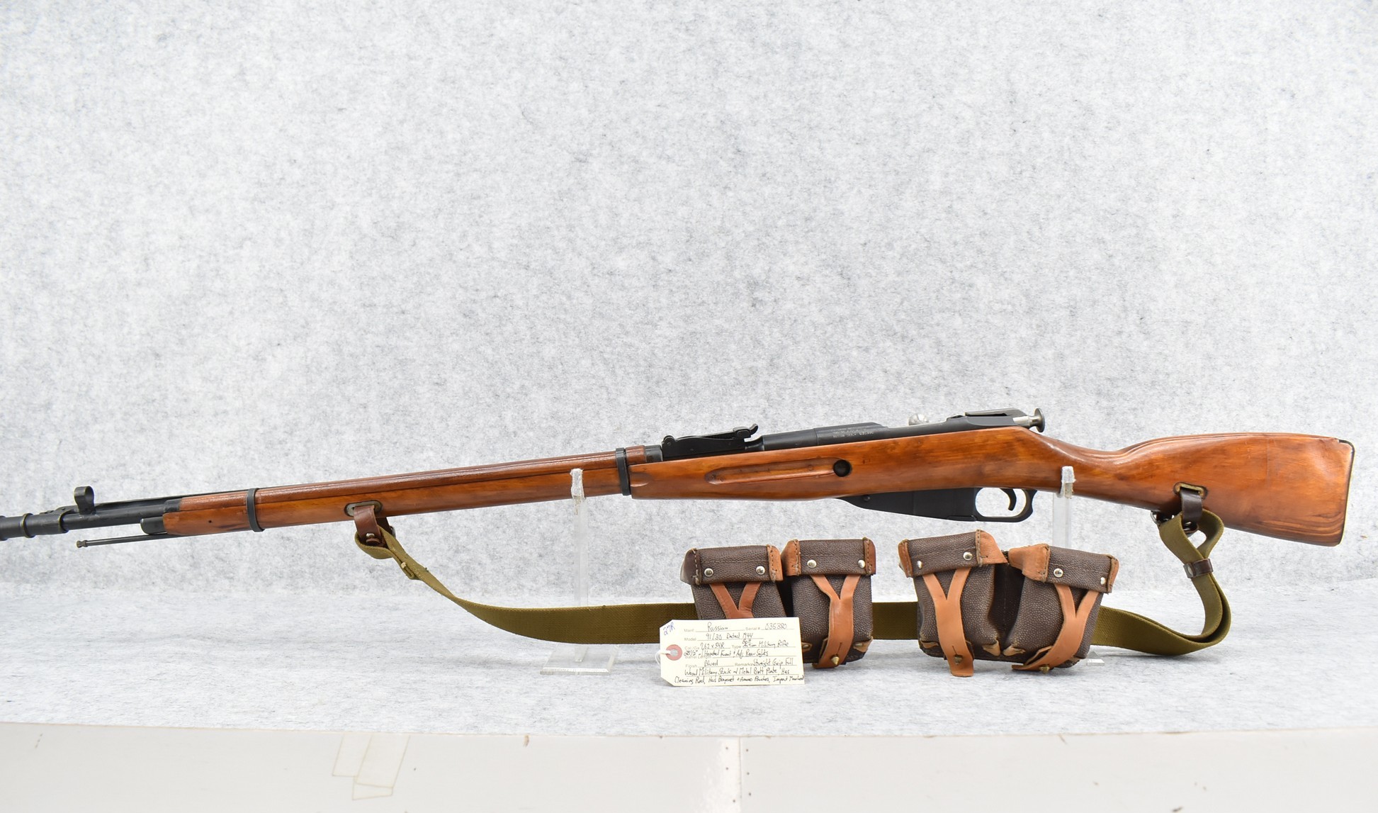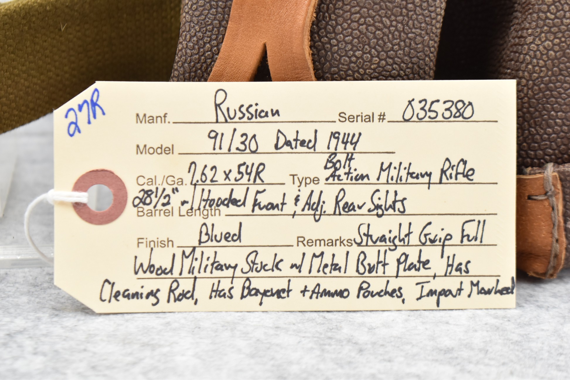27R. Russian – Mod. 91/30 – 7.62x54R Cal. Bolt Action Military Rifle – w/28 ½” Barrel w/Hooded Front & Adj. Rear Sights – Blued Finish – w/Straight Grip Full Wood Military Stock w/Metal Butt Plate – w/Cleaning Rod w/Bayonet & Ammo Pouches – Dated 1944 – Import Marked