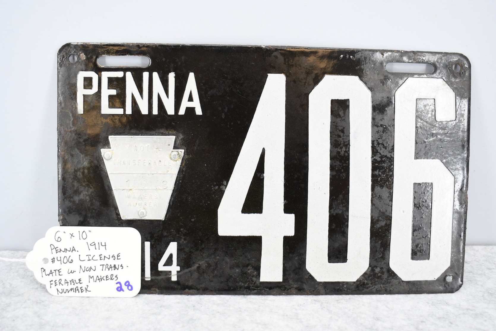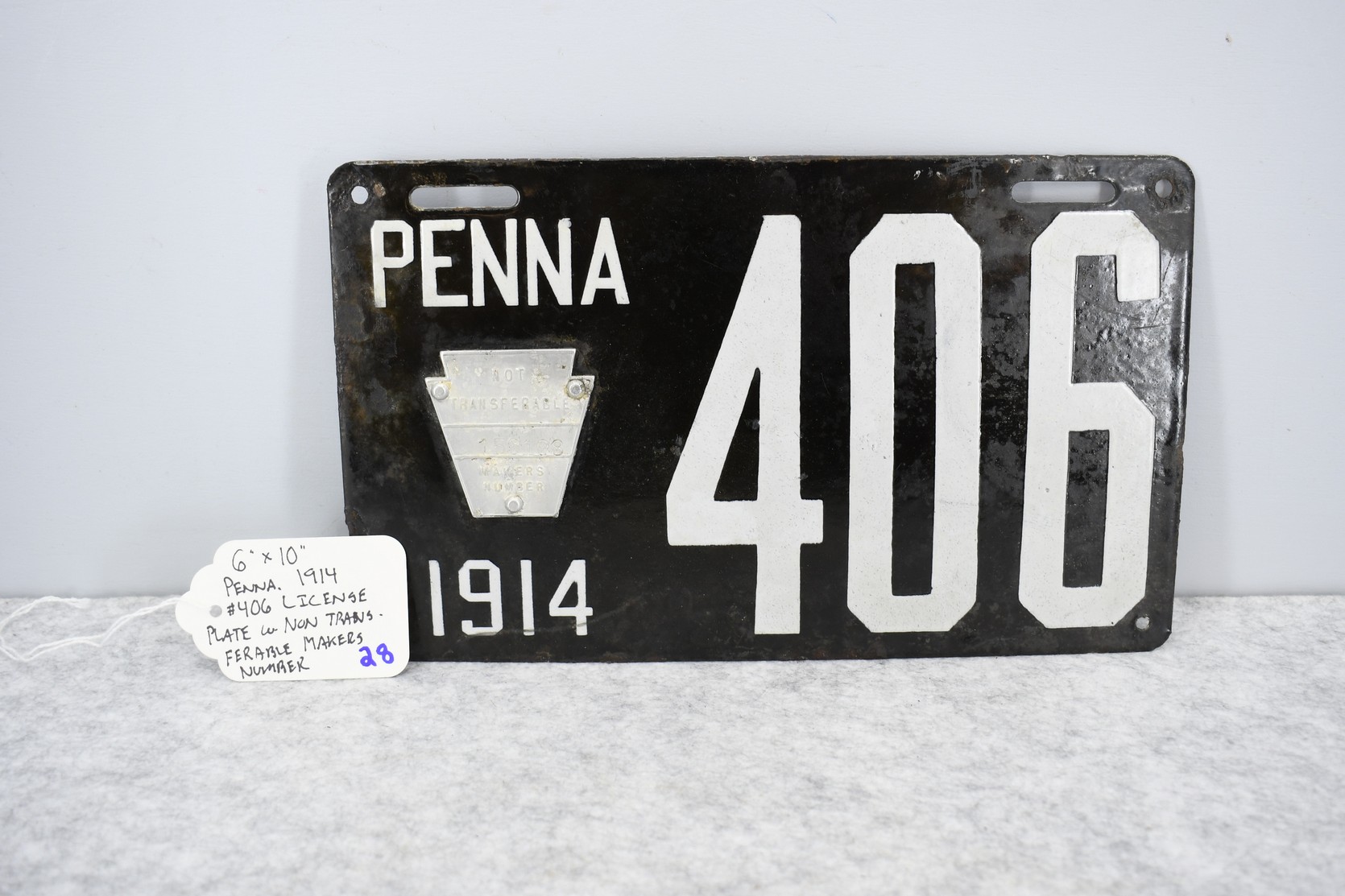 28. 1914 Pennsylvania Porcelain License Plate – Plate No. #406 – Plate has Non-Transferable Makers Number