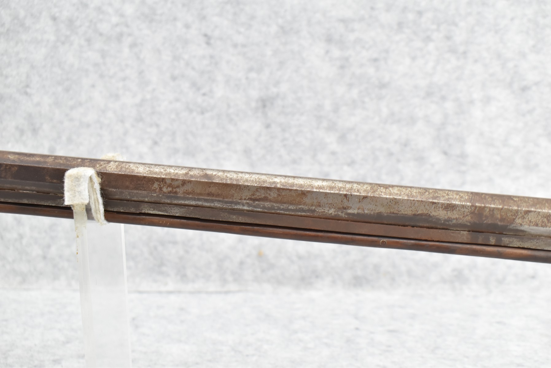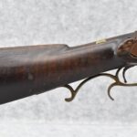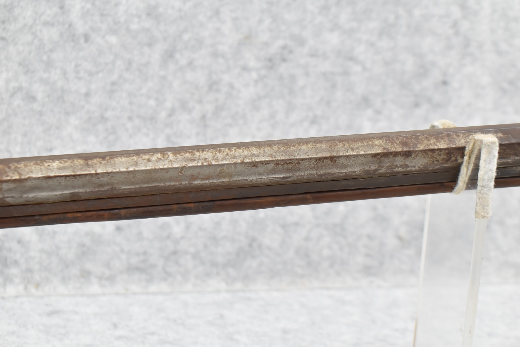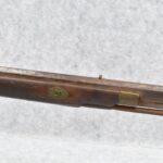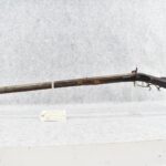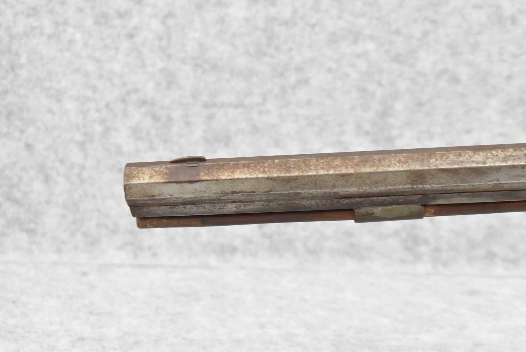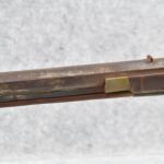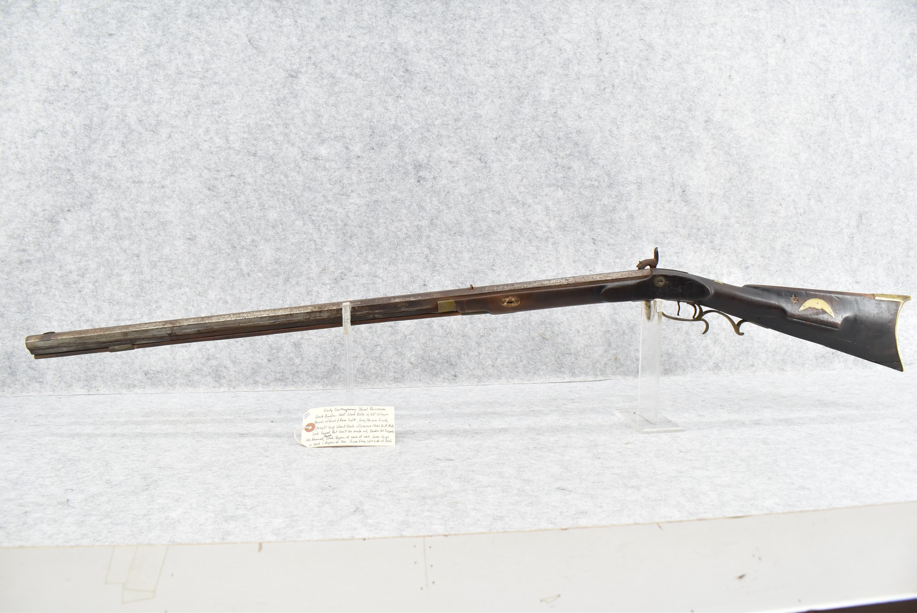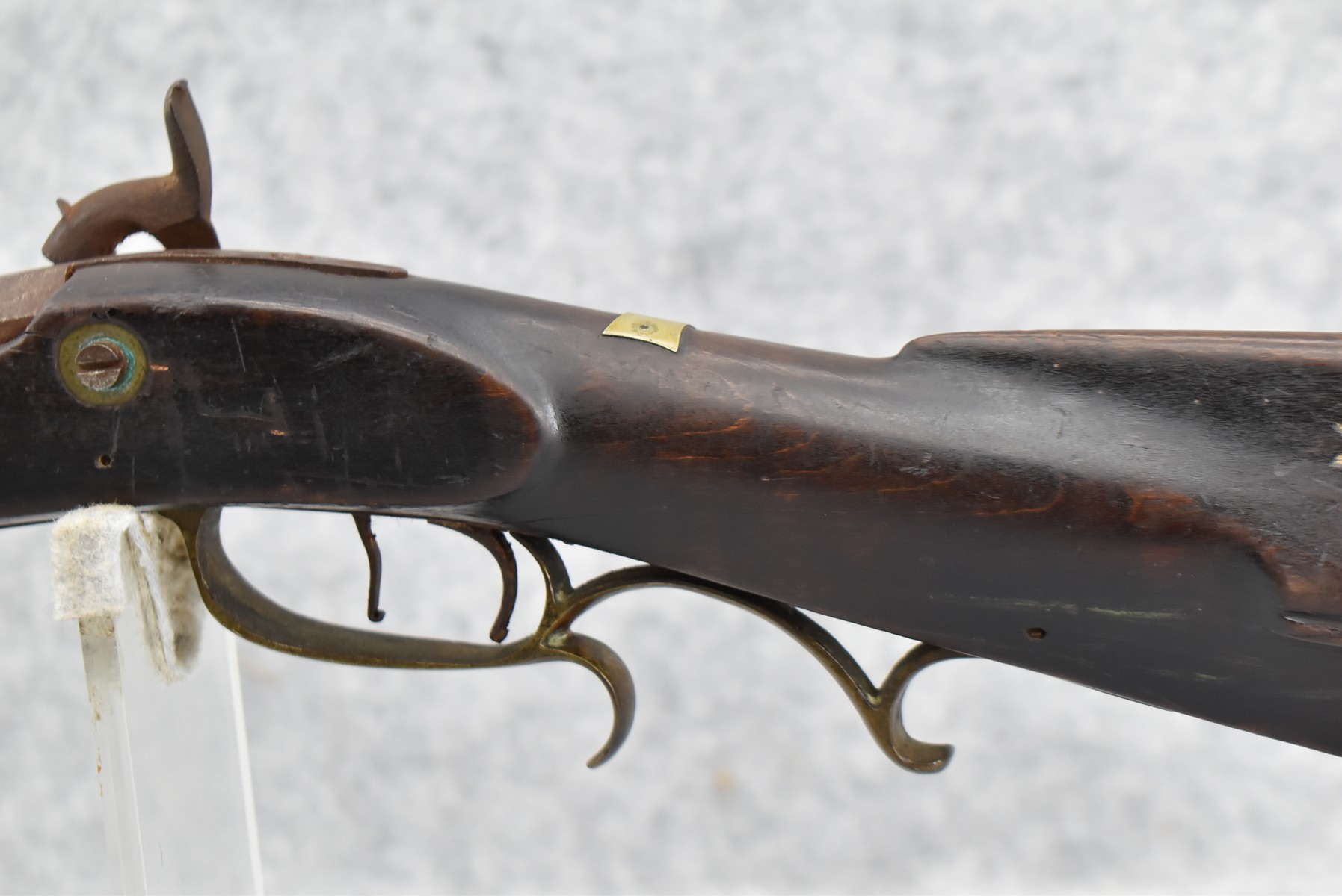 281. Early – 36 Cal. Black Powder Percussion Half Stock Rifle – w/33” Octagon Barrel w/Front & Rear Sights – Gray/Brown Finish – w/Straight Grip Wood Stock w/Crescent Metal Butt Plate & Brass Inlsay on Left Side of Stock – Lock Signed, but Illegible – w/Double Set Triggers – w/Ram Rod – Note: Period Stock Repair at Back of Lock, Some Chips in Stock & Repair at Toe