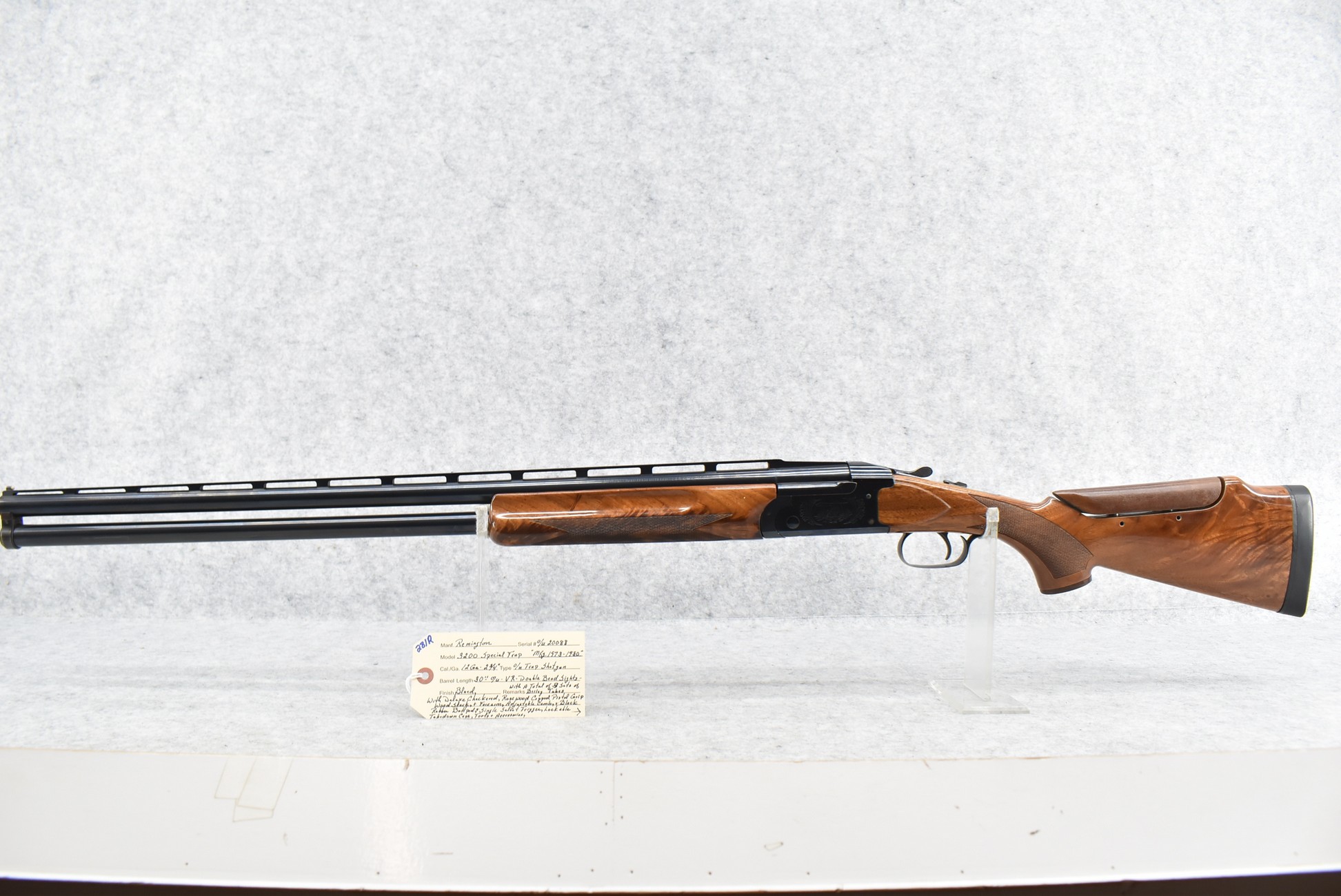 281R. Remington – Mod. 3200 Special Trap – 12ga. 2 ¾” Over Under Trap Shotgun – w/30” Vent-Rib Barrels w/Double Bead Sights – Blued Finish – w/Deluxe Checkered Rosewood Capped Pistol Grip Wood Stocks w/Adj. Comb & Butt Pad – w/Single Select Trigger – w/Lockable Takedown Case, Tools & Accessories w/A Total of 3 Sets of Briley Choke Tubes – Briley Choke Tubes Sets Are For: 410ga., 28ga. & 20ga. – Mfg. Between 1973-1980
