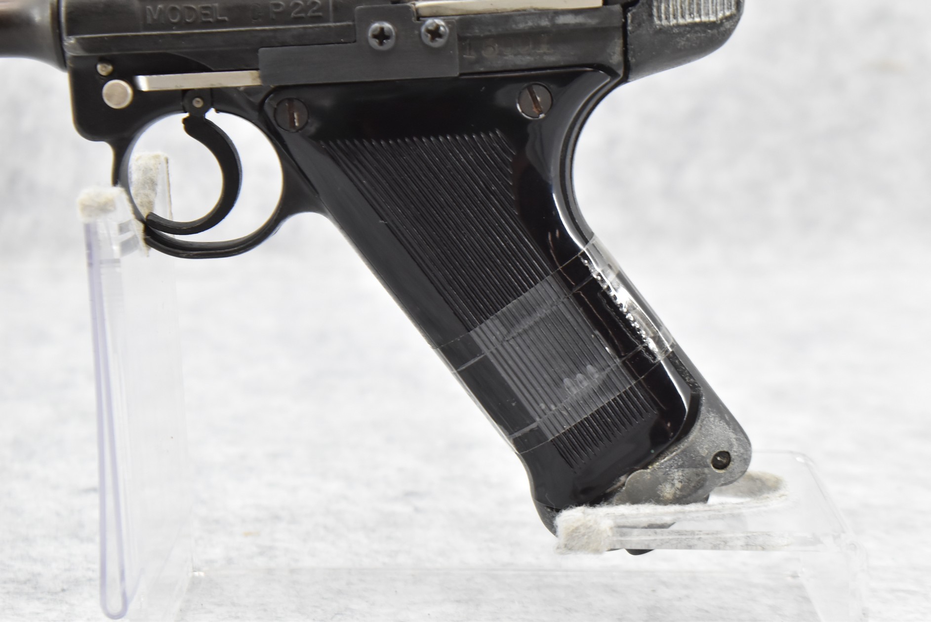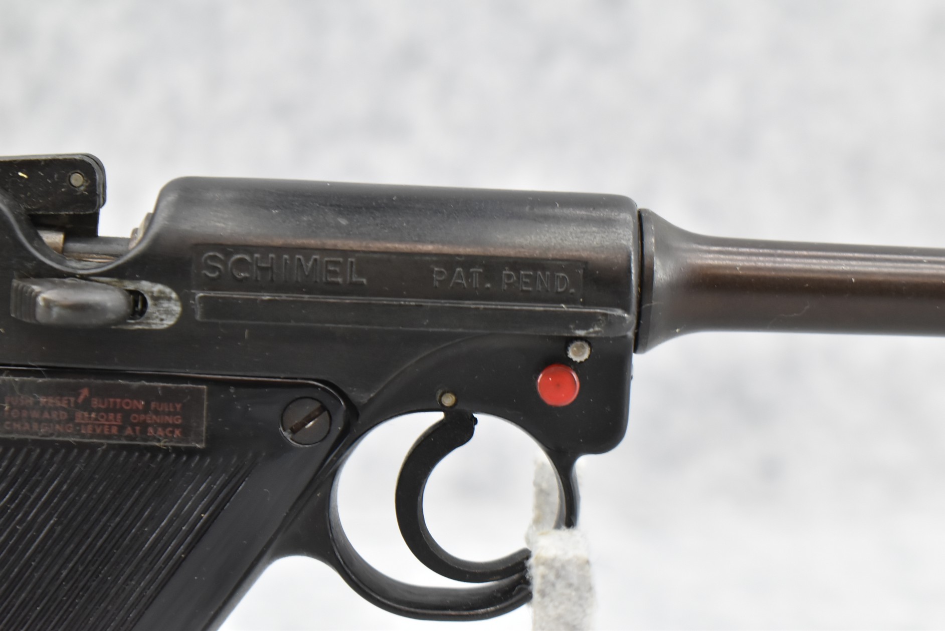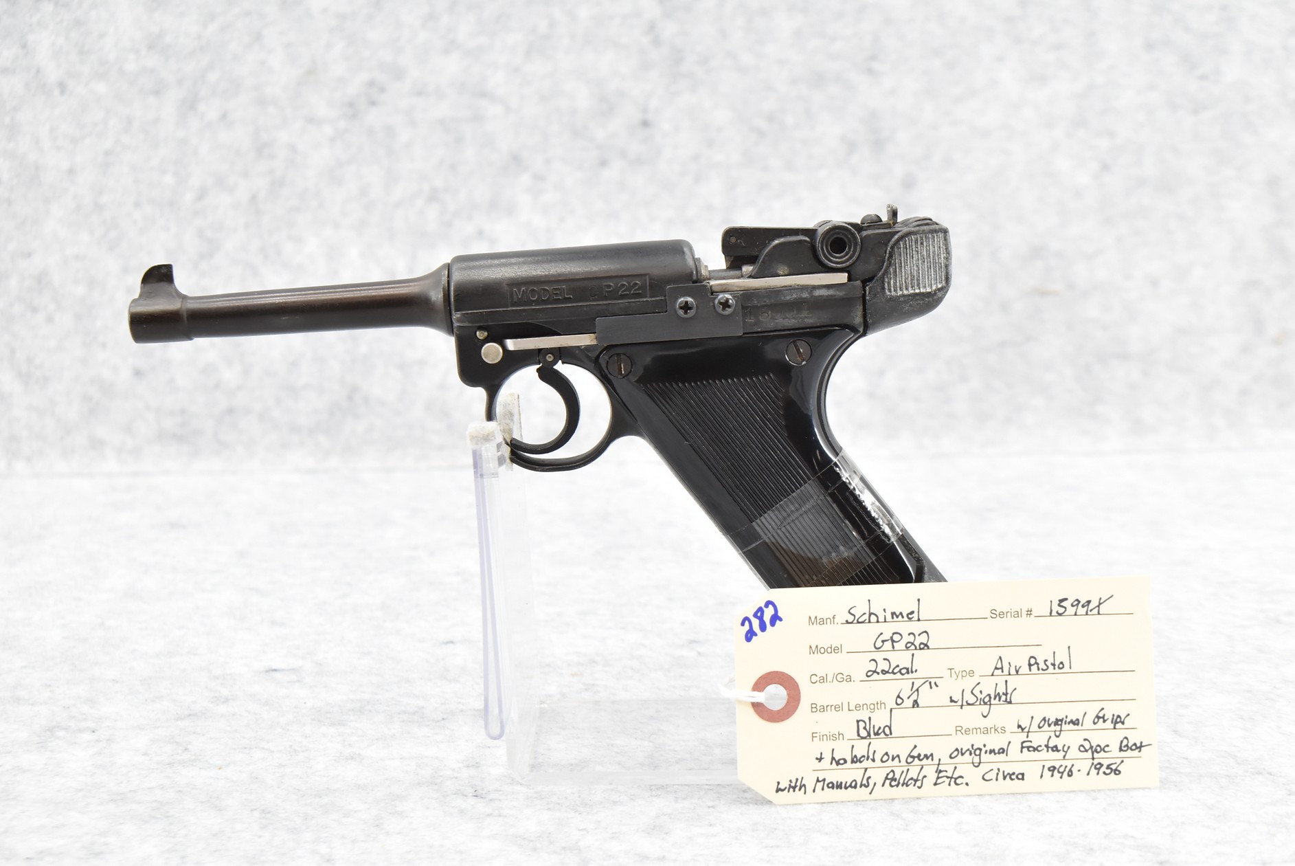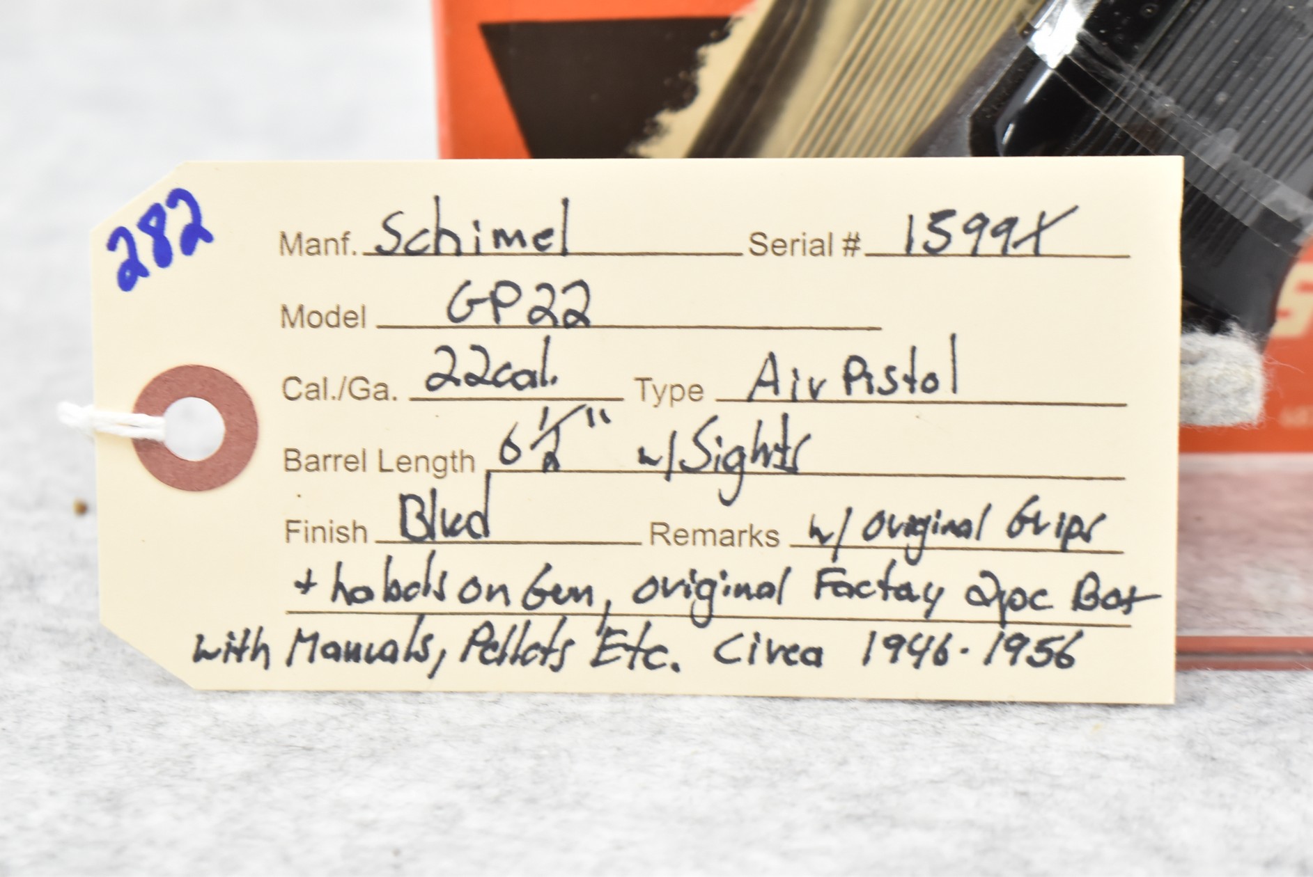282. Schimel – Mod. GP22 – 22 Cal. Air Pistol – w/6 ½” Barrel w/Sights – Blued Finish – w/Original Grips – w/Original Factory 2pc. Box w/Manuals, Pellets, Etc. – Circa 1946-1956
