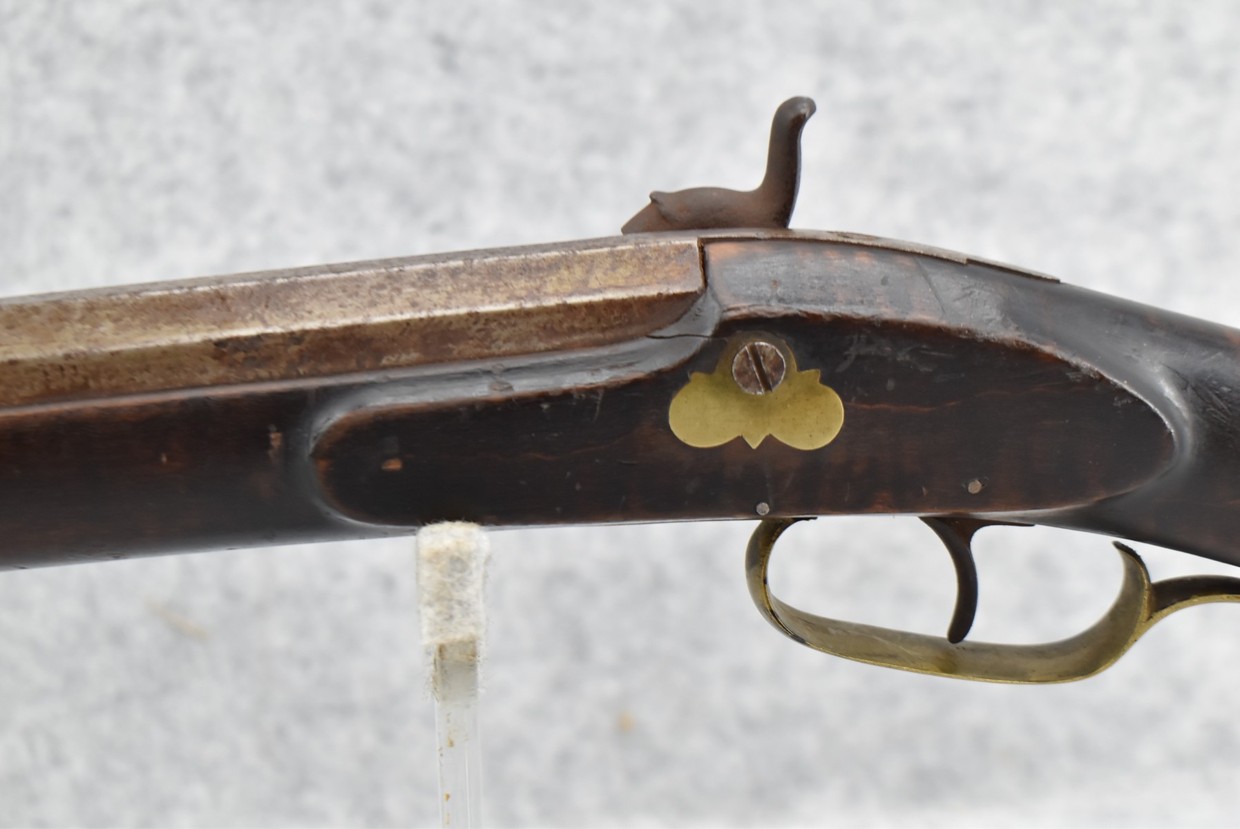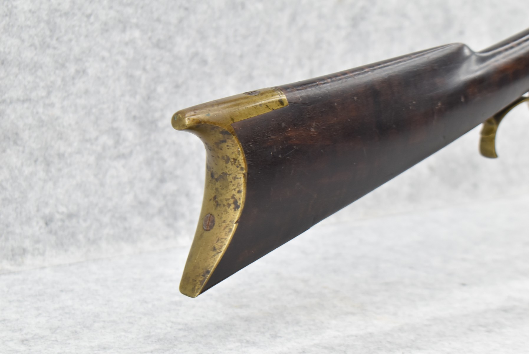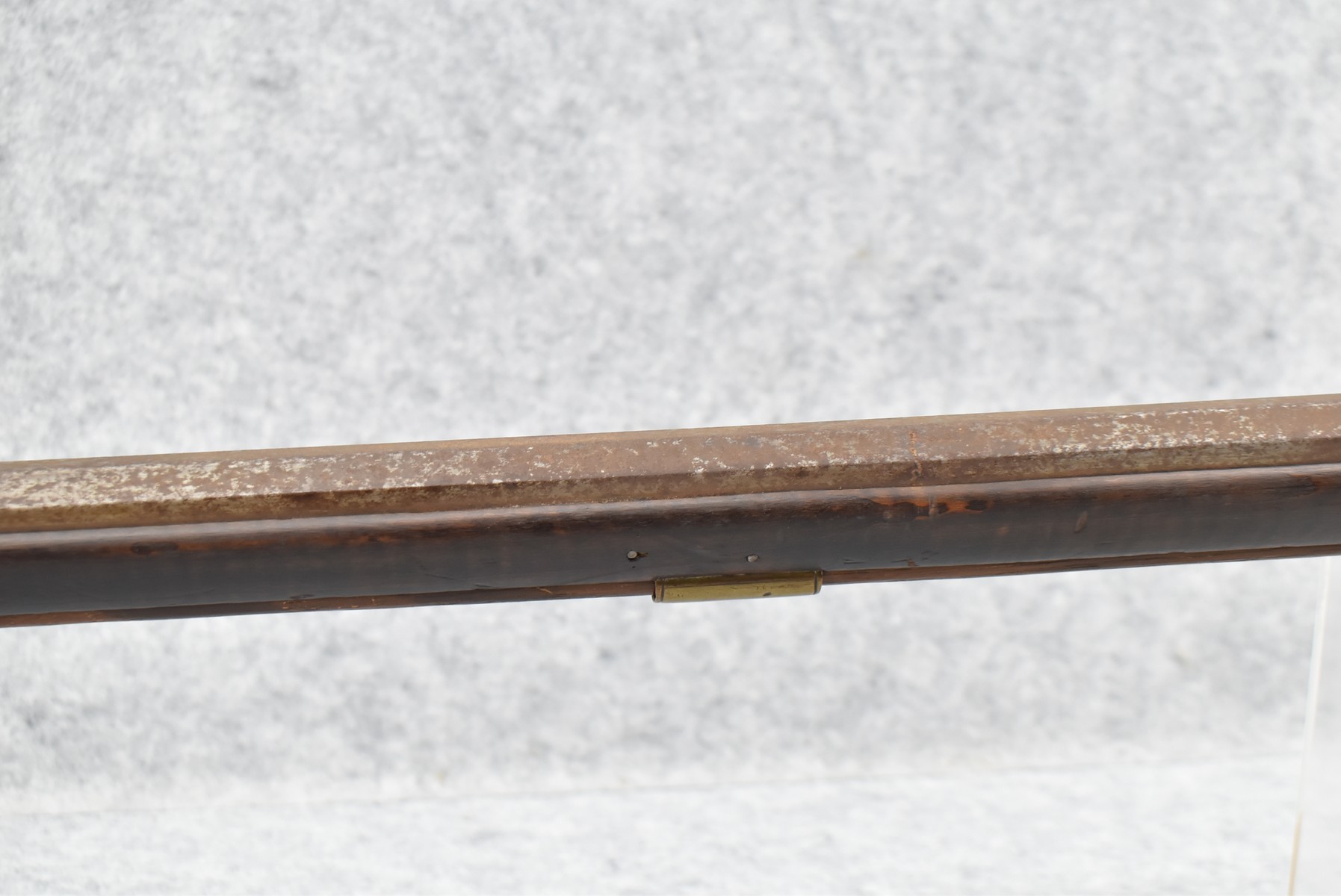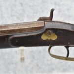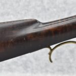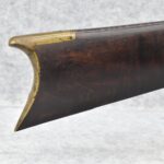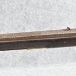 282.        Unsigned 50 Cal. Black Powder Percussion Early Kentucky Rifle – w/42” Octagon Barrel w/Front & Rear Sights – Gray Finish – w/Straight Grip Full Length Wood Stock w/Crescent Metal Butt Plate & Brass Mountings – w/Ram Rod w/Broken Tip