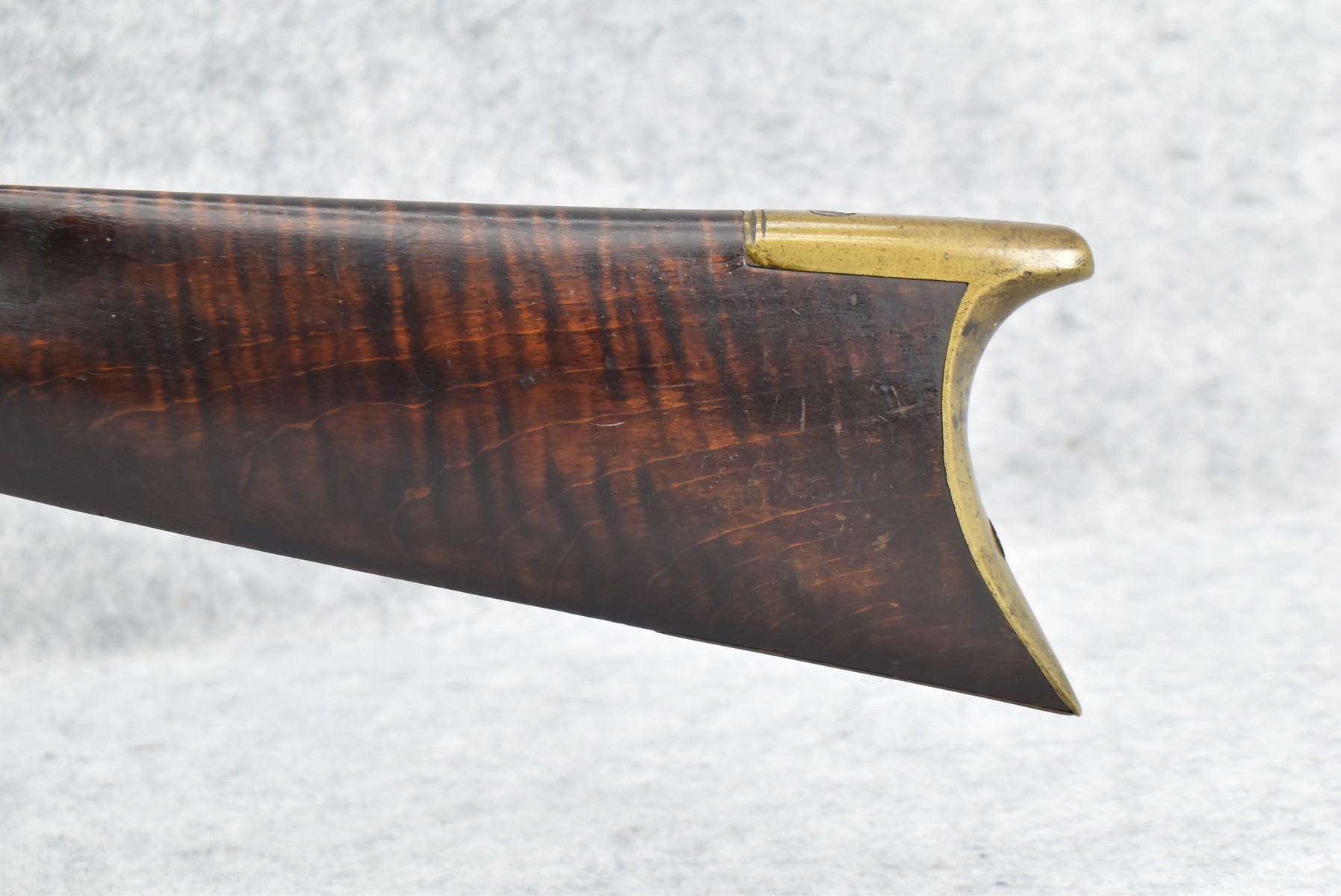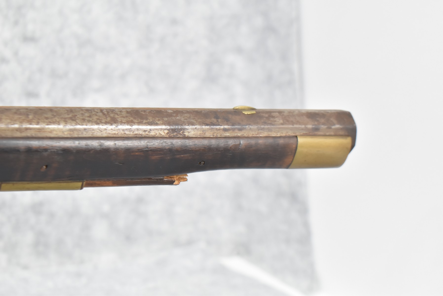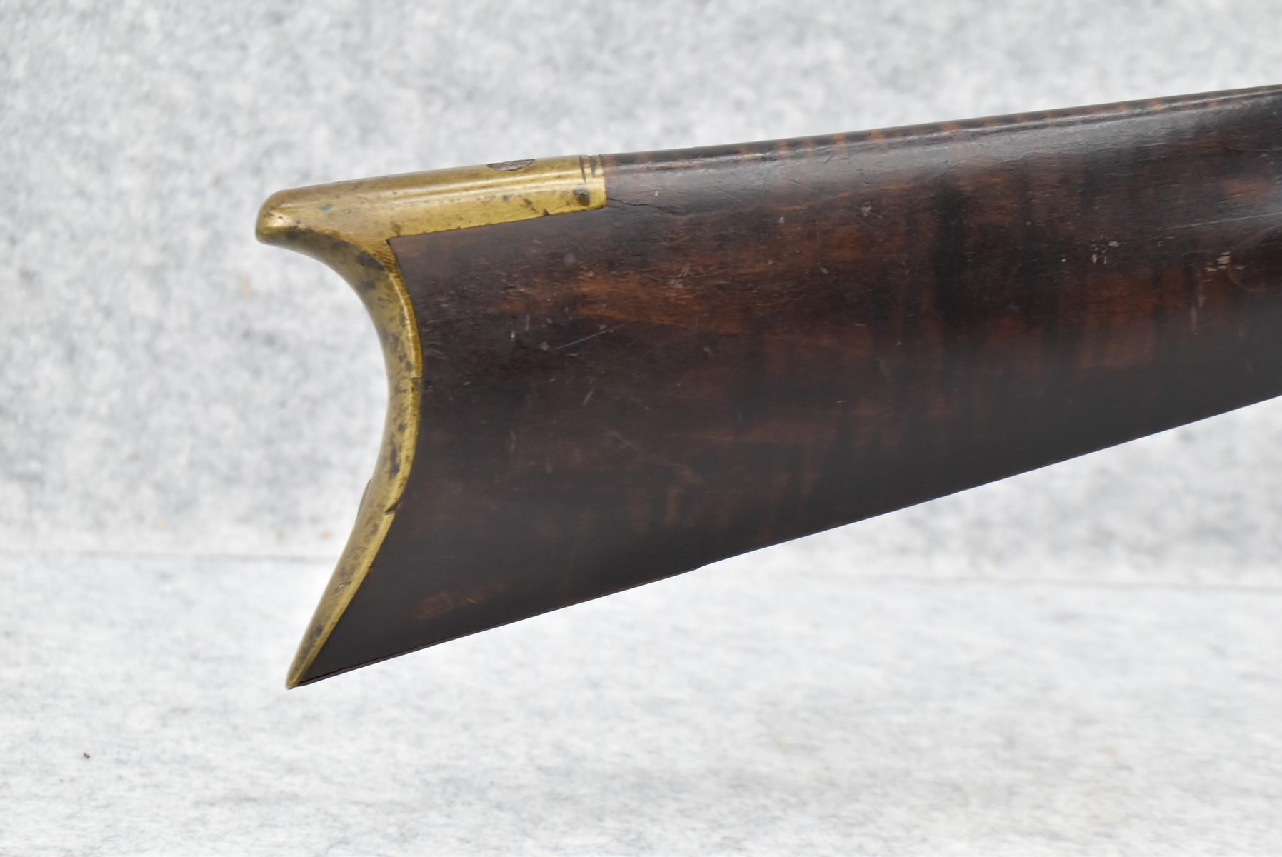 282.        Unsigned 50 Cal. Black Powder Percussion Early Kentucky Rifle – w/42” Octagon Barrel w/Front & Rear Sights – Gray Finish – w/Straight Grip Full Length Wood Stock w/Crescent Metal Butt Plate & Brass Mountings – w/Ram Rod w/Broken Tip