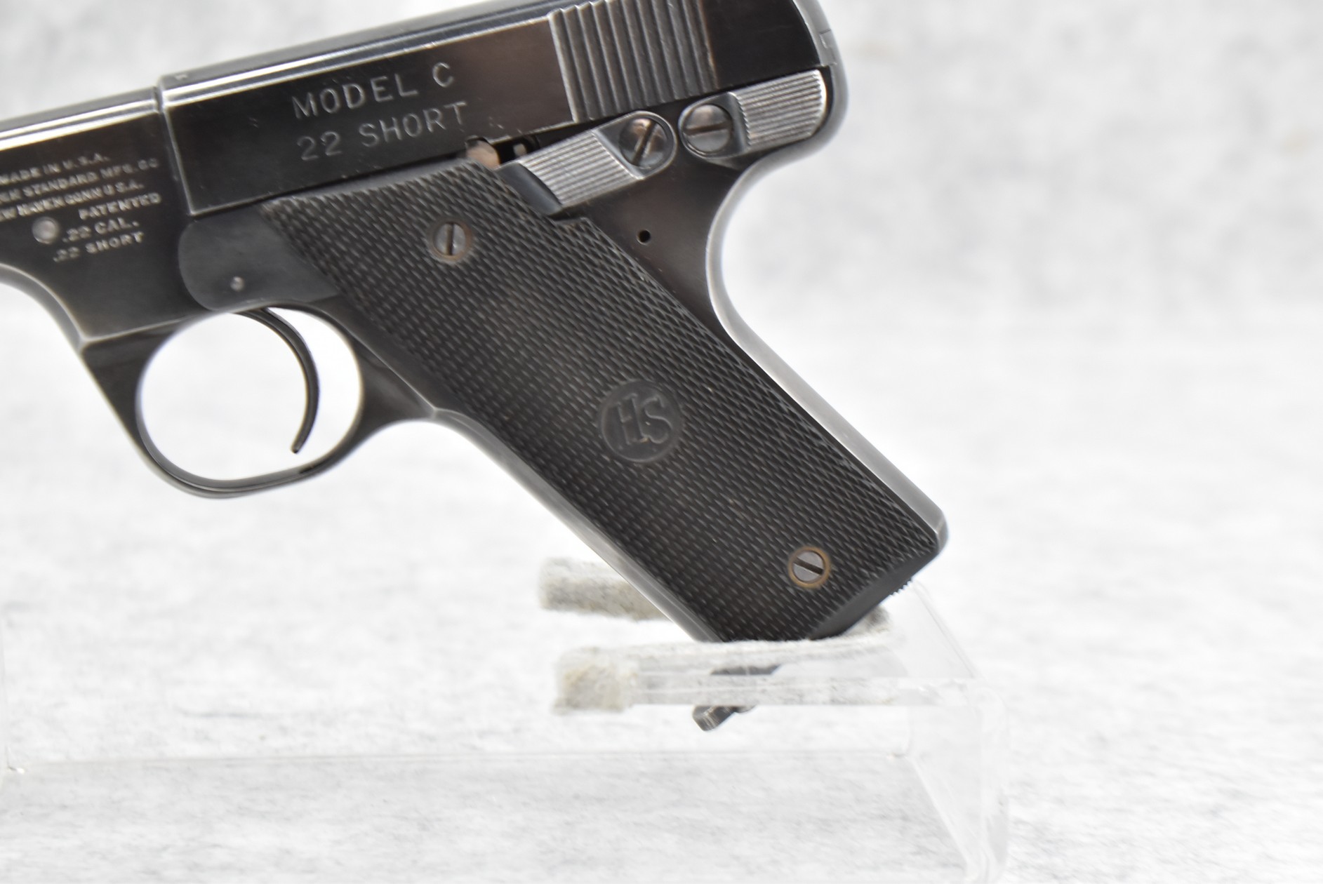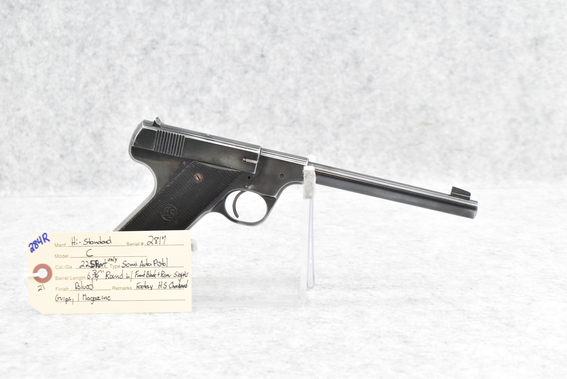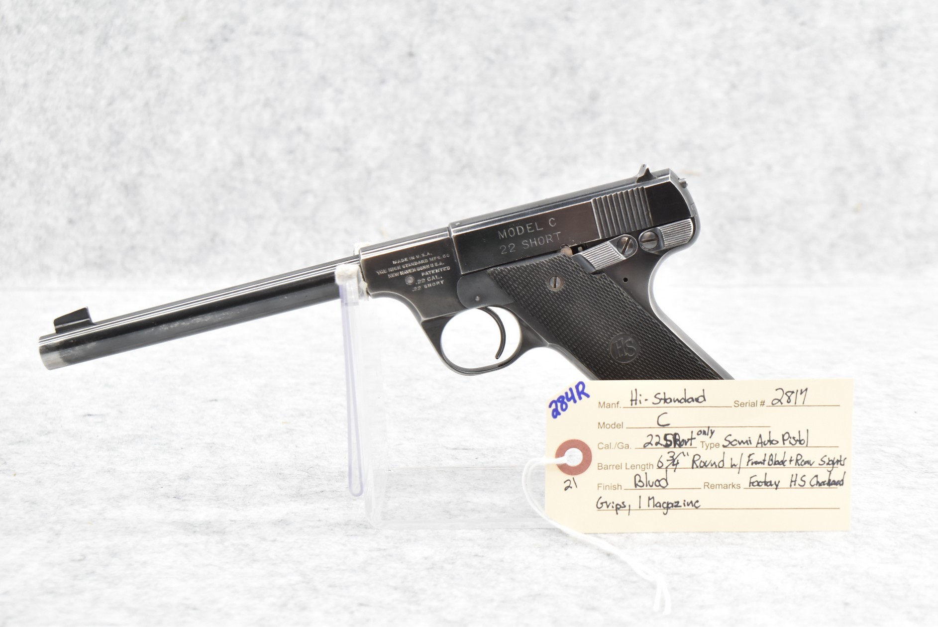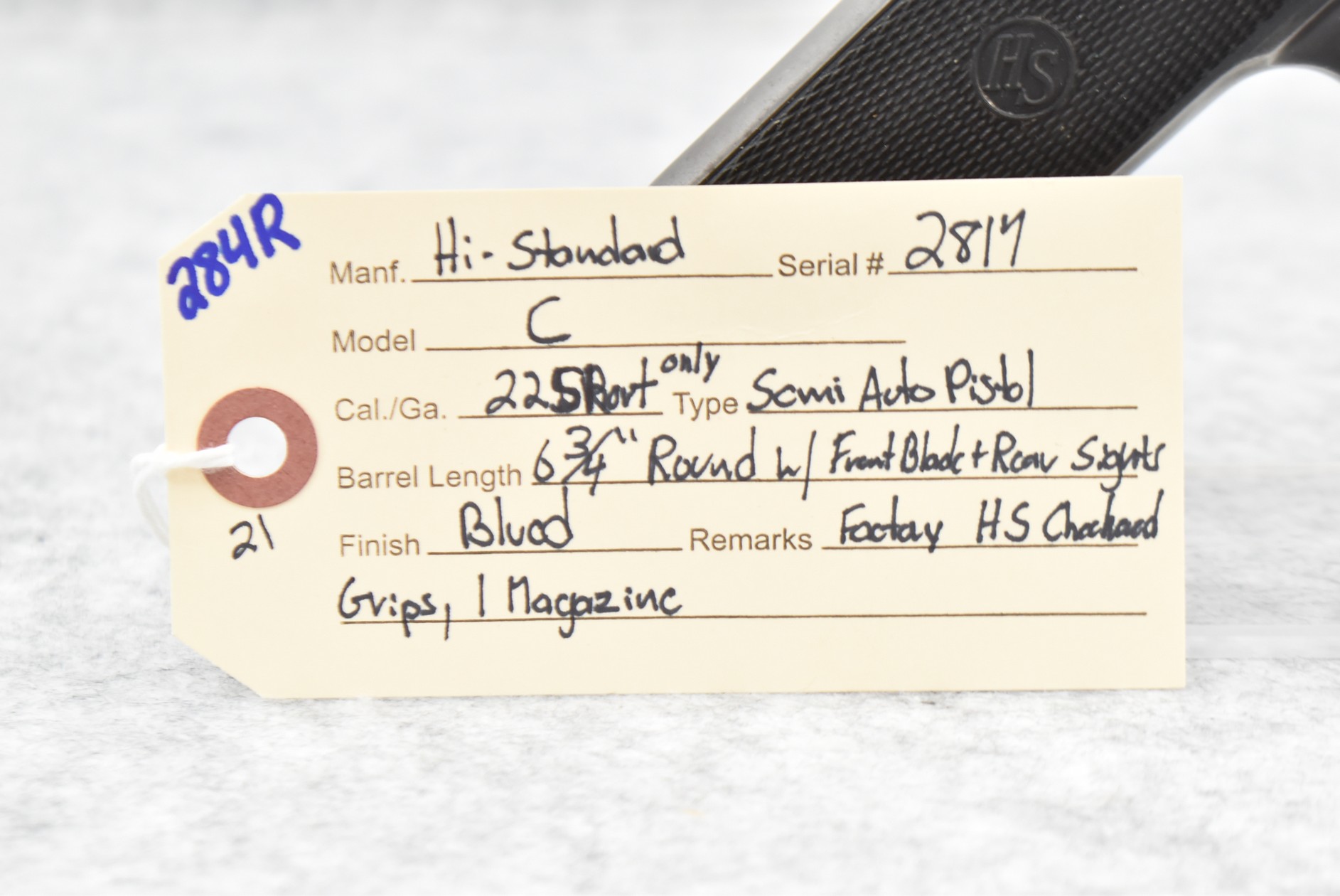 284R. Hi-Standard – Mod. C – 22 Short Only Cal. Semi-Auto Pistol – w /6 ¾” Round Barrel w/Front Blade & Rear Sights – Blued Finish – w/Factory HS Checkered Grips – w/Magazine