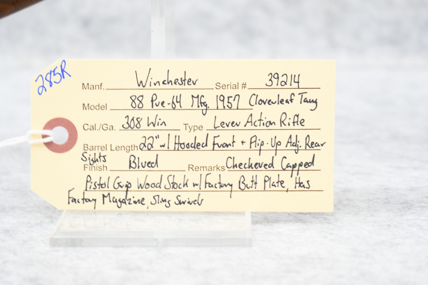 285R. Winchester – Mod. 88 Cloverleaf Tang (Pre-64) – 308 Win. Cal. Lever Action Rifle – w/22” Barrel w/Hooded Front & Flip-Up Adj. Rear Sights – Blued Finish – w/Checkered Capped Pistol Grip Wood Stock w/Factory Butt Plate – w/Factory Detachable Magazine – w/Sling Swivels – Mfg. 1957