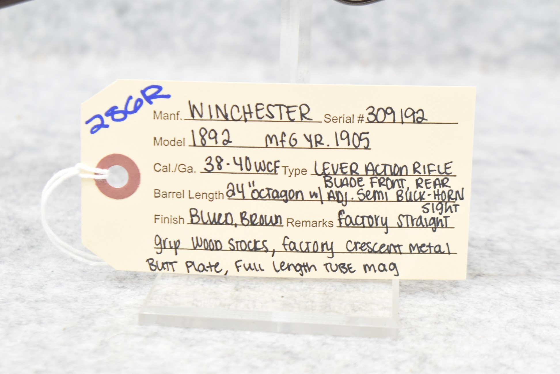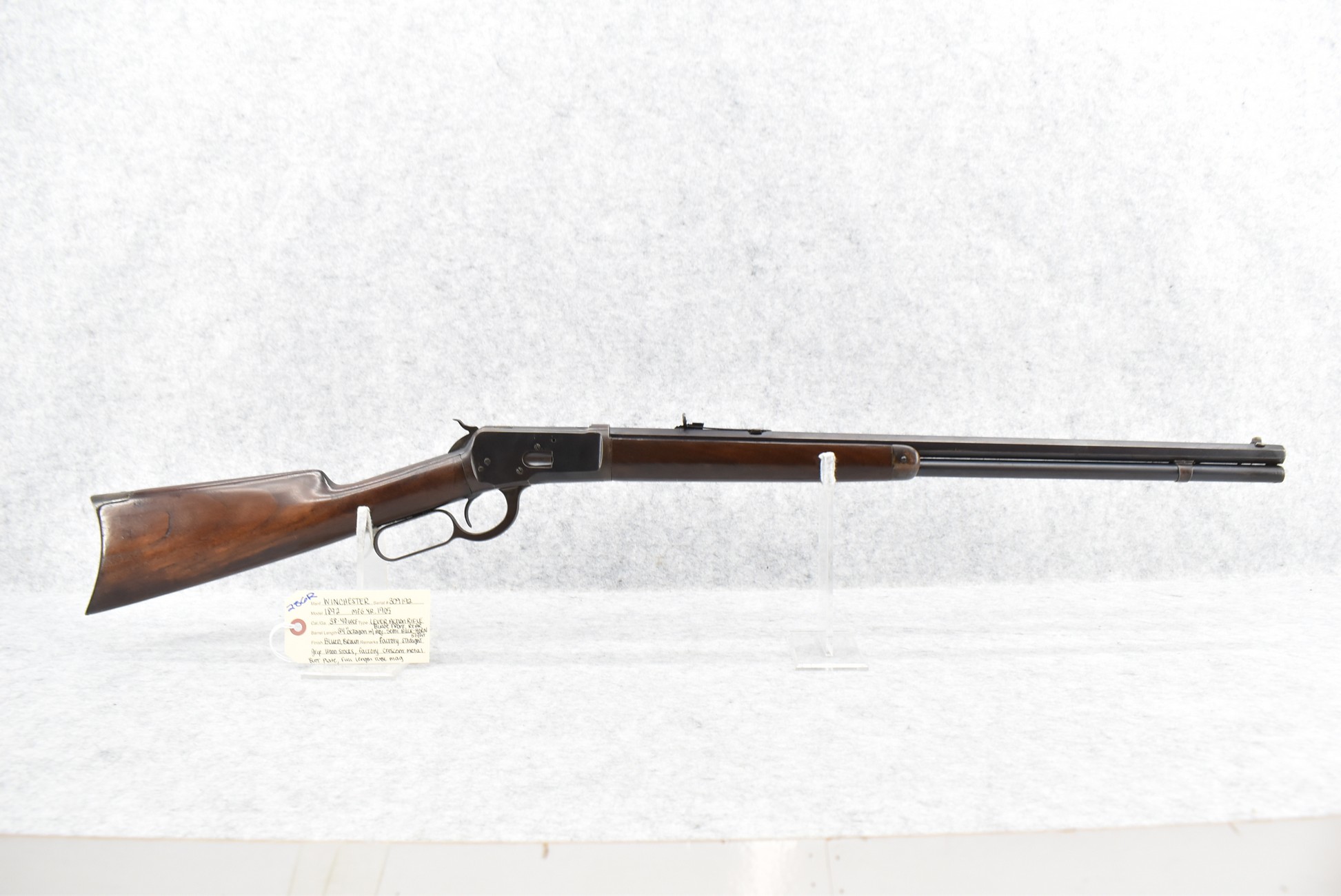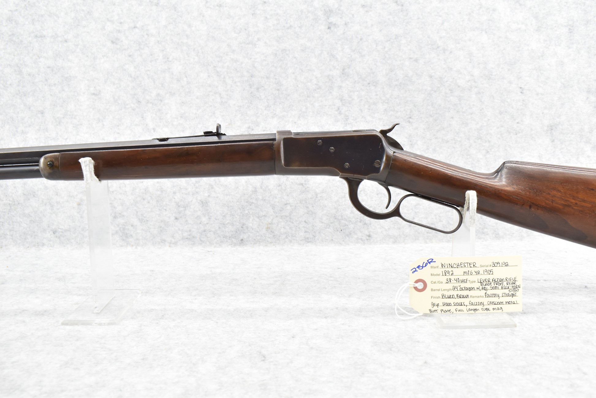 286R. Winchester – Mod. 1892 – 38-40 WCF Cal. Lever Action Rifle – w/24” Octagon Barrel w/Blade Front and Adjustable Rear Semi-Buckhorn Sights – Blued and Brown Finish – w/Factory Straight Grip Wood Stocks w/Factory Crescent Metal Butt Plate – w/Full Length Tubular Magazine – Manufactured 1905