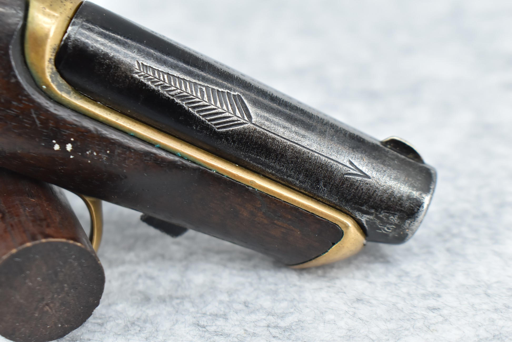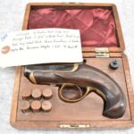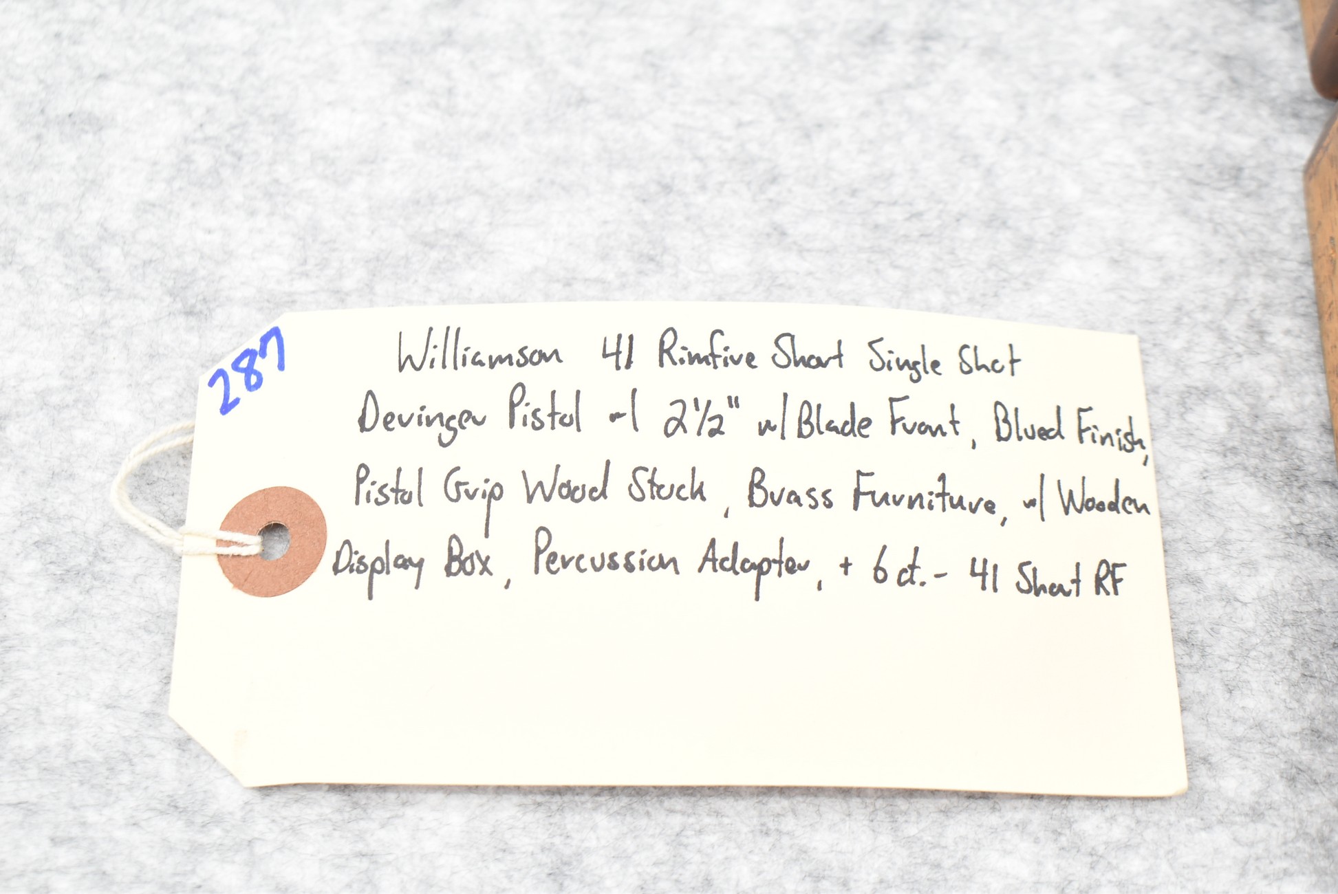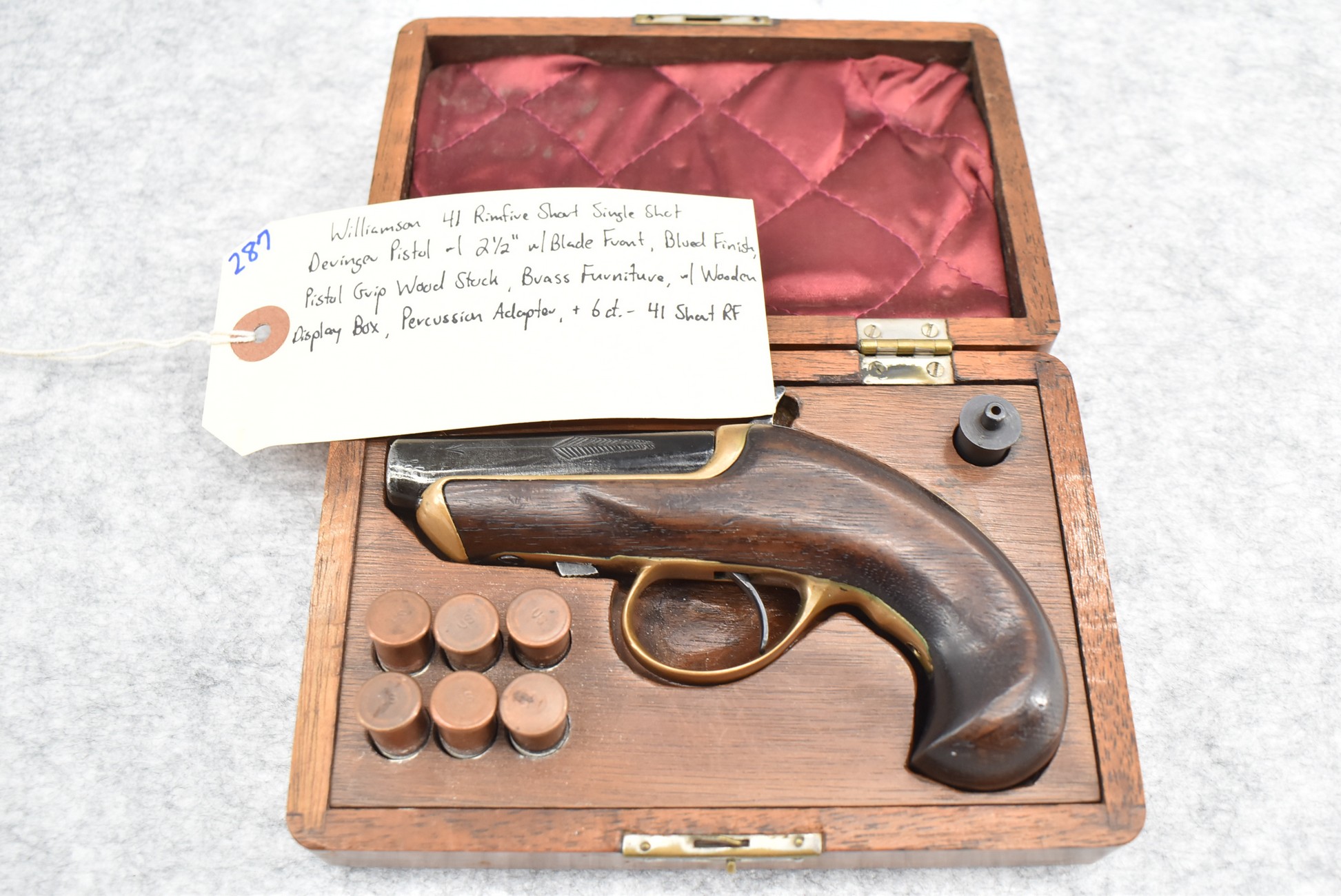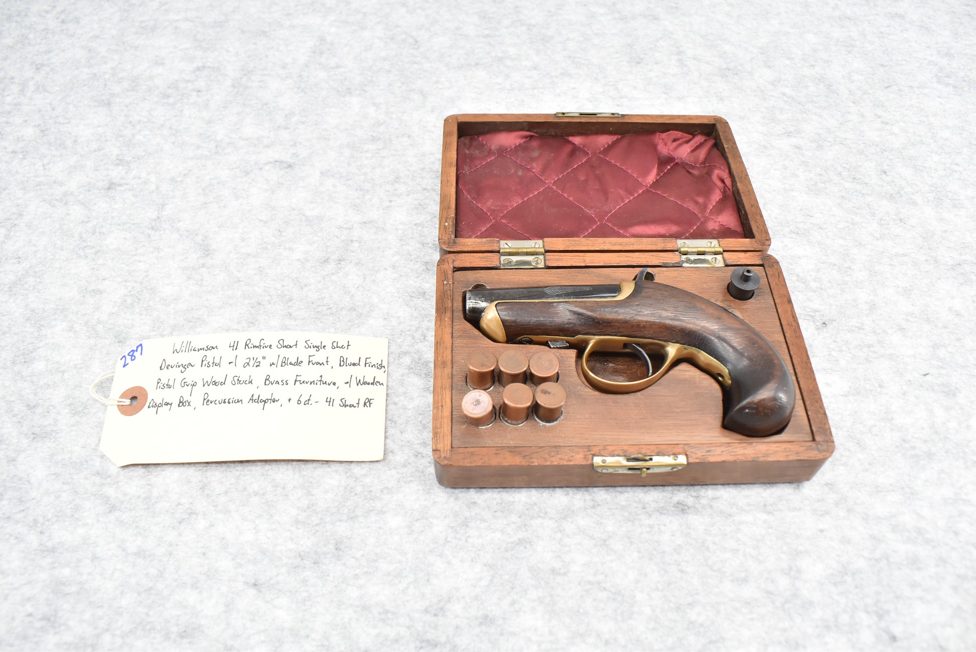 287. Williamson – 41 RF Short Cal. Single Shot Philadelphia Style Deringer Pistol – w/2 ½” Barrel w/Blade Front – Blued Finish – w/Pistol Grip Wood Stock w/Brass Furniture – w/Wooden Display Box, Percussion Adapter & 6ct. of 41 Short RF Ammo