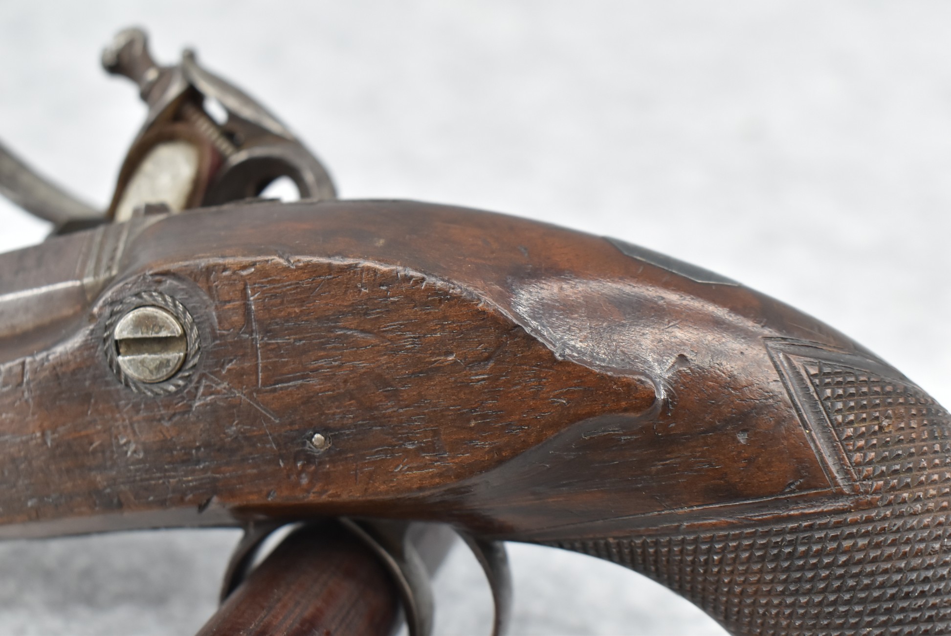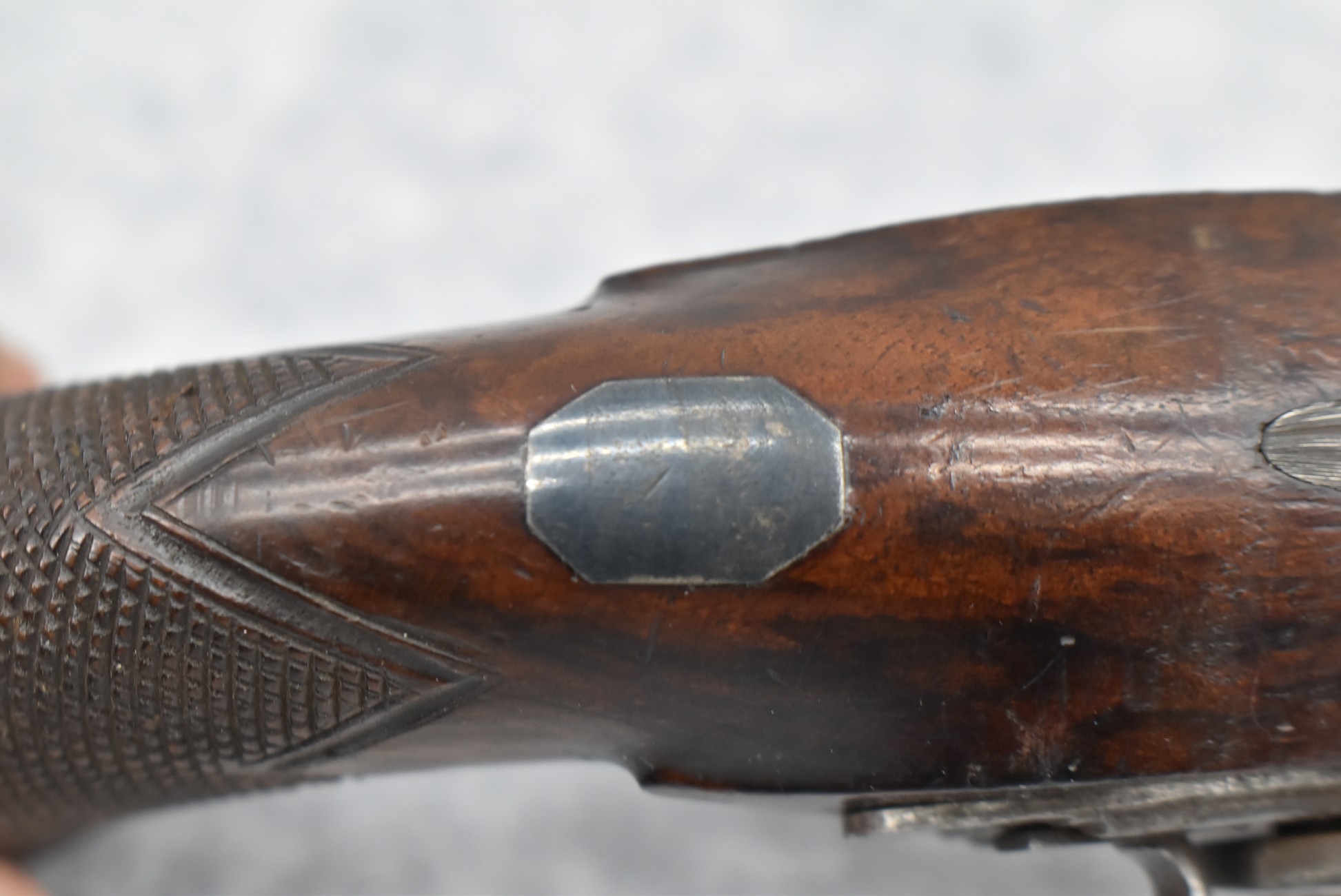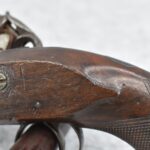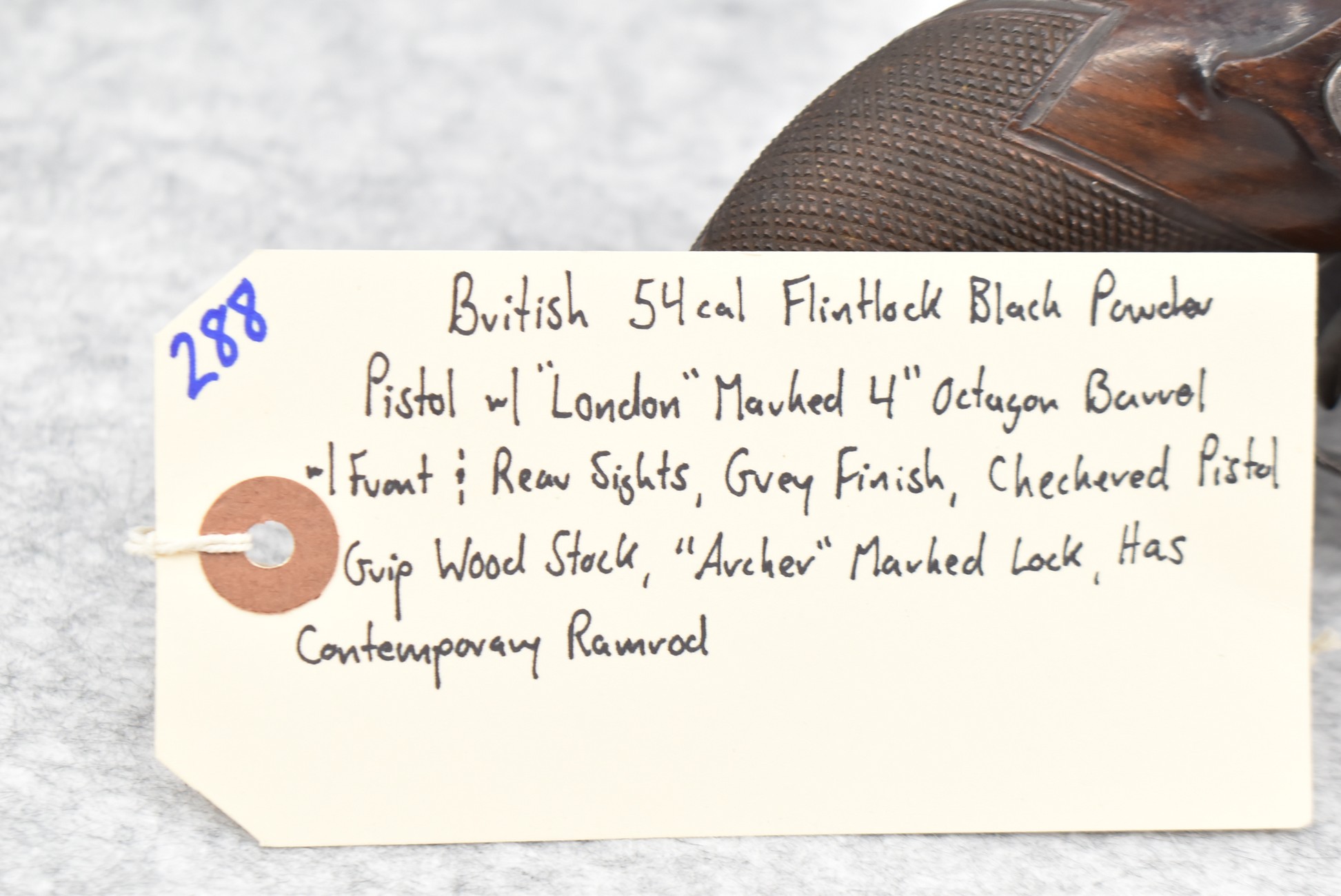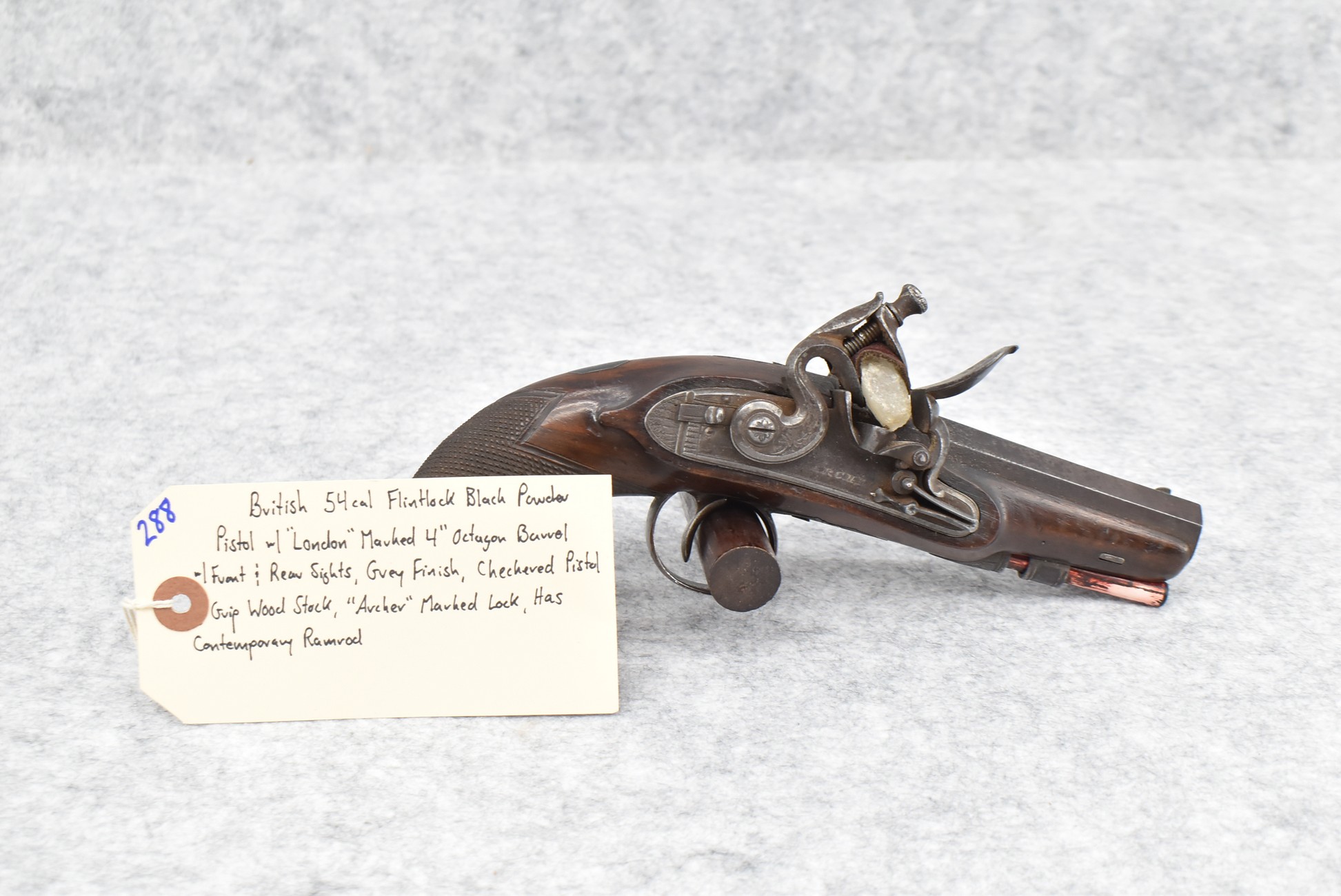 288.        British – 54 Cal. Flintlock Black Powder Pistol – w/4” “London” Marked Octagon Barrel w/Front & Rear Sights – Gray Finish – w/Checkered Pistol Grip Wood Stock – w/“Archer” Marked Lock – w/Contemporary Ram Rod