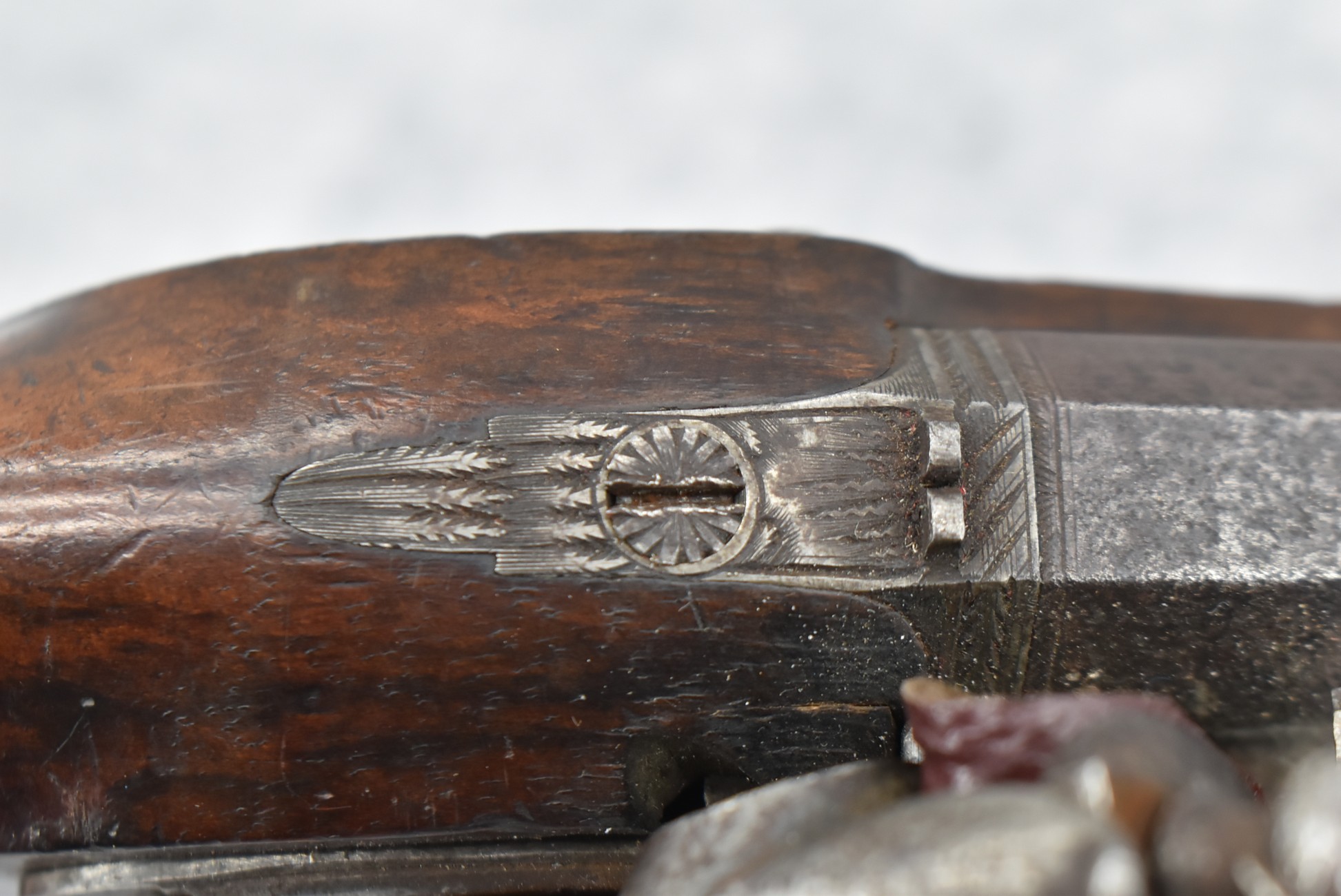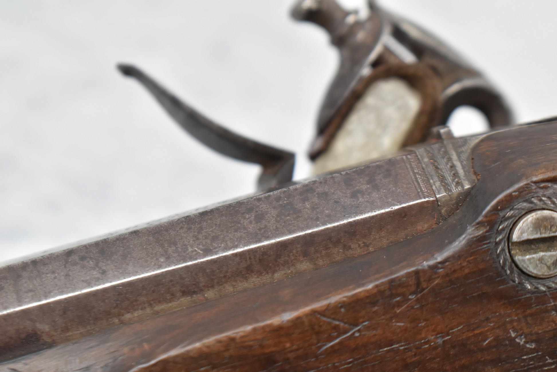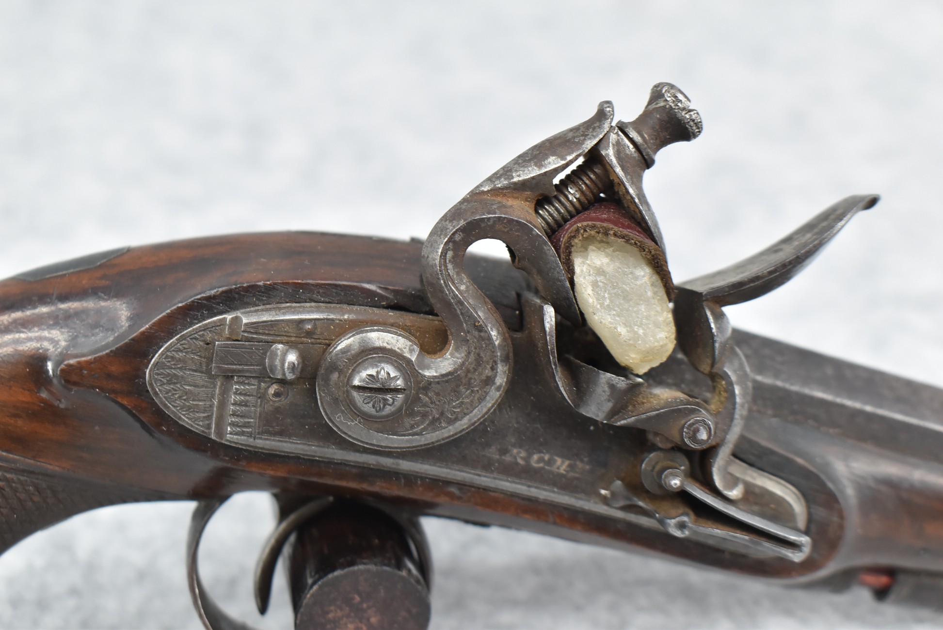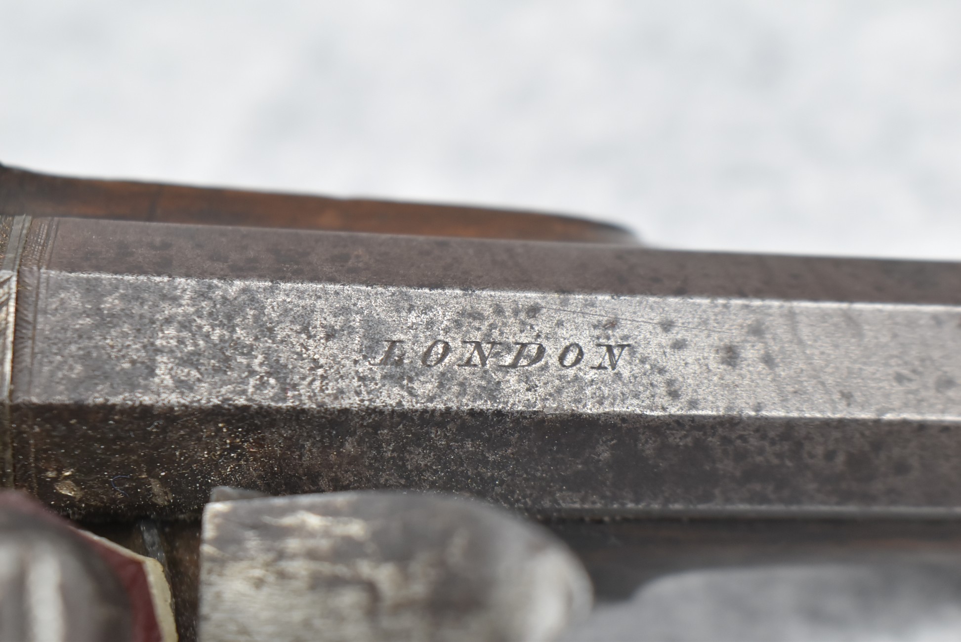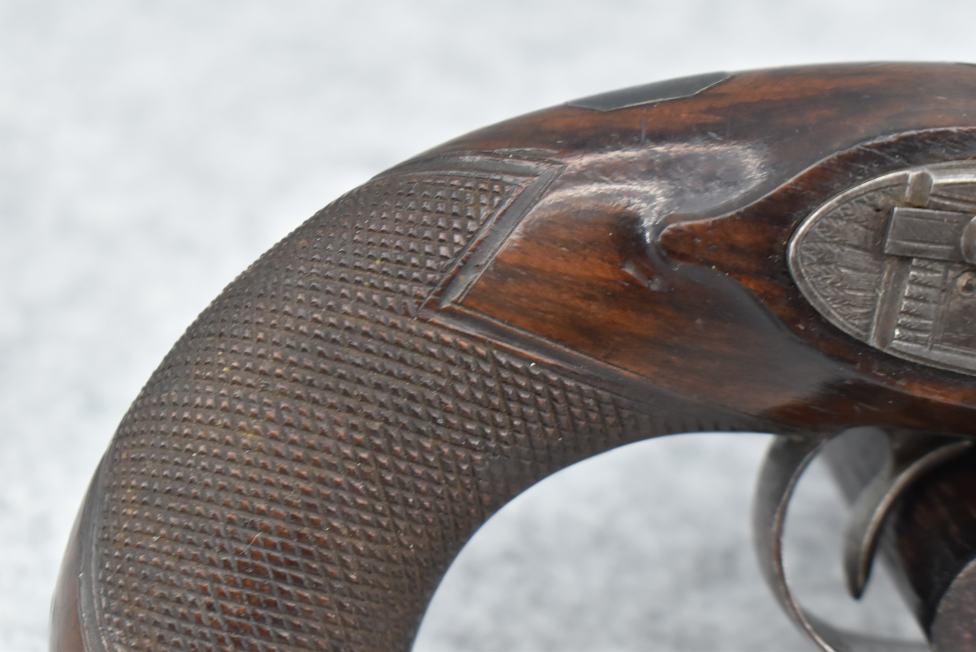 288.        British – 54 Cal. Flintlock Black Powder Pistol – w/4” “London” Marked Octagon Barrel w/Front & Rear Sights – Gray Finish – w/Checkered Pistol Grip Wood Stock – w/“Archer” Marked Lock – w/Contemporary Ram Rod